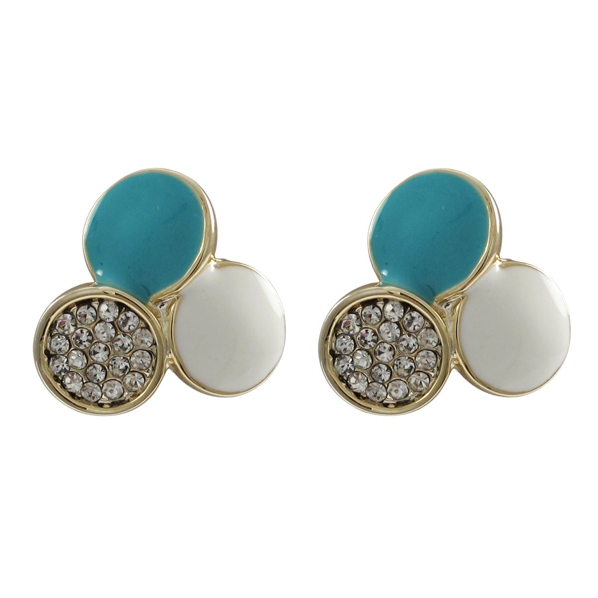 Turquoise And White Enamel With White Crystals, Three 10Mm Circles Design, Gold Plated Brass Post Earrings, 0.68