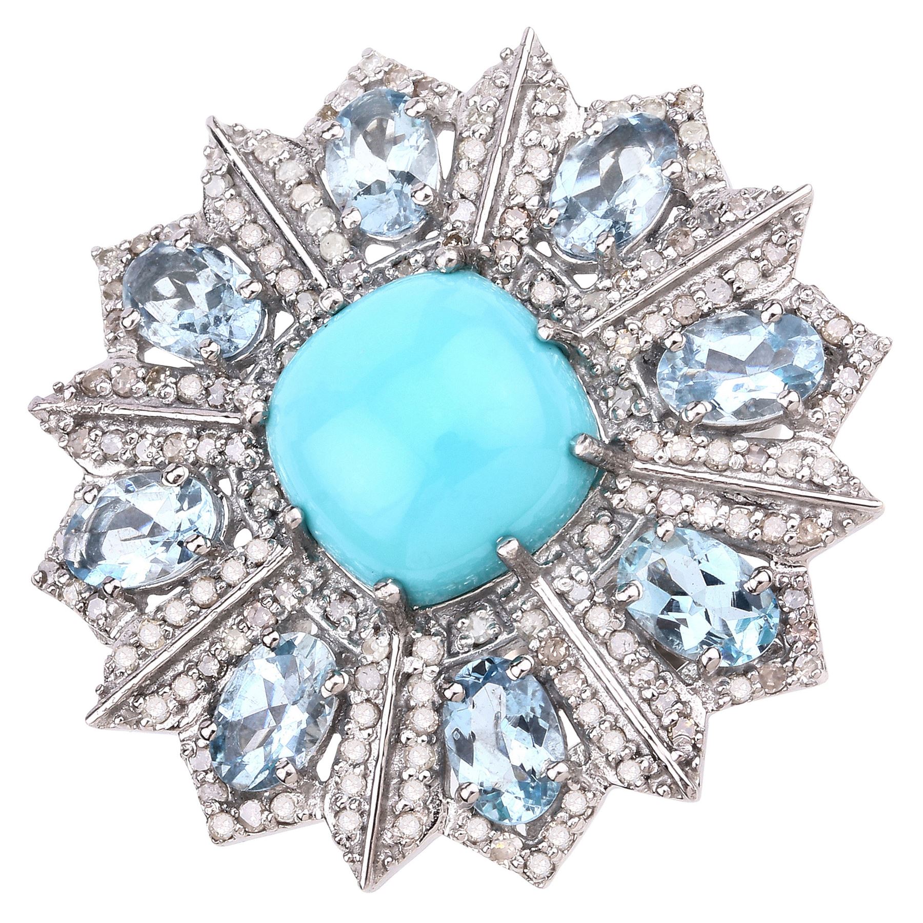 Q8417/23 - OAN TITLE DESCRIPTION: Turquoise, Aquamarine, and Diamond Ring DESCRIPTION DETAIL: A beautiful Sterling Silver Ring set centrally with a square Turquoise cabochon surrounded by round brilliant cut natural Diamonds and oval shaped Aquamarine gemstones. OVERALL CONDITION: Excellent, New STONE 1: Turquoise Shape: Square Shaped, Cabochon Measurements: 11 mm Color: Blue STONE 2: Aquamarine (8) Shape: Oval, Faceted Weight: 5x3mm each Color: Light Blue DIAMONDS: Natural Shape: Round Brilliant Cut (144) Measurements: 1.1 mm each Color & Clarity: Commercial grade METAL: Sterling Silver with Black Rhodium WEIGHT: 11.84 Grams SIZE: 7.00 US The consignor’s stated retail price is $ 1,456.00 THIS ITEM IS FROM AN ORDERED LIQUIDATION OF A MAJOR JEWELRY MANUFACTURER'S OVER STOCKED INVENTORY. THIS ITEM WAS PASSED IN A PRIOR AUCTION AND THE RESERVE HAS BEEN LOWERED Please inquire about sizing if needed, and allow an additional 10 days for shipping if we resize it. PRIOR TO BIDDING READ THE DESCRIPTION, TERMS, AND CONDITIONS CAREFULLY This description and condition report is provided for your convenience based on the information provided by the consignor. CAA is not responsible for any discrepancies between this information and other opinions. Buyers Premium: 18% Shipping Billed Separately Payment Due in 7 days All items shipped to registered address - NO EXCEPTIONS Q8417/23 - OAN