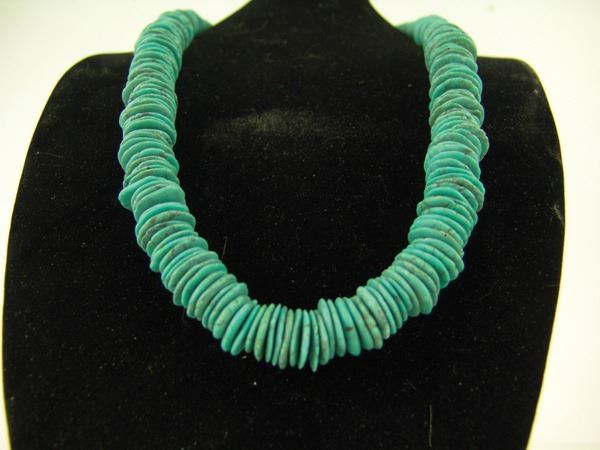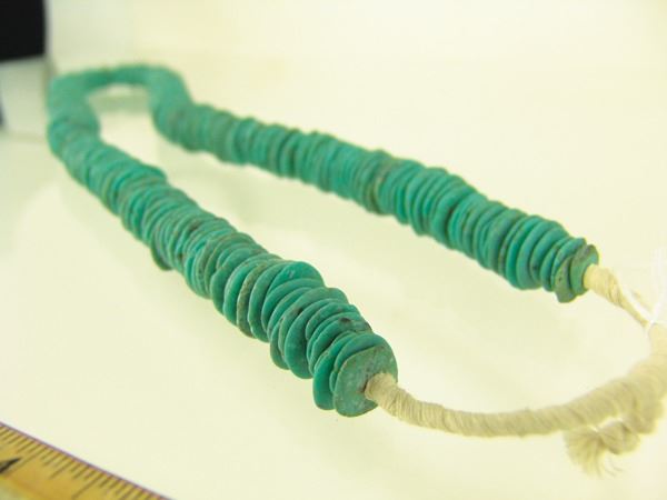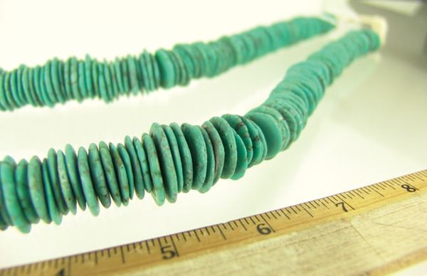 Wonderful strand of hand cut, shaped, and drilled disk beads made from beautiful, natural Tibetan turquoise. Very good condition, between 350-400 beads in all.Mid/Late 1900s32"