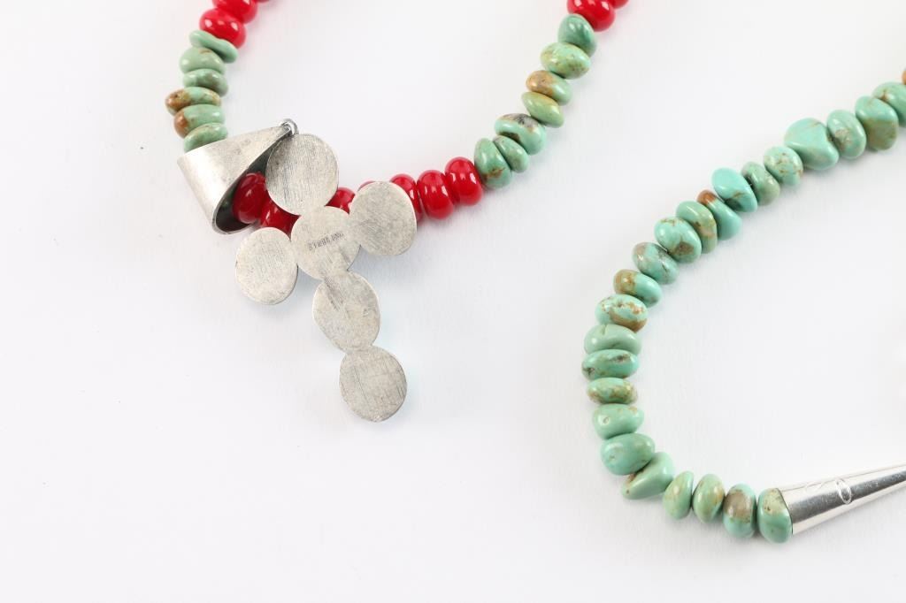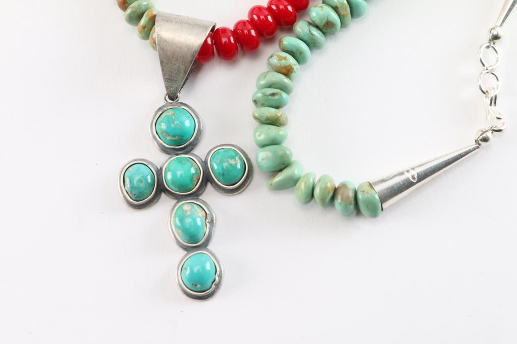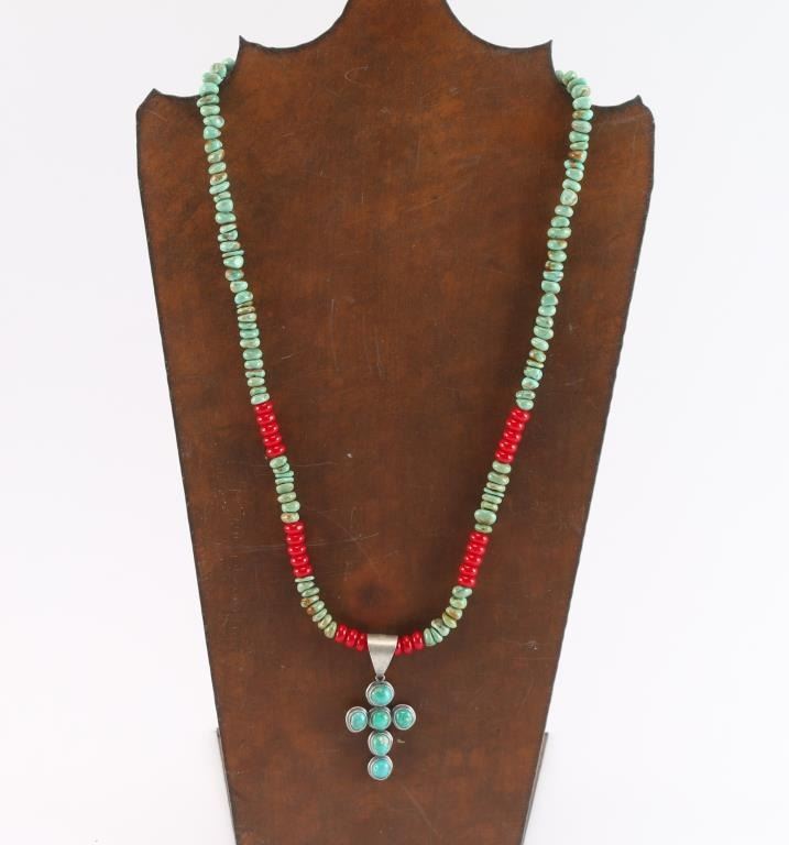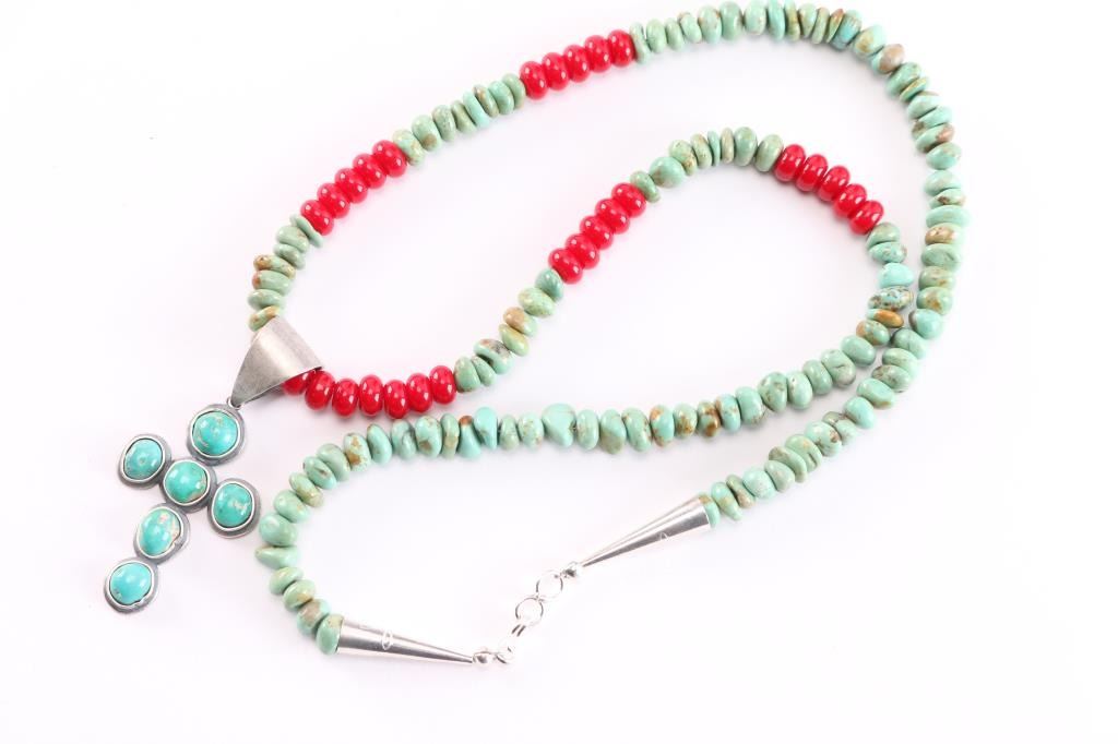 Turquoise Beads With Red Glass Accents With Cross Pendant All Turquoise Set In Sterling Silver