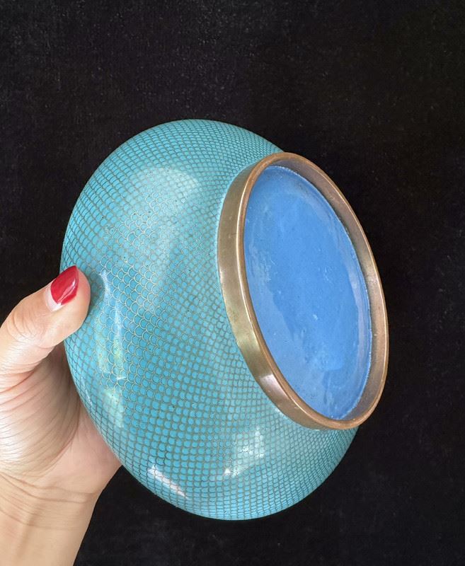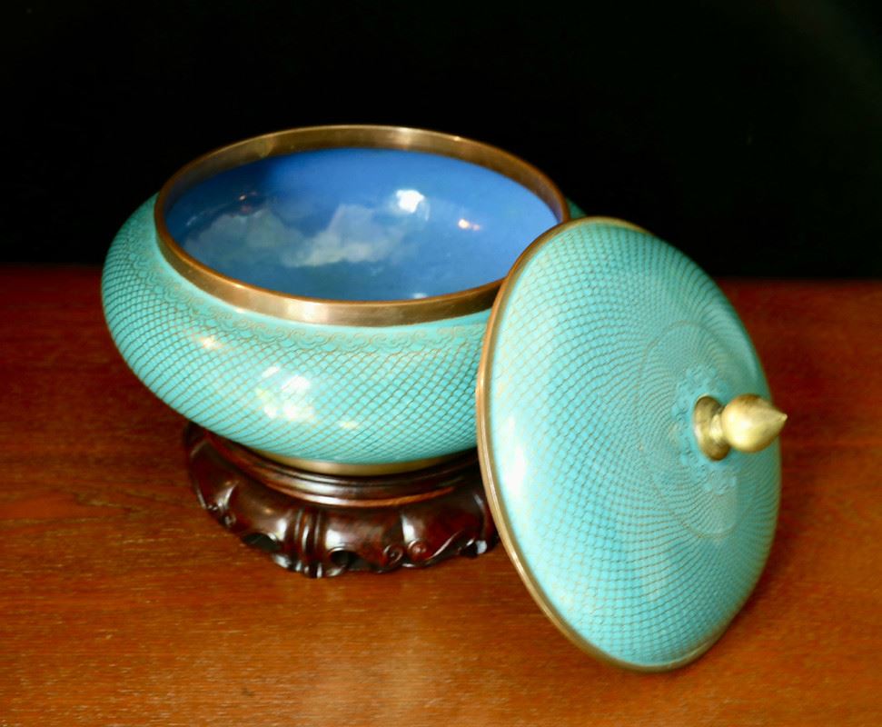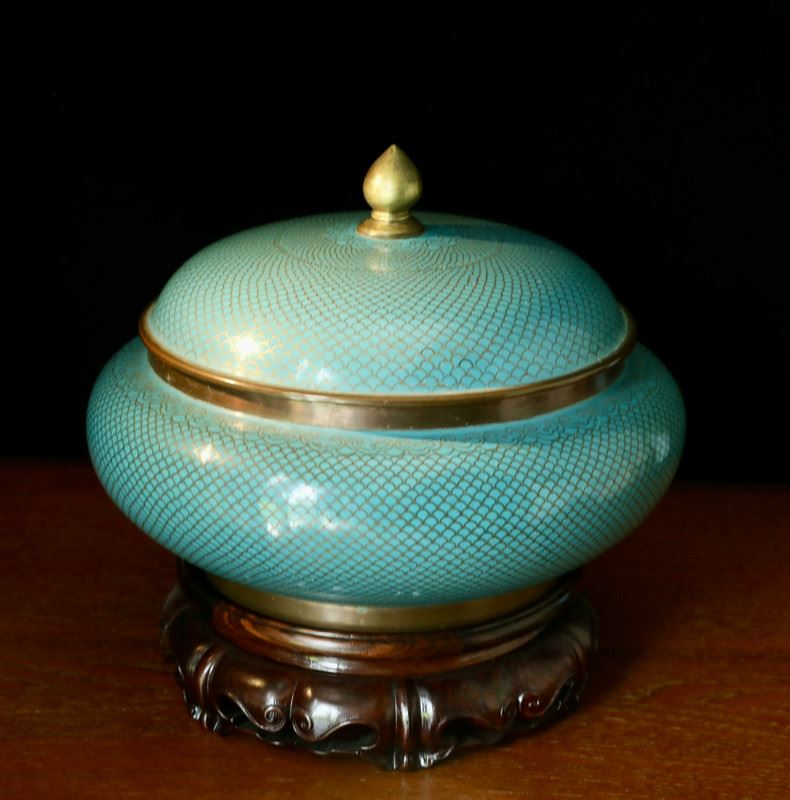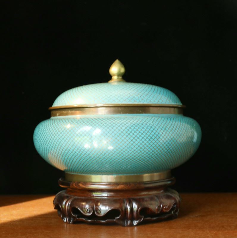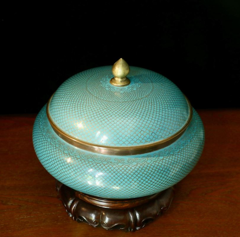 This cloisonné covered jar is crafted on a copper base with a turquoise blue enamel ground, delicately adorned with fine fish-roe patterns. The vessel features a full, rounded form with gilt-bronze rims and a lotus-shaped finial lid, exuding elegance and refinement. Resting on a carved wooden stand, it enhances its stately presence. With its pure color and exquisite craftsmanship, this piece is a distinguished example of cloisonné art, ideal for both display and collection.