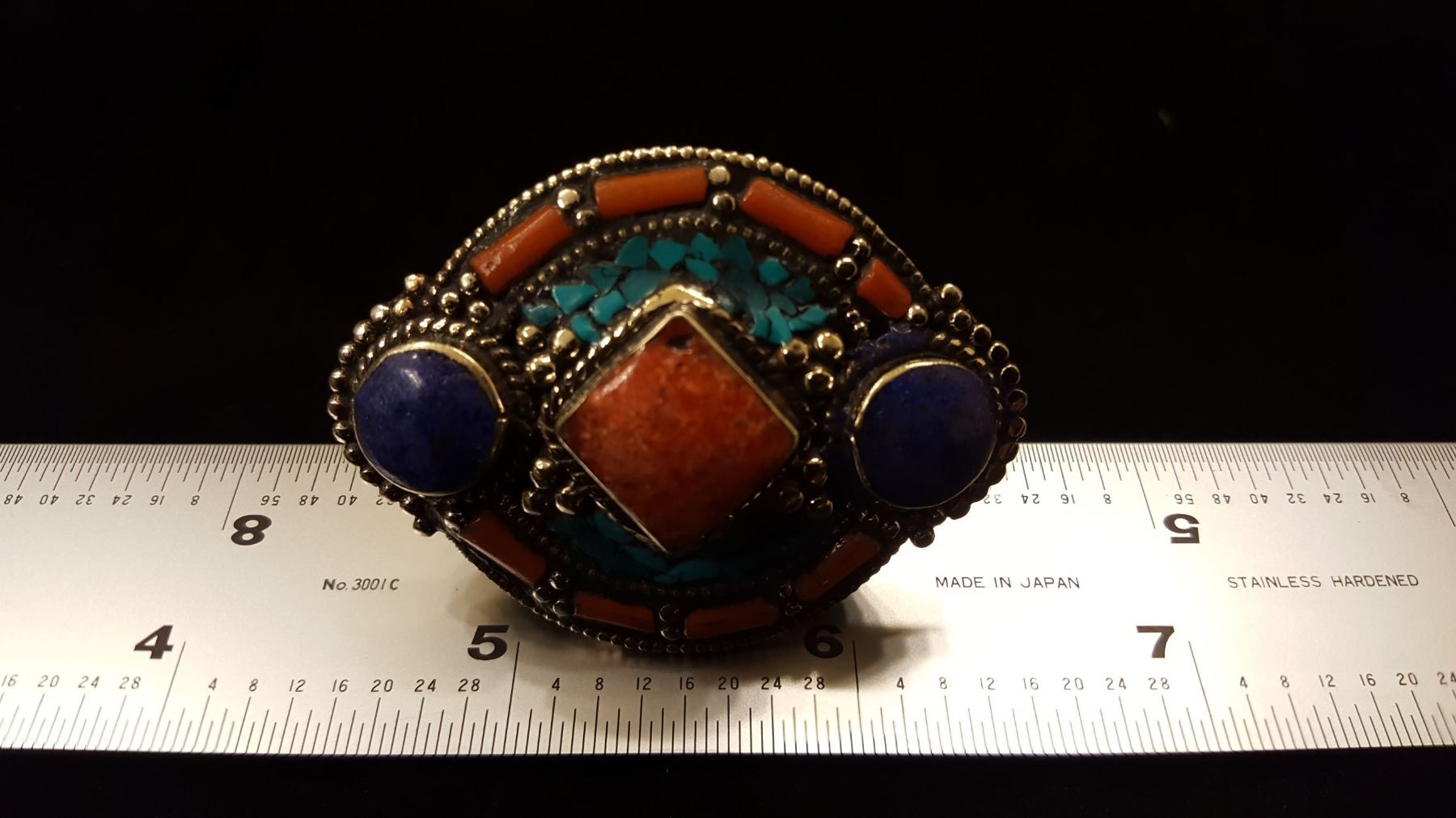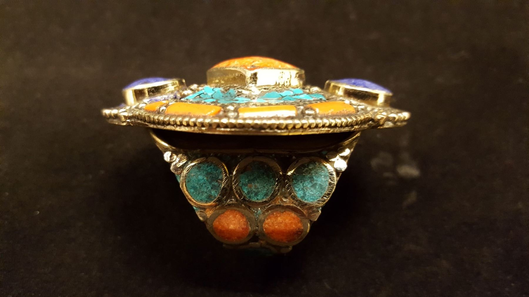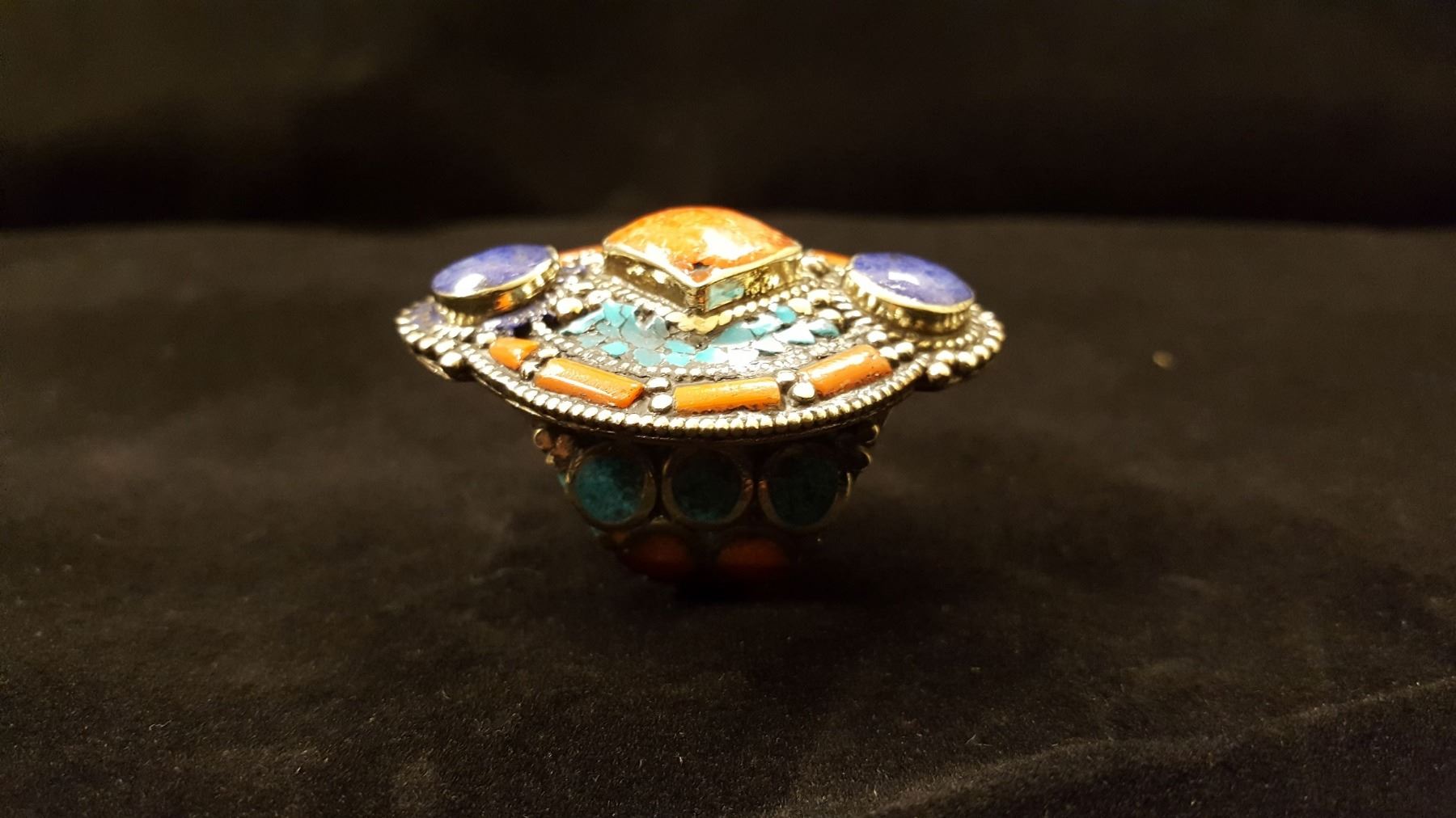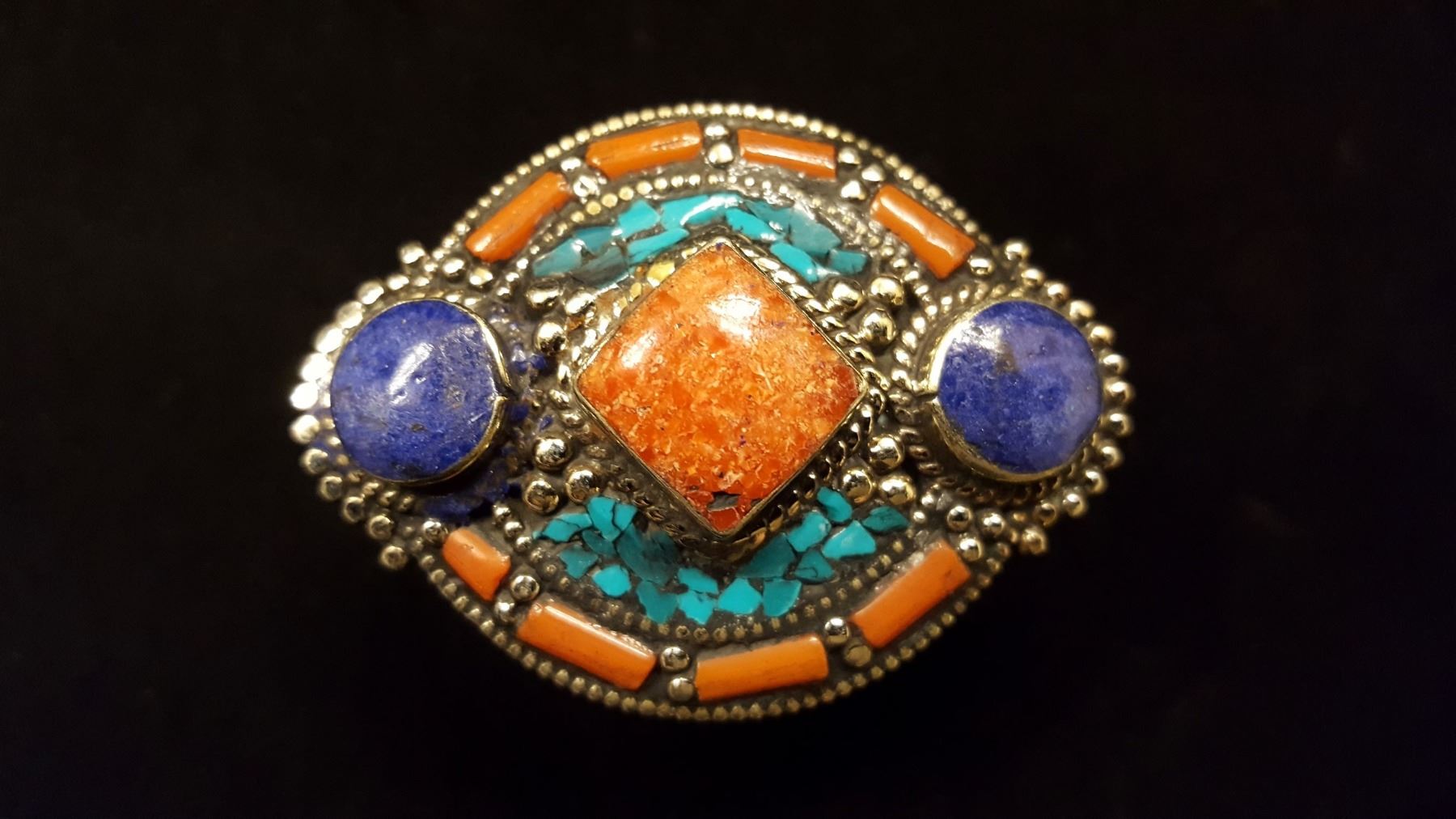 Gorgeous turquoise blue lapis lazuli red coral ring. Gems mounted in elaborately designed .925 sterling silver overlay. Total gram weight is 37.20 grams. Size 8 Adjustable.