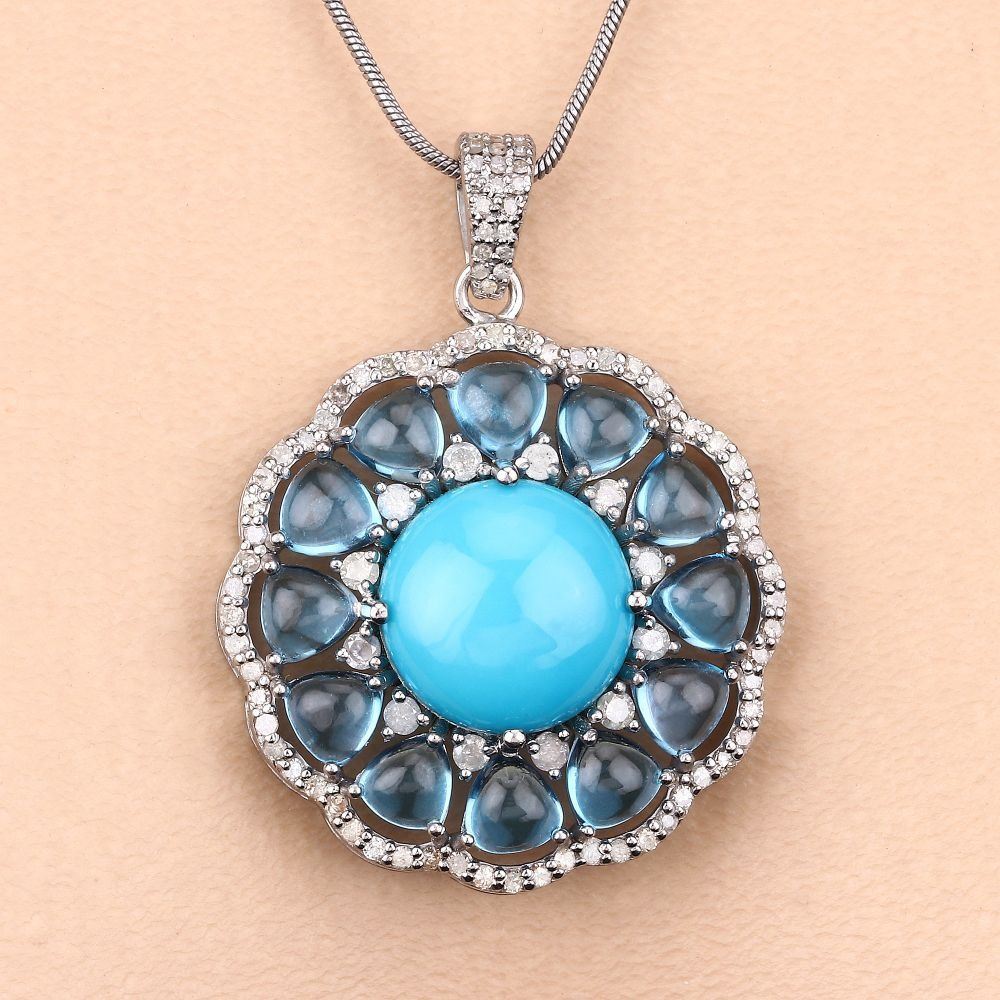 DESCRIPTION DETAIL: Genuine Blue Topaz, Genuine Turquoise and Earth-Mined Diamond Necklace