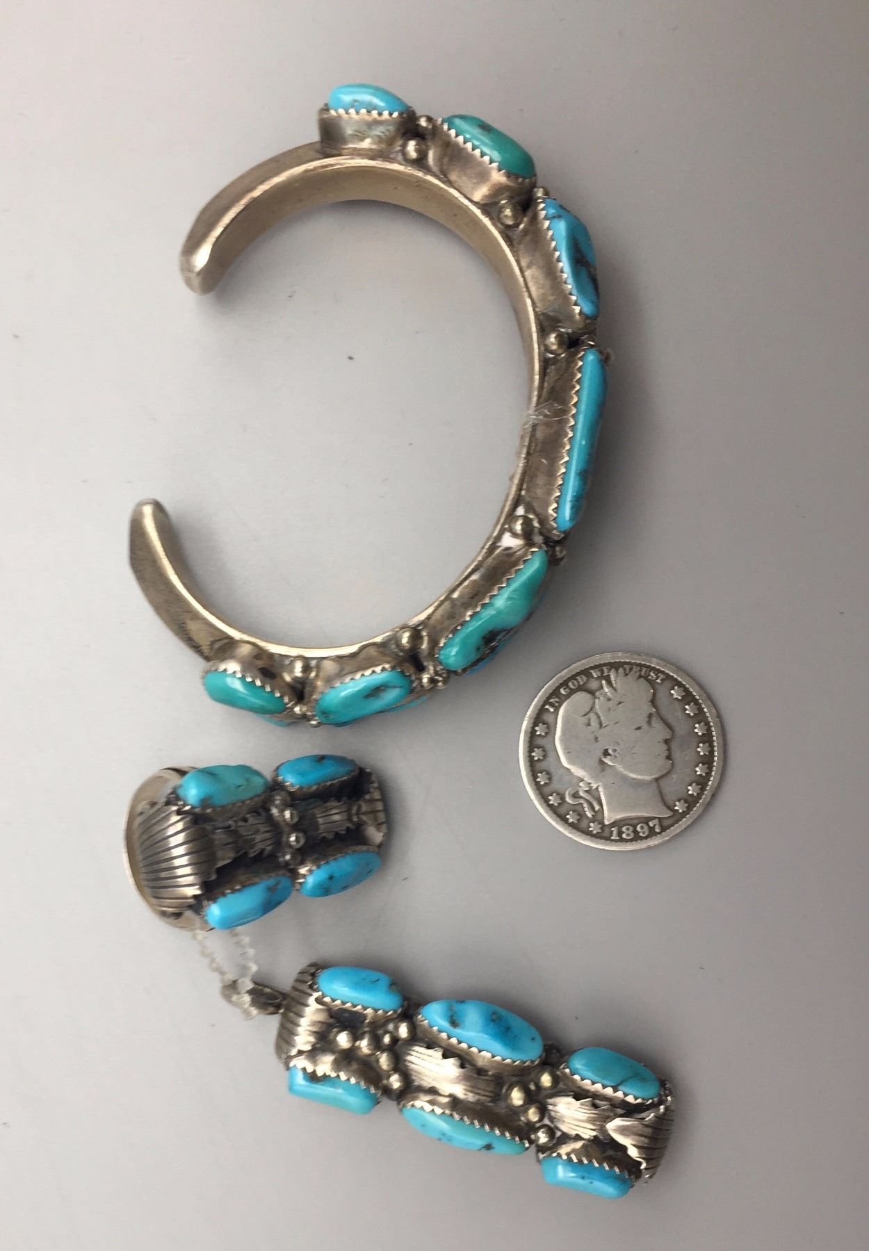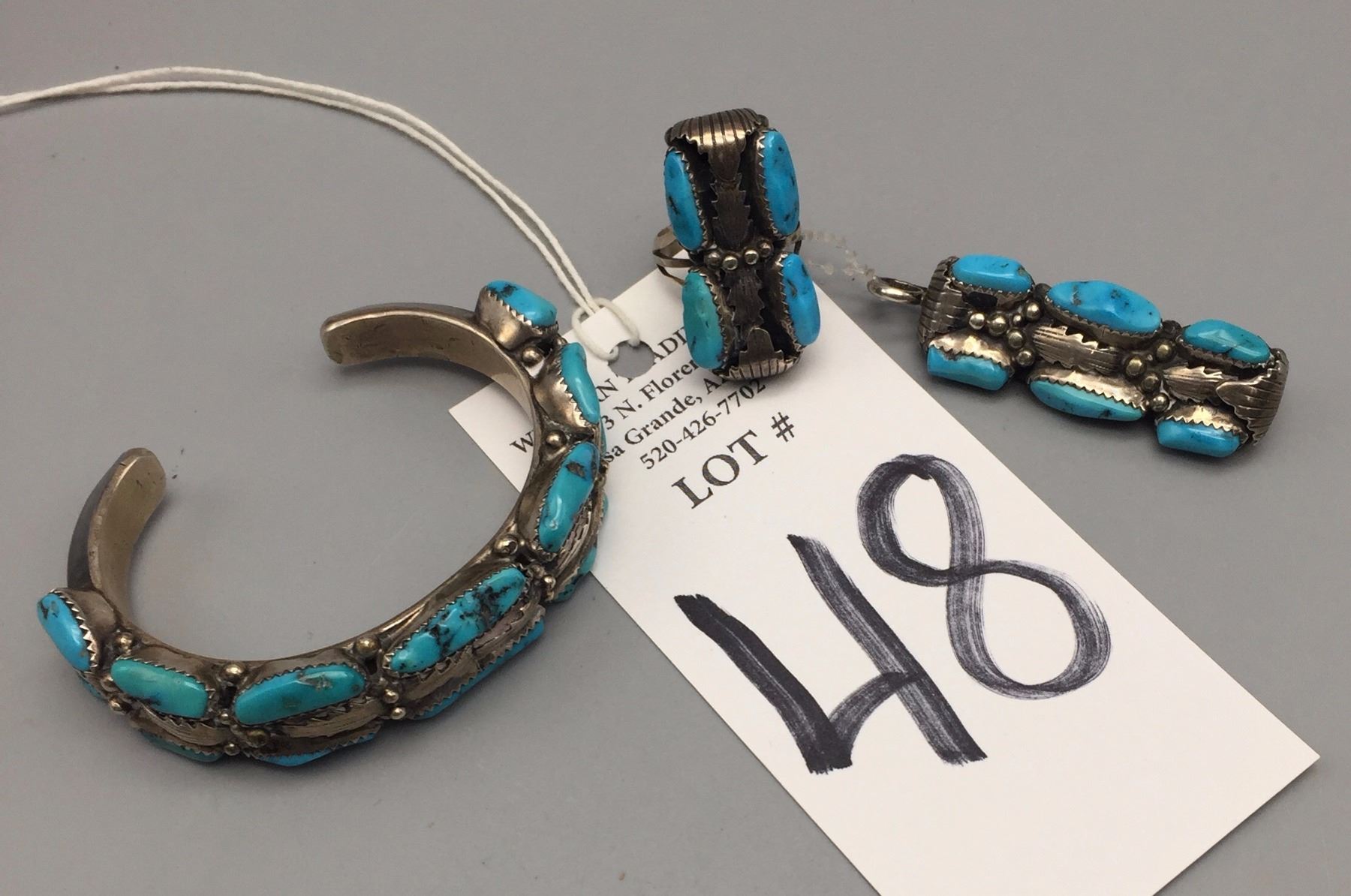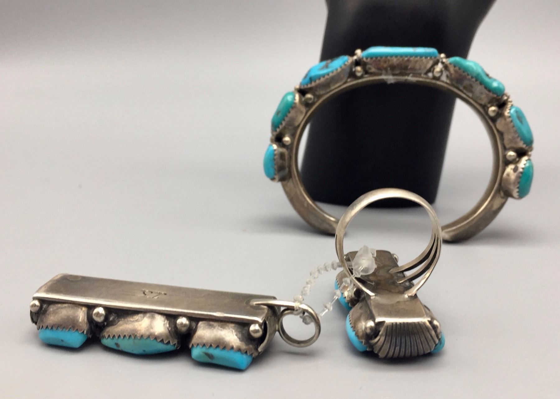 Maker: Hallmarked J.S., mark of Jackie Singer (Navajo). Approx. Age: Circa 1980s or so. Size: Ring size is 7.5. Inside circumference of bracelet is 5” plus it has a 1” opening (making it fit a 6” wrist). Bracelet is 5/8” at it’s widest point. Pendant is 3/4” wide x 1 3/4” long. Lot weighs 116.2 g. Additional Info: Nice turquoise stones set in sterling silver. Condition: Good, normal wear expected. Please look closely at the pictures - they are an important part of our description. Shipping: There will be a $5 handling / packaging fee for shipping this lot. The actual cost of postage will be added on top of that.