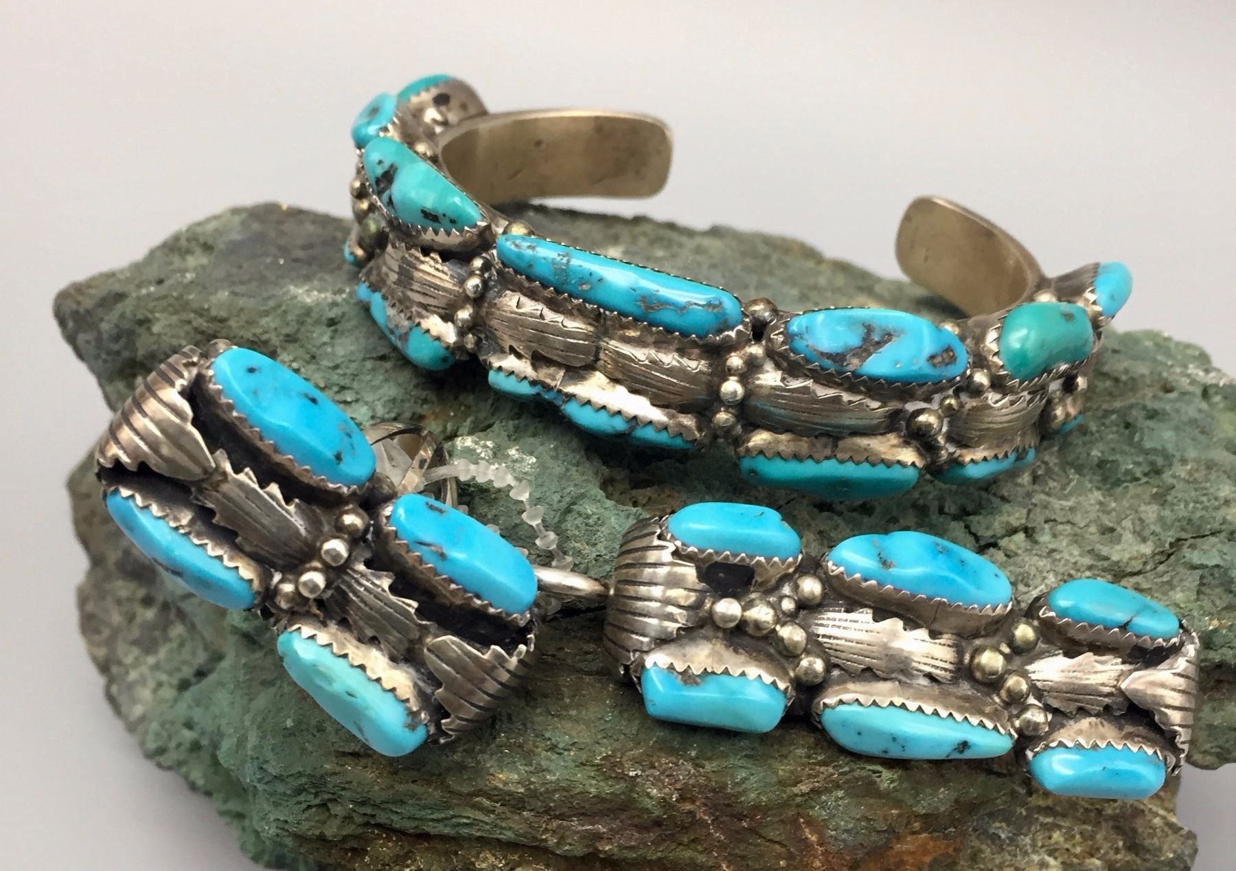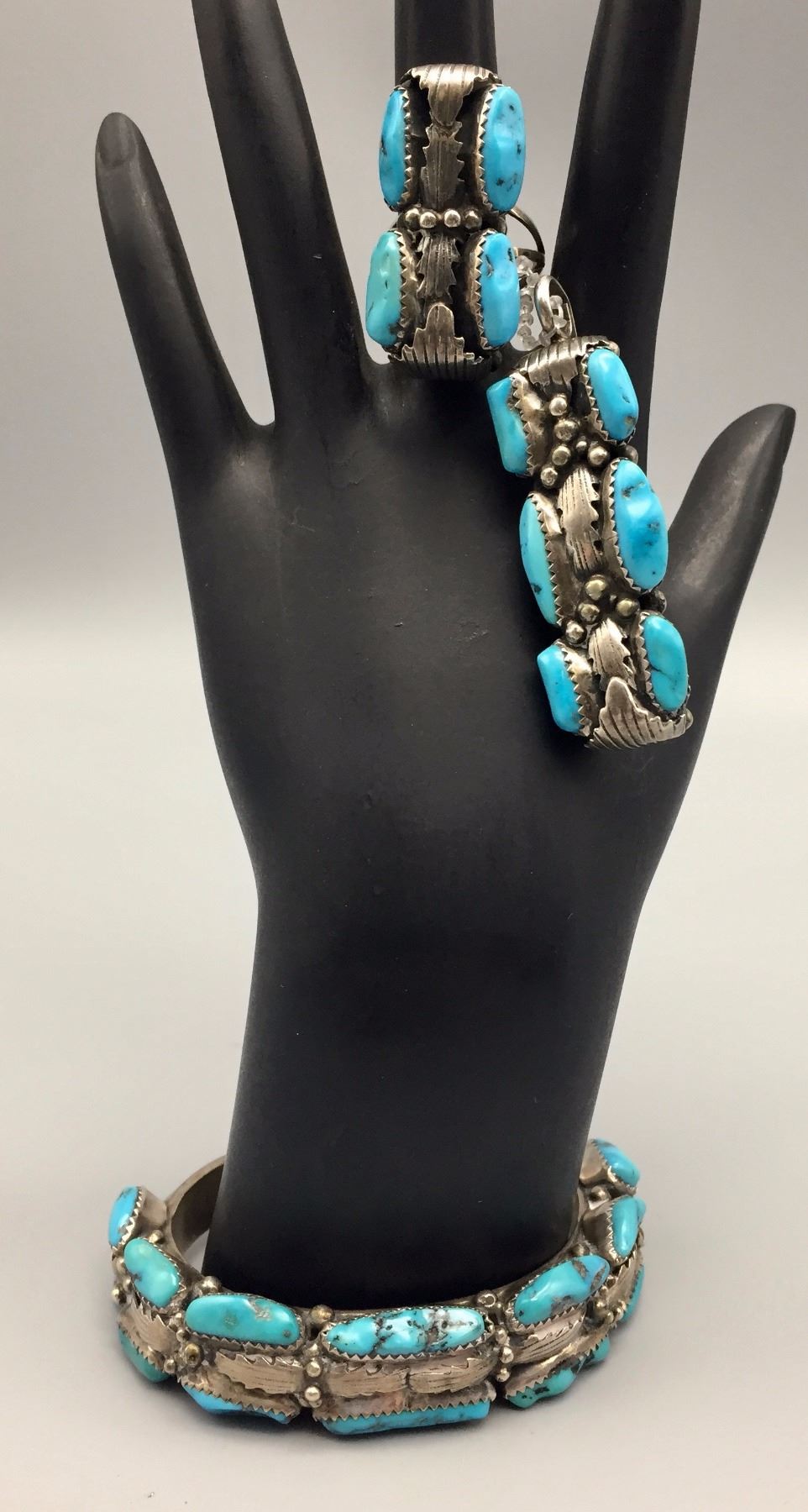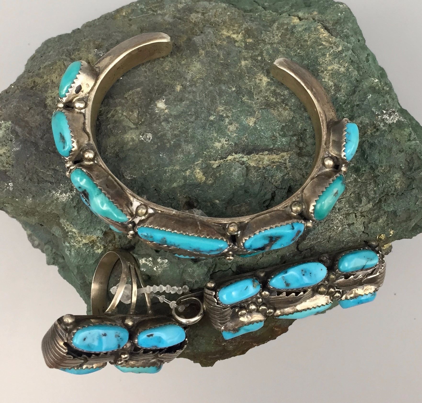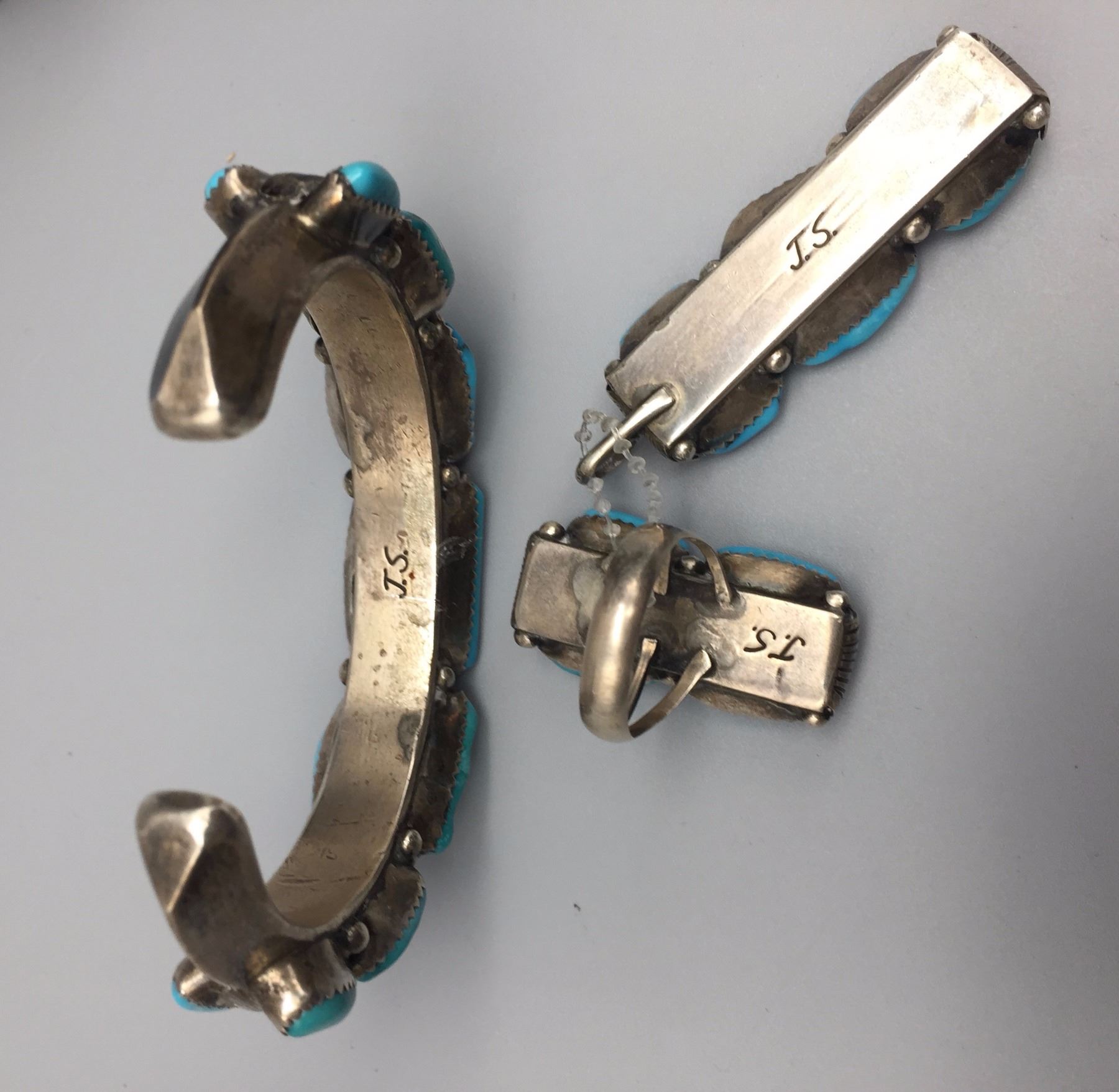 Maker: Hallmarked J.S., mark of Jackie Singer (Navajo). Approx. Age: Circa 1980s or so. Size: Ring size is 7.5. Inside circumference of bracelet is 5” plus it has a 1” opening (making it fit a 6” wrist). Bracelet is 5/8” at it’s widest point. Pendant is 3/4” wide x 1 3/4” long. Lot weighs 116.2 g. Additional Info: Nice turquoise stones set in sterling silver. Condition: Good, normal wear expected. Please look closely at the pictures - they are an important part of our description. Shipping: There will be a $5 handling / packaging fee for shipping this lot. The actual cost of postage will be added on top of that.