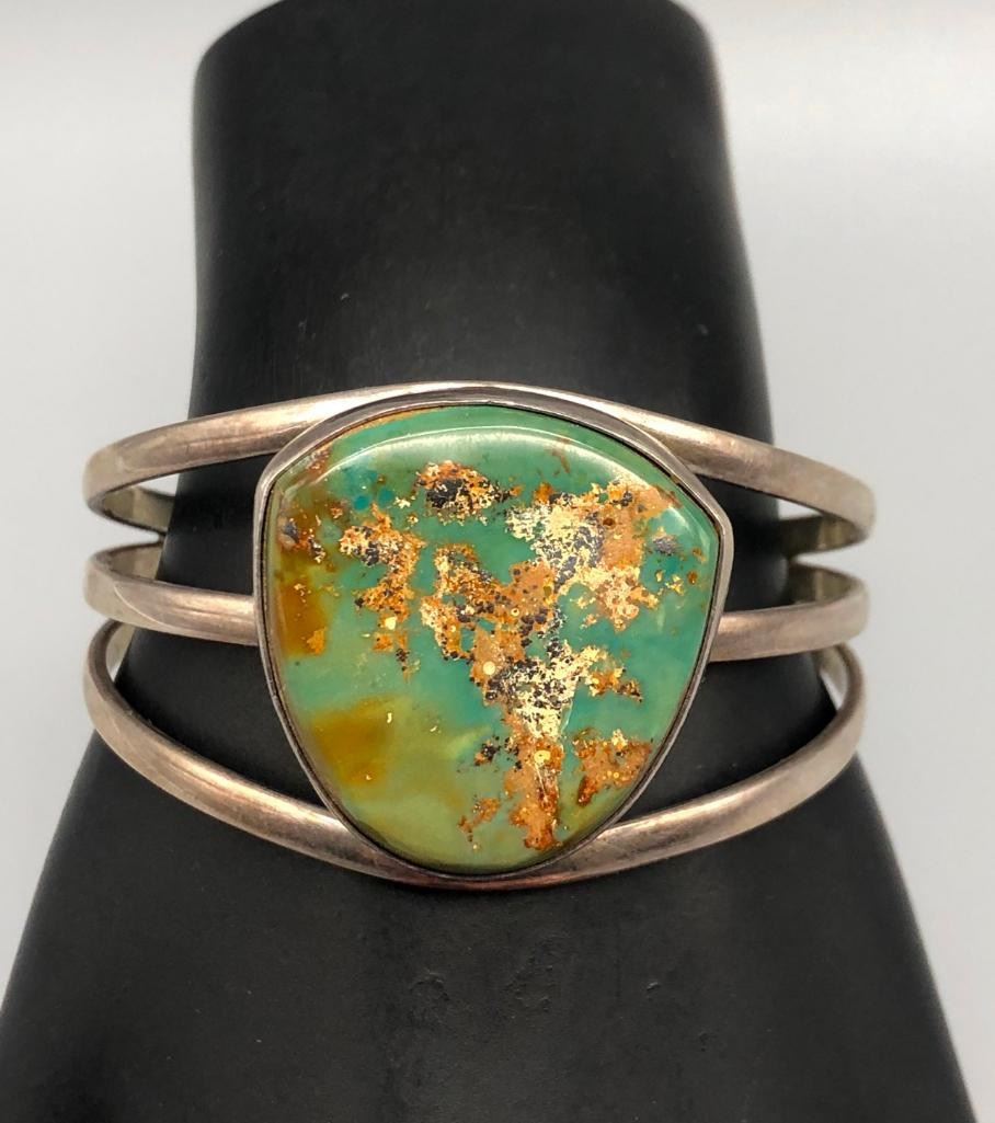 For sale in this lot is a lovely turquoise bracelet by Wilson Padilla. This is a nice simple bracelet set with a nice green turquoise stone. It has a great feel to it and is stamped as sterling silver. MAKER: Hallmarked Wilson Padilla, (Navajo). Active since 1970s. APPROX AGE: Circa 1970s. SIZE: Inside circumference measures 5-1/2 inches long. Opening is an additional 1 inch, fitting a 6-1/2 inch wrist. Width is 1-3/8 inches. Weighs 42.8 grams. CONDITION: Good for its age, normal wear expected. Please look closely at the pictures as they are an important part of our description and are hereby incorporated into the description, specifically with regards to condition. SHIPPING: There will be a $5 handling / packaging fee for shipping this lot. The actual cost of postage will be added on top of that. BUY IT NOW: If you would like to buy this item now, without waiting for the auction day to bid on it, we do offer this option (which is available up to 48 hours before the actual auction starts). The “Buy it Now” price is the high estimate of this lot (plus applicable fees and the Buyer's premium is discounted to 10% when using the Buy it Now option). If you would like to exercise this option, you must contact us by email (or phone as long as you talk to someone live). Reference this lot number and your intention to "Buy it Now."