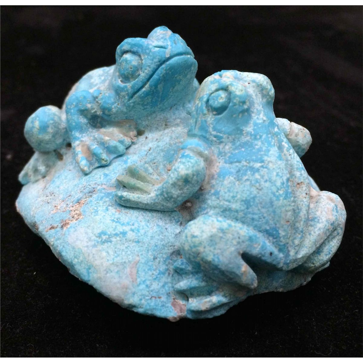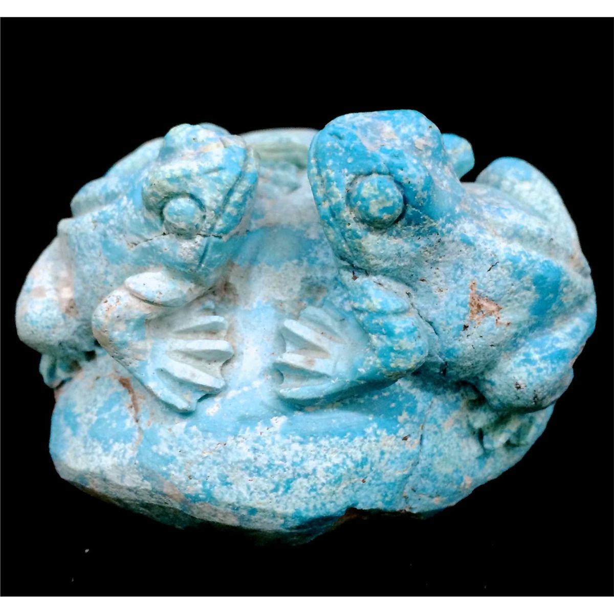 A turquoise stone weighing 722 carats that is carved any manner so it depicts two frogs on the top side.