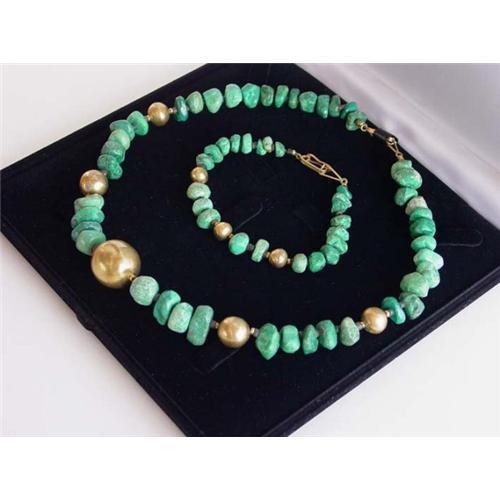 Choker / necklace and bracelet set made out of Peruvian turquoise (also known as Crisocola) with gilt silver beads. In very good condition with irregularities to gold beads as shown. Comes in a velvet pouch (case shown is for display only and is not included). Please ask questions, request additional photos and shipping costs before buying.