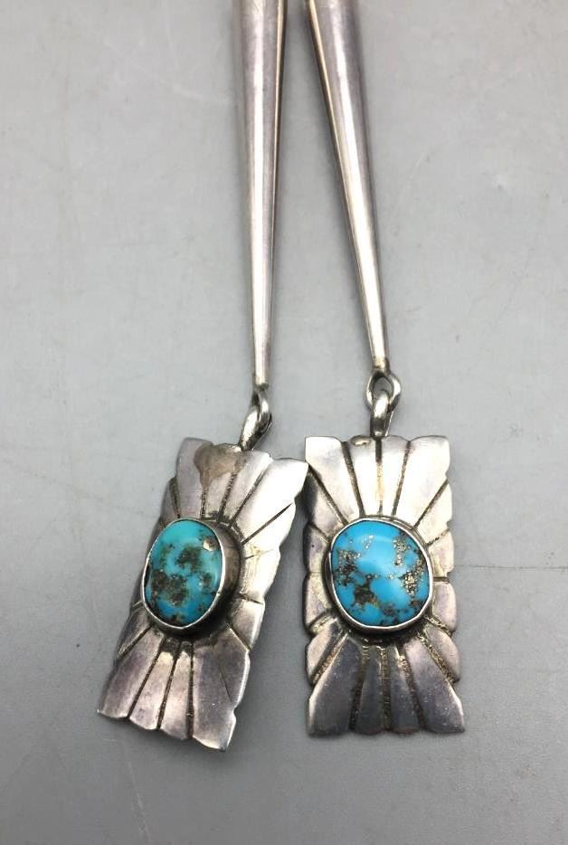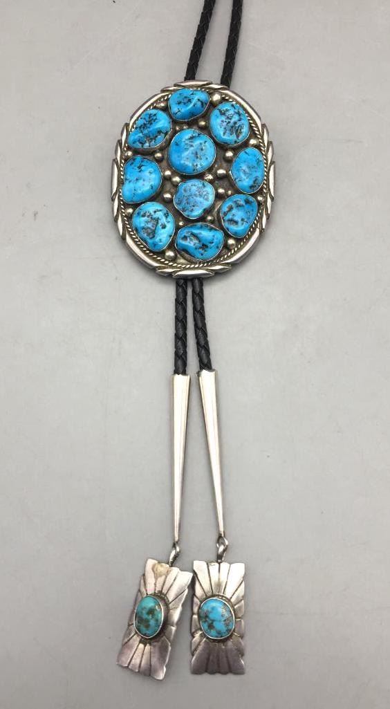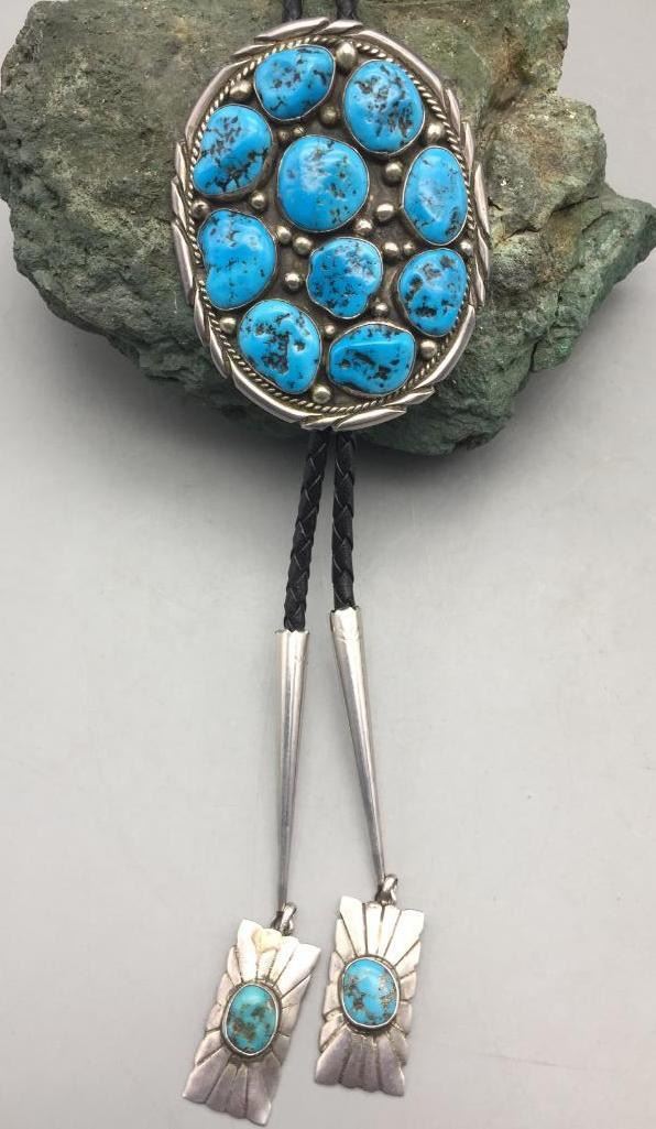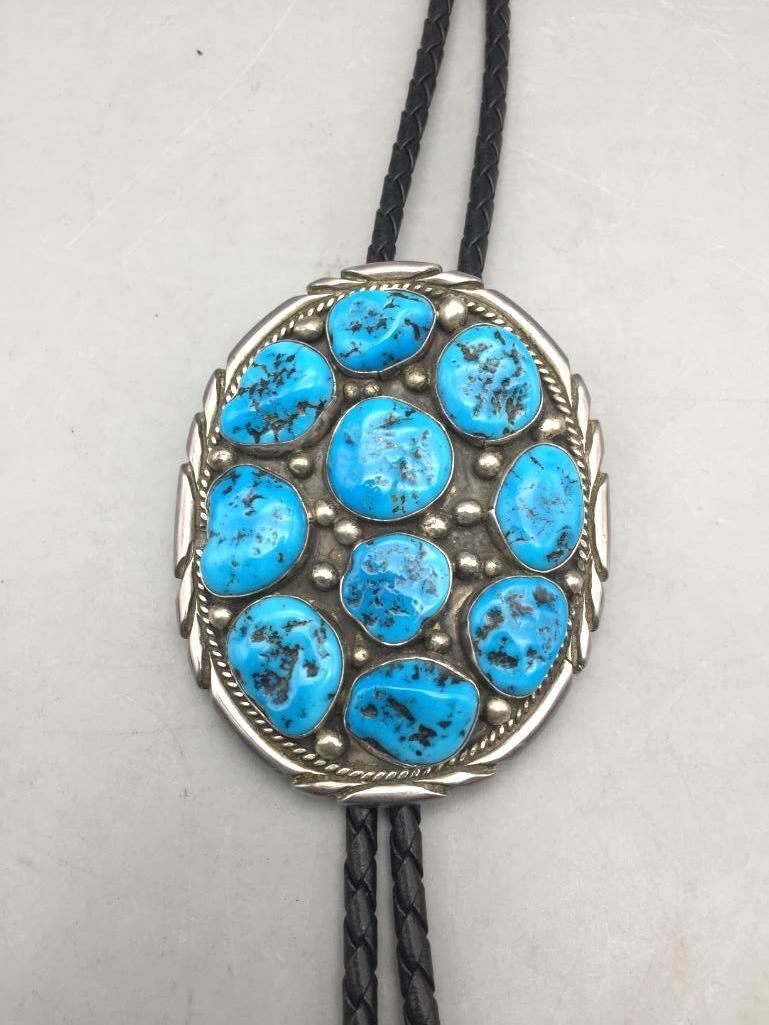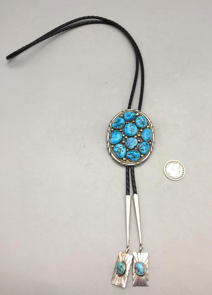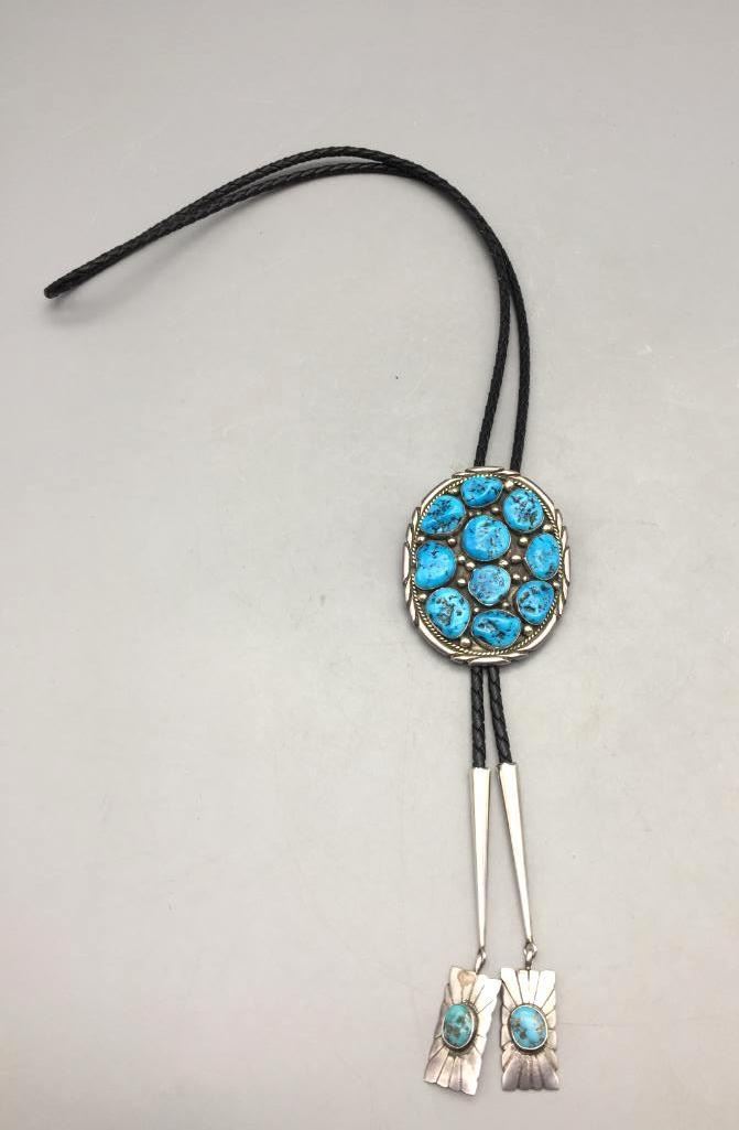 For sale in this lot is a turquoise cluster style bolo tie which is set with ten free form stones and silver dots accenting them throughout. The tips have turquoise cabochons as well. It is sterling silver. Maker: Unmarked. Approx. Age: Circa 1970s - 80s. Size: Braided cord measures 41" long with tips. Slide measures 3" long X 2-1/2" wide. Weighs 75.2 grams. Condition: Good for its age, normal wear expected. Please look closely at the pictures - they are an important part of our description. Shipping: There will be a $5 handling, packaging fee for shipping this lot. The actual cost of postage will be added on top of that.