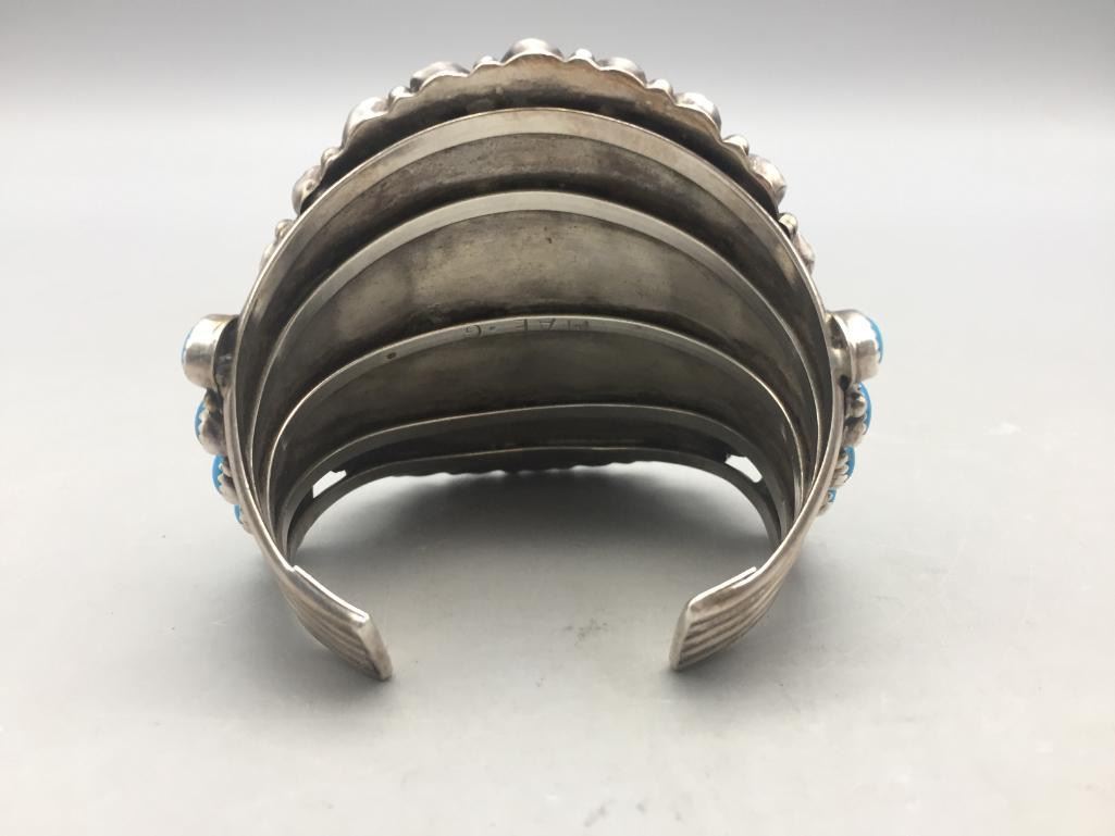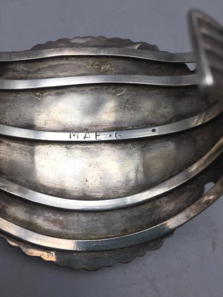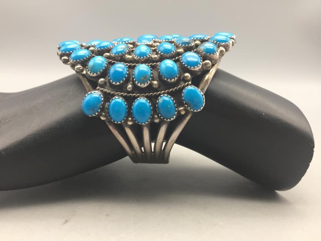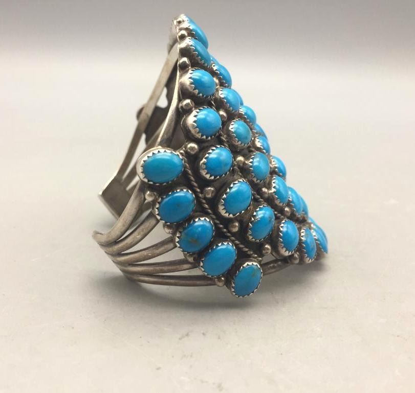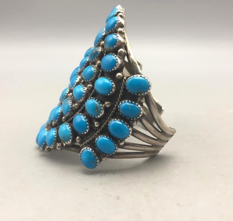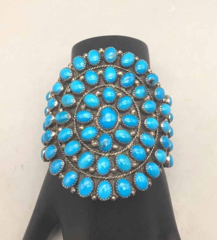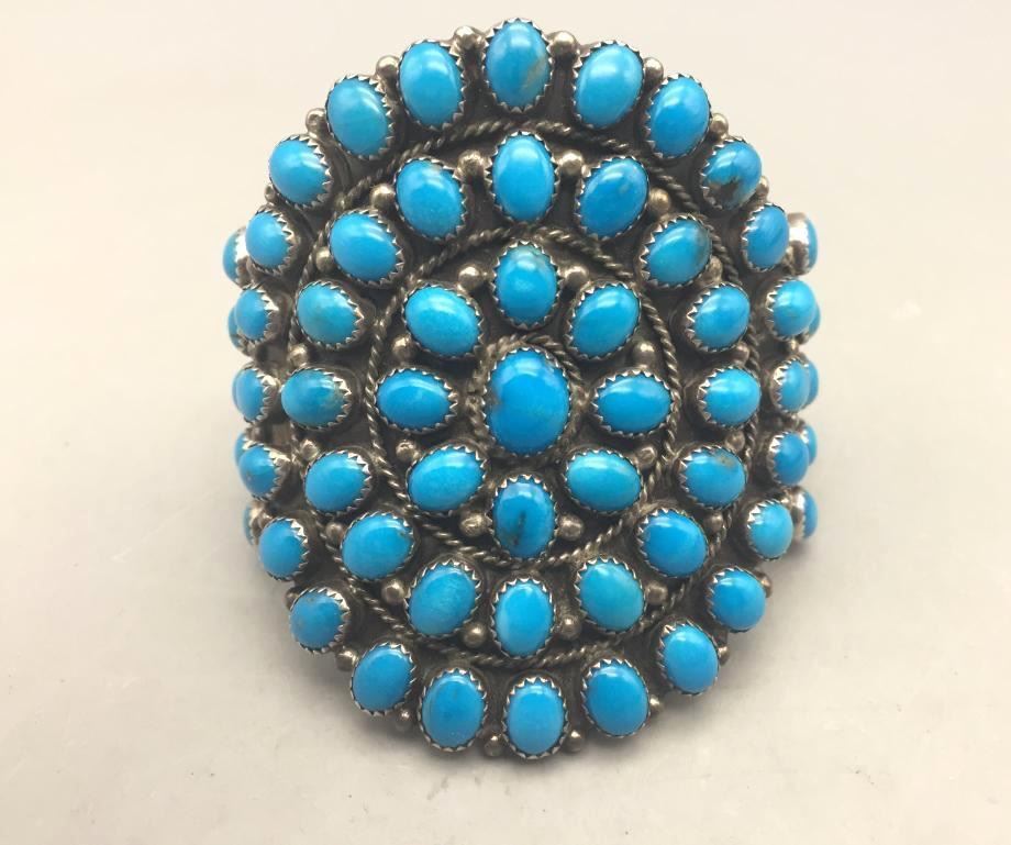 Offered for sale in this lot is a turquoise cluster bracelet. It is set with 59 turquoise cabochons that are a deep blue and it is sterling silver. Maker: Hallmarked MAE.G. Approx. Age: Fairly modern. Size: Inside circumference measures 5-1/8". Opening is an additional 1-1/8", fitting 6-1/4" wrist. Width id 2-7/8". Weighs 79.4 grams. Condition: Good for its age, normal wear expected. Please look closely at the pictures - they are an important part of our description. Shipping: There will be a $5 handling, packaging fee for shipping this lot. The actual cost of postage will be added on top of that.
