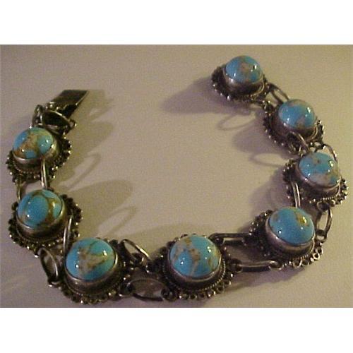 Each link of this gorgeous Sterling filigree bracelet is adorned with a turquoise colored glass marbled cabochon. This lovely bracelet measures 7 inches long. This is in vintage condition. Clasp works very well.