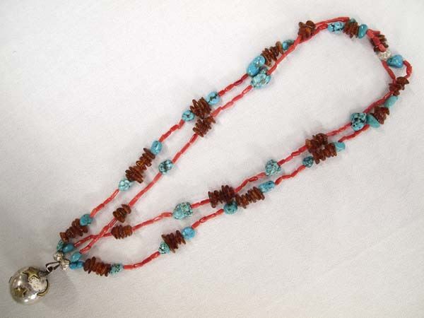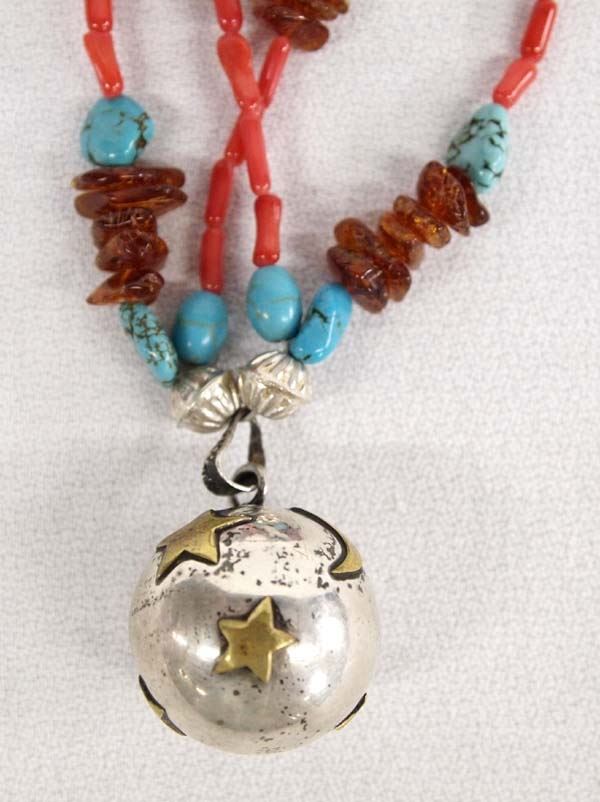 Turquoise & Coral Harmony Ball (Mexican Bola) Beaded Necklace, measures 21'' end to end x 1''W, includes: amber, coral, and dyed turquoise nugget beads, FYI: Harmony ball is a symbol of calm and relaxation. Made with sterling silver and contains a small bell like item that emits very subtle but audible chimes with movement and is traditionally used in Bali and Mexico