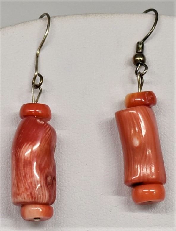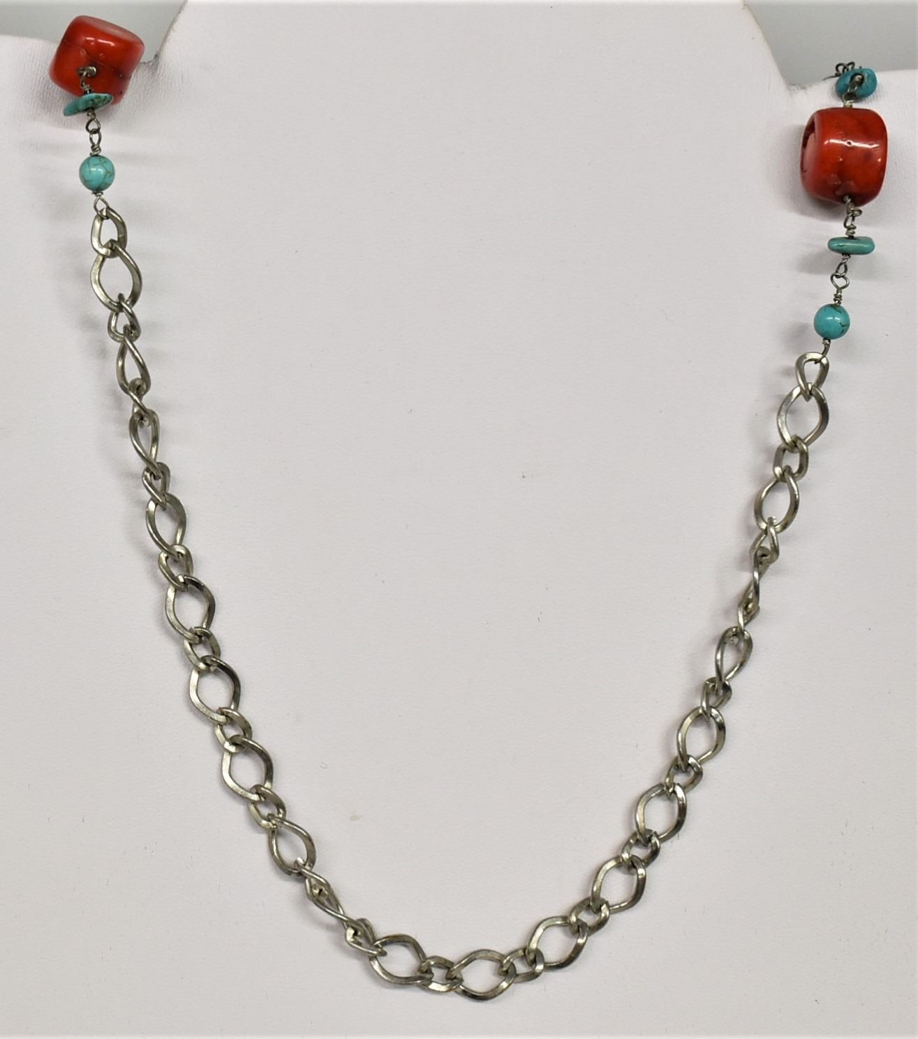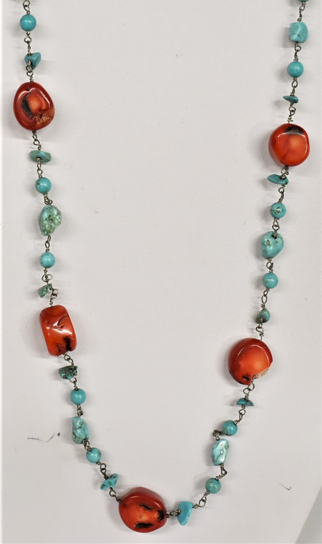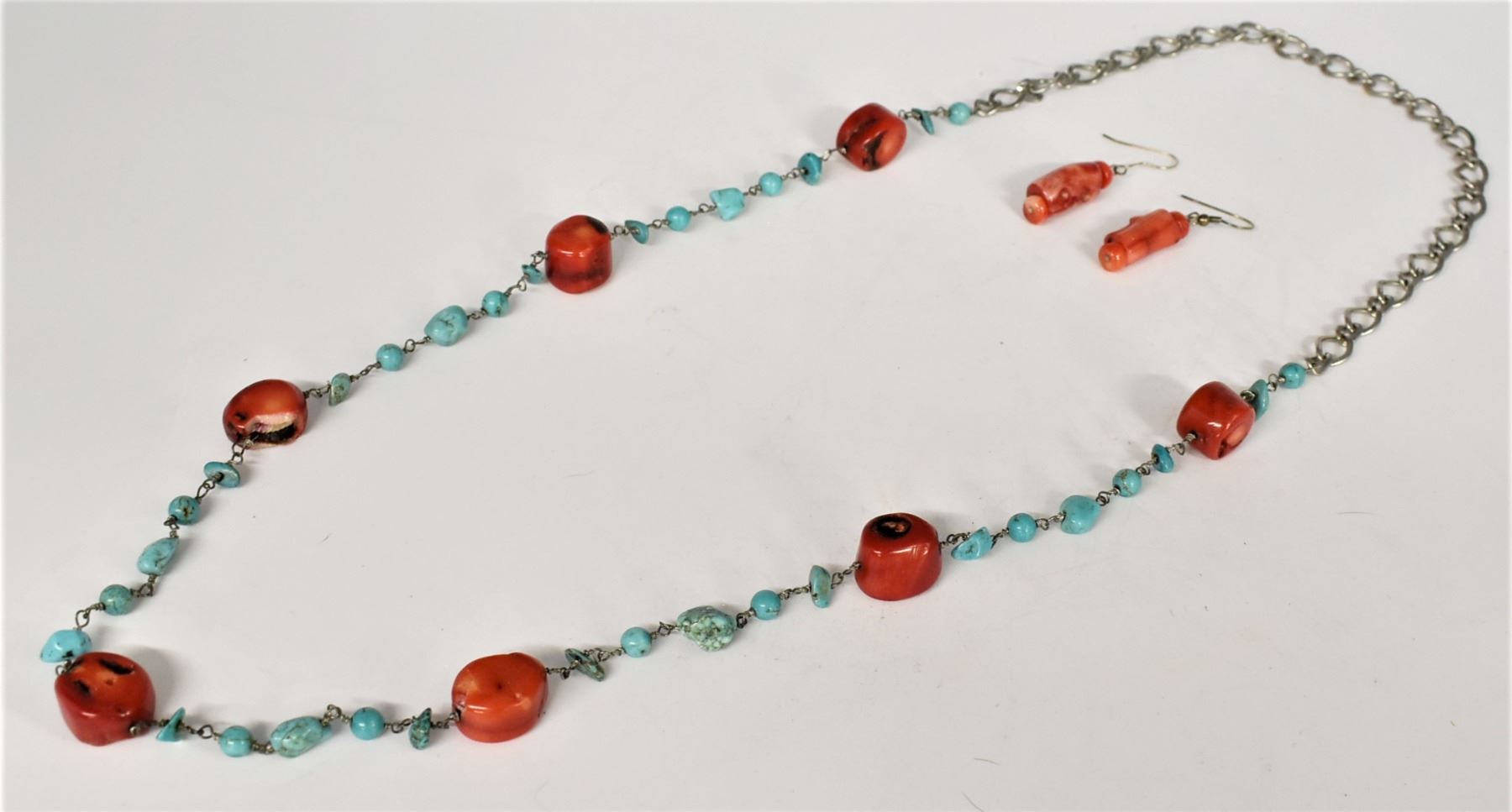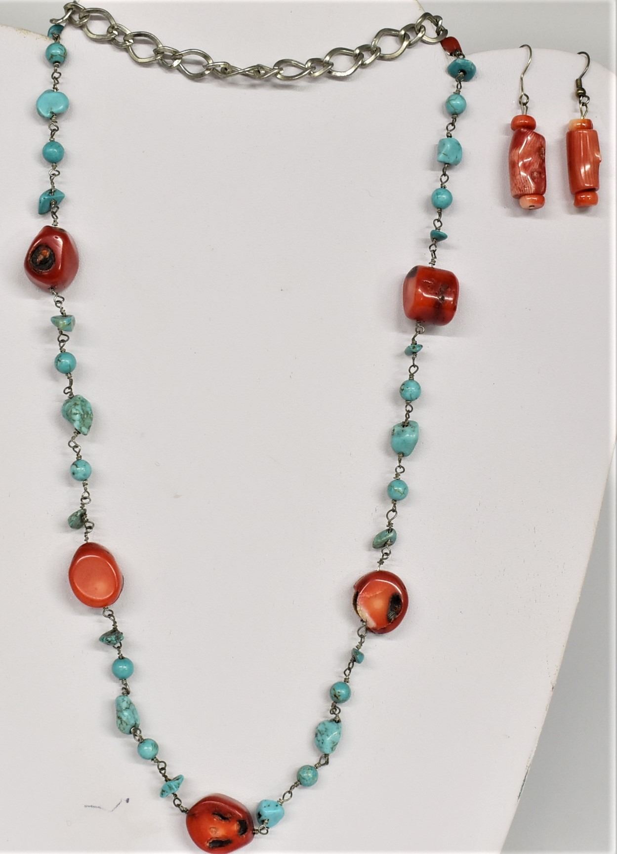 Turquoise Nugget & Dyed Coral Nugget Necklace and Earrings, necklace measures 24''L end to end, earrings measure 2''L which includes the wire, one of the coral beads is chipped