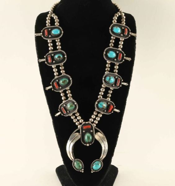 Eight ovals of sterling silver edged in a rope design hold a turquoise and coral stone with squash blossom. Silver naja with feather motif has oval of turquoise and coral with a turquoise stone at each end.