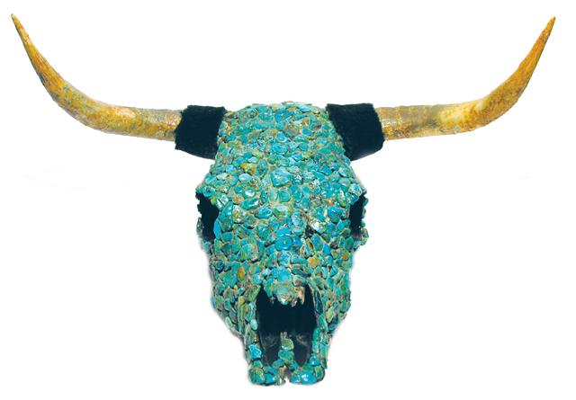 Circa 1970s, Steer skull completely covered with turquoise cabochons; teeth intact. 17", horn span 25-1/2"