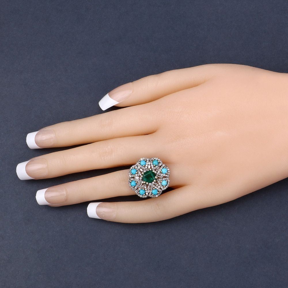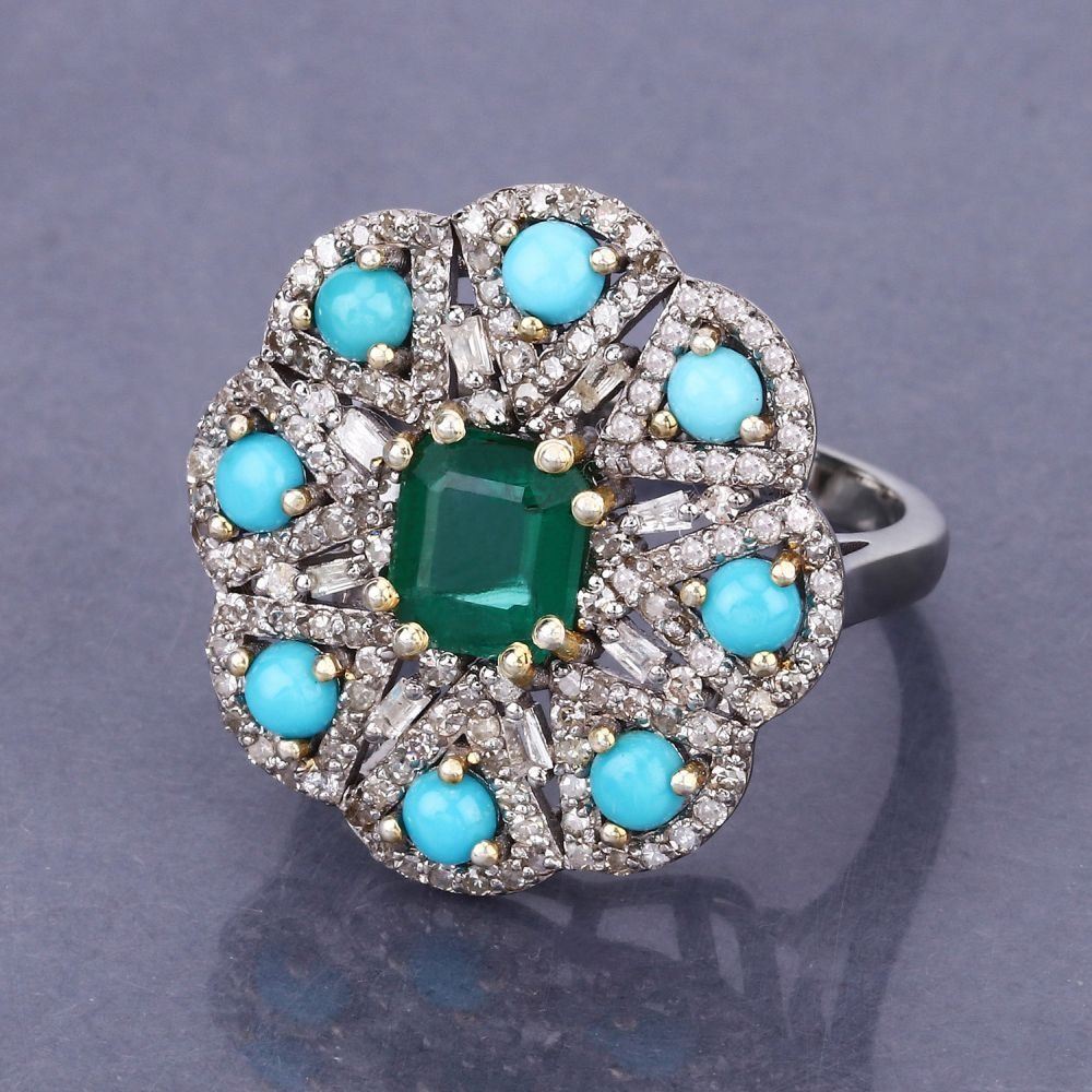 TITLE DESCRIPTION: Turquoise Diamond & amp; Emerald Cocktail Ring