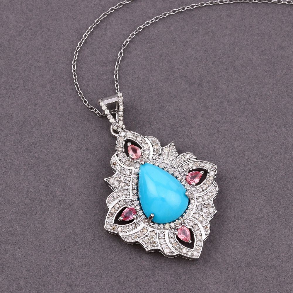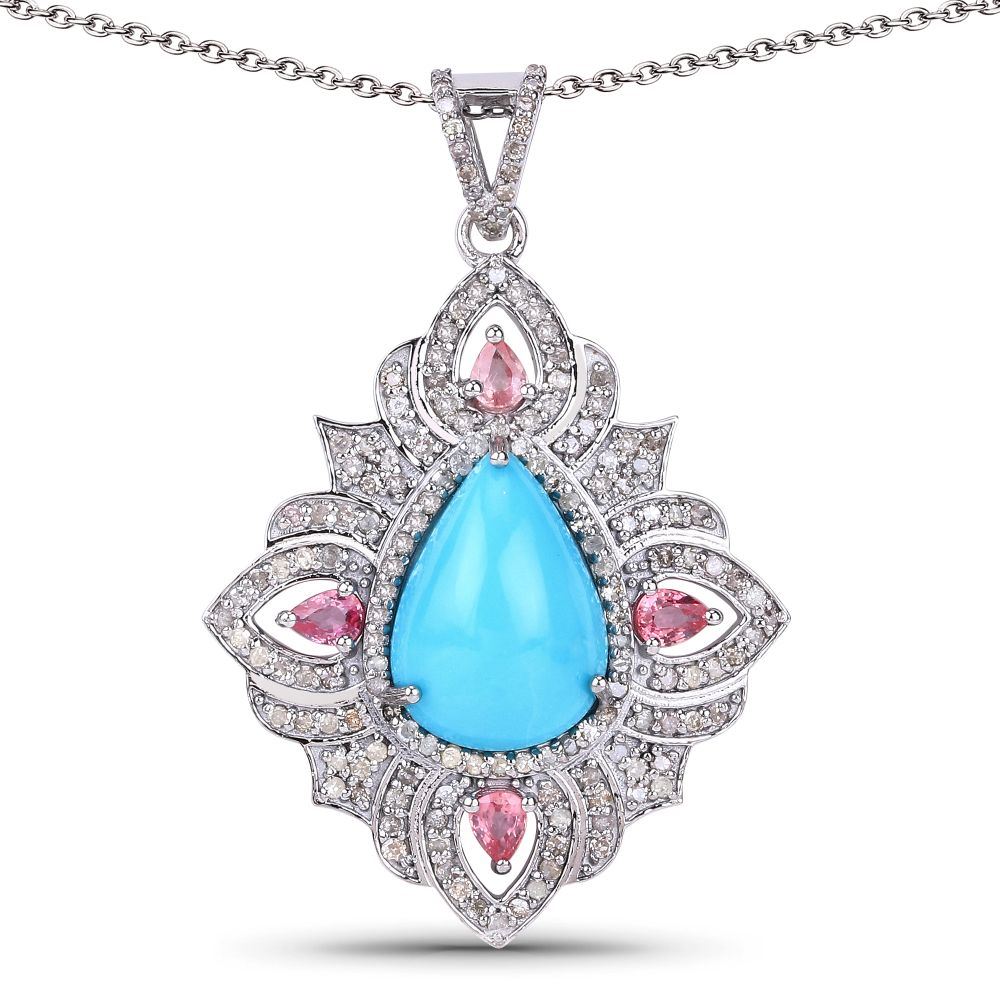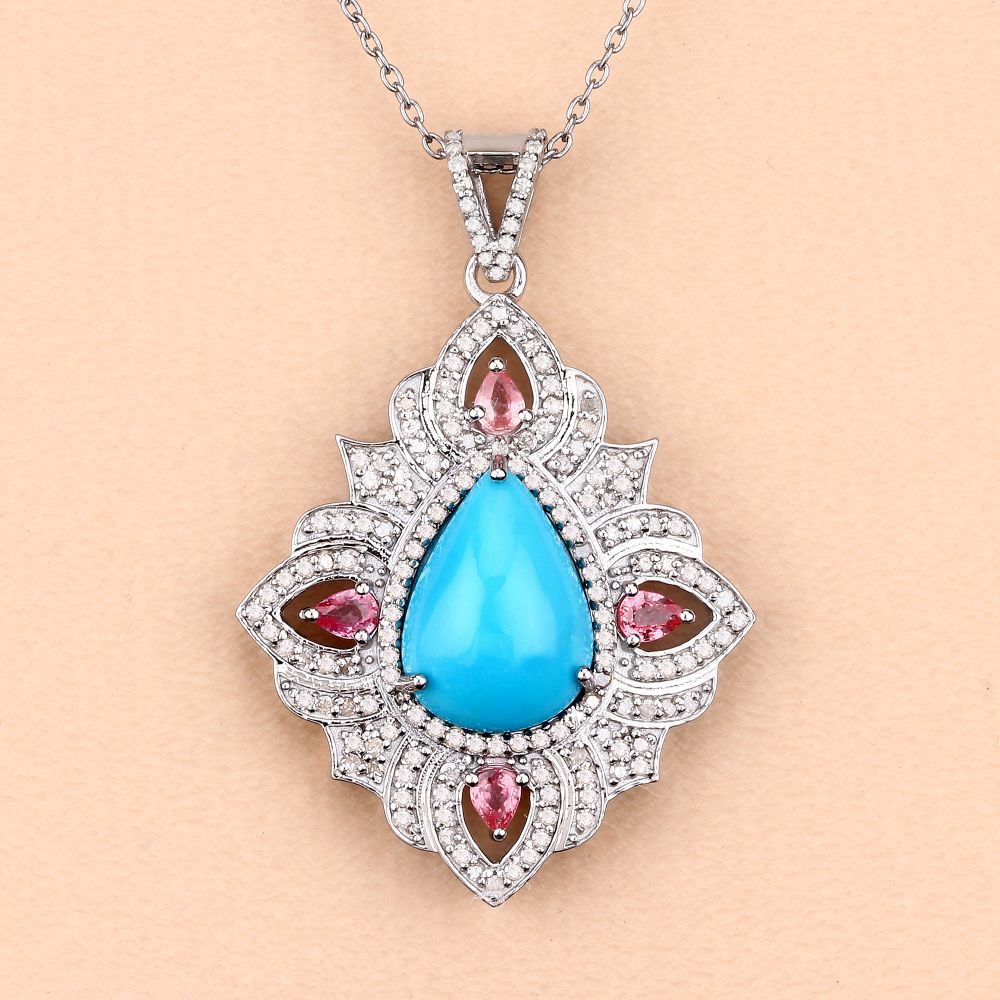 DESCRIPTION DETAIL: Genuine Turquoise, Genuine Pink Tourmaline, and Earth-Mined Diamond Necklace