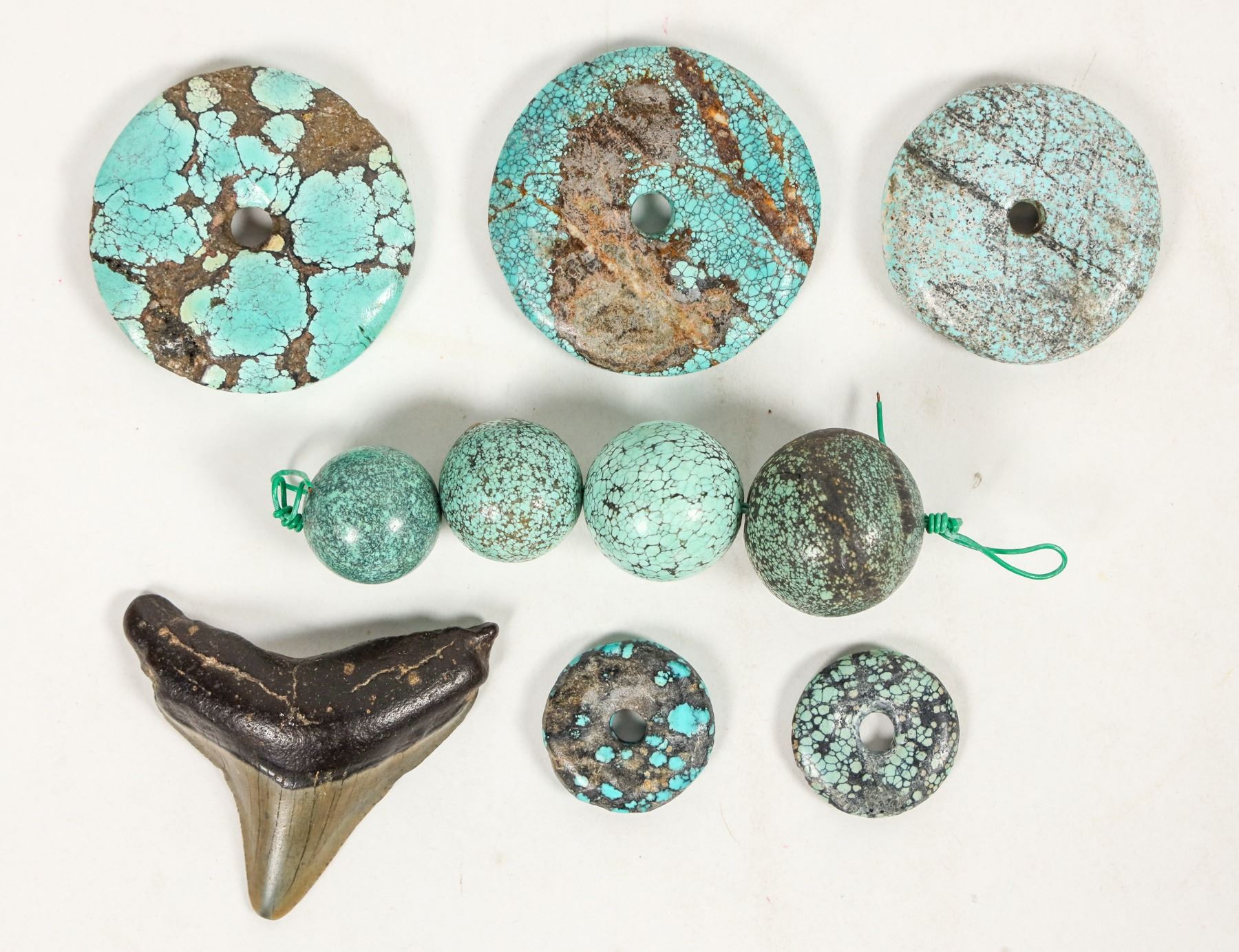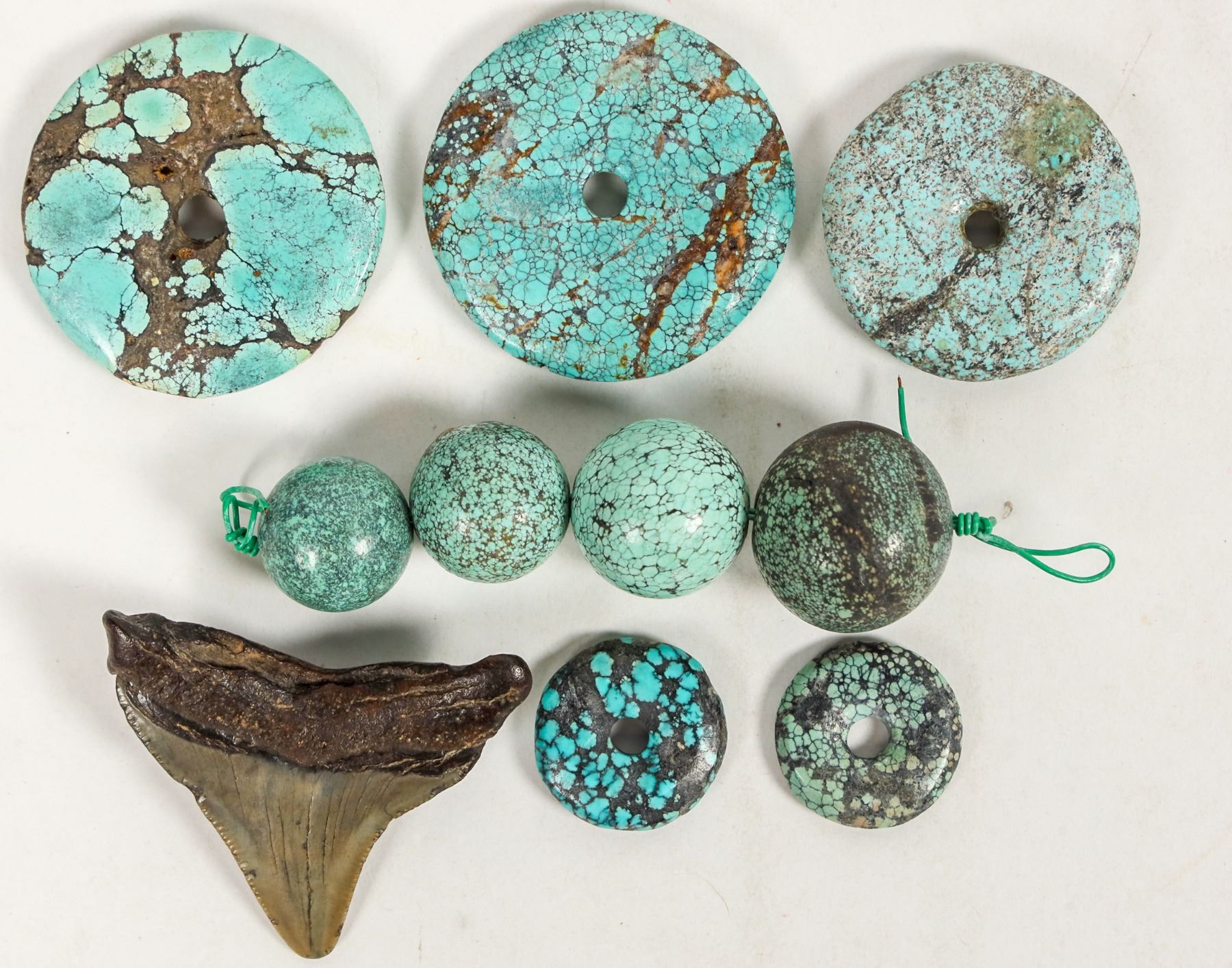 Turquoise Disk or Donut Beads, Spheres and Megalodon Tooth. Vintage. Turquoise is likely from Persia. Large beads. See photo.