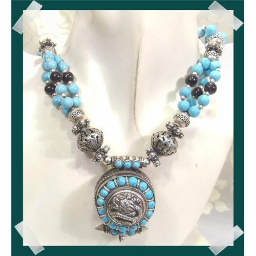 A Tibetan treasure from the Far East! Such a substantial piece of jewelry with a gram weight of 183. The turquoise and black onyx beads measure 8mm. The overall length of the necklace is 20 inches with the center dragon gau measuring 2.3 inches and is hallmarked 925 sterling.