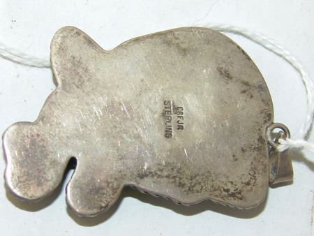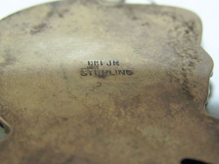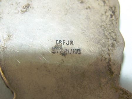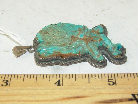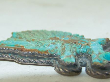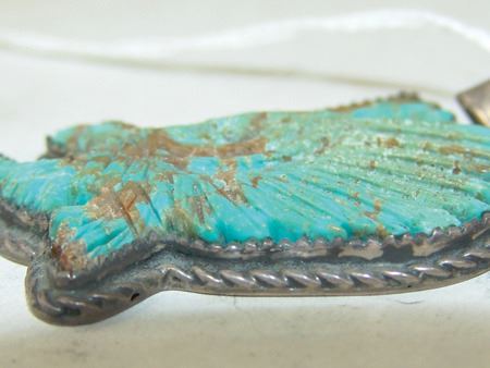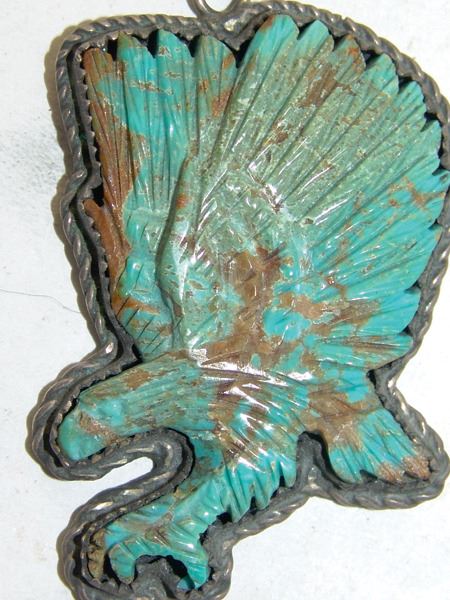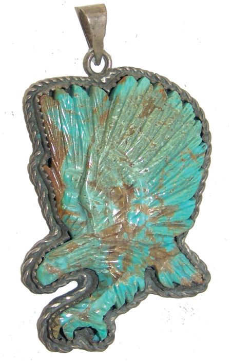 Late 1900s, Fine original design all-silver pendant with a beautiful carved turquoise figure, an eagle alighting. Very good condition. 2" x 1-1/2" x 1/4"