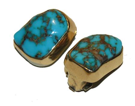 Circa Contemporary, 14KT gold clip-on earrings set with high grade natural Bisbee turquoise cabazons. 1/2"