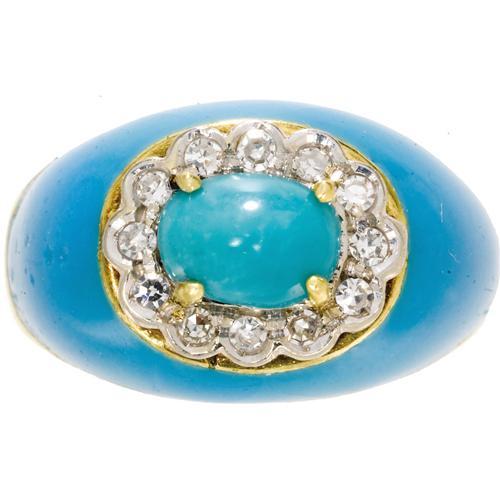 <B>Turquoise, Enamel, Diamond Gold Ring</B></I><BR><BR>The ring centers an oval-shaped turquoise cabochon measuring 6.00 x 4.50 mm, framed by single-cut diamonds weighing a total of approximately 0.25 carat, accented by baby blue enamel applied on 18k yellow gold. Gross weight 7.50 grams.<BR>*Note: Size 4-1/2 (sizeable) <B>Condition Report:</B> Ring<BR><BR>Diamonds<BR><BR>Average Color: GHI<BR><BR>Average Clarity: VS<BR><BR>Shapes: Round, Single-cut<BR><BR>Diamond Count: 1-25<BR><BR>Colored Gemstones: Turquoise<BR><BR>Average Clarity: Good<BR><BR>Shapes: Oval<BR><BR>Gemstone Count: 1-25<BR><BR>Overall Condition: Good<BR><BR>Notes: Minor nicks noted in enamel as is one fine crack near base edge of enamel.<BR><BR><BR><b>Shipping:</b> Miscellaneous Collectibles, Smal (<a target="_blank" href="http://www.heritageauctions.com/common/shipping.php">view shipping information</a>)