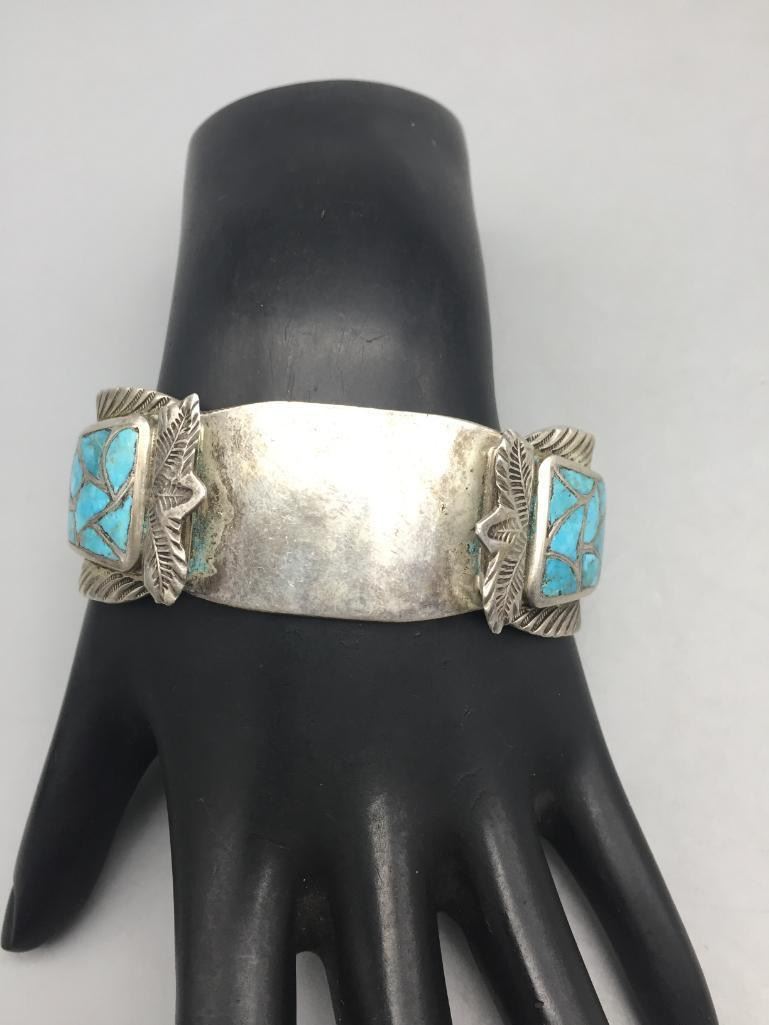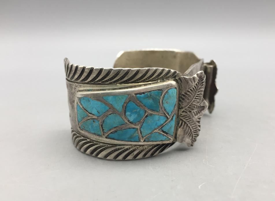 Description: For sale in this lot is a turquoise fish scale inlay watch cuff featuring a simple leaf stamp work with the fish scale inlay. Maker: Hallmarked with what looks to be an eagle head. Approx. Age: Circa 1970s. Size: Inside circumference measures 5-7/8 inches long. Opening is an additional 1-1/8 inch, fitting a 7 inch wrist. Width is 1-1/8 inches. Weighs 64.1 grams. Condition: Good for its age, normal wear expected. Please look closely at the pictures - they are an important part of our description. Shipping: There will be a $5 handling / packaging fee for shipping this lot. The actual cost of postage will be added on top of that.