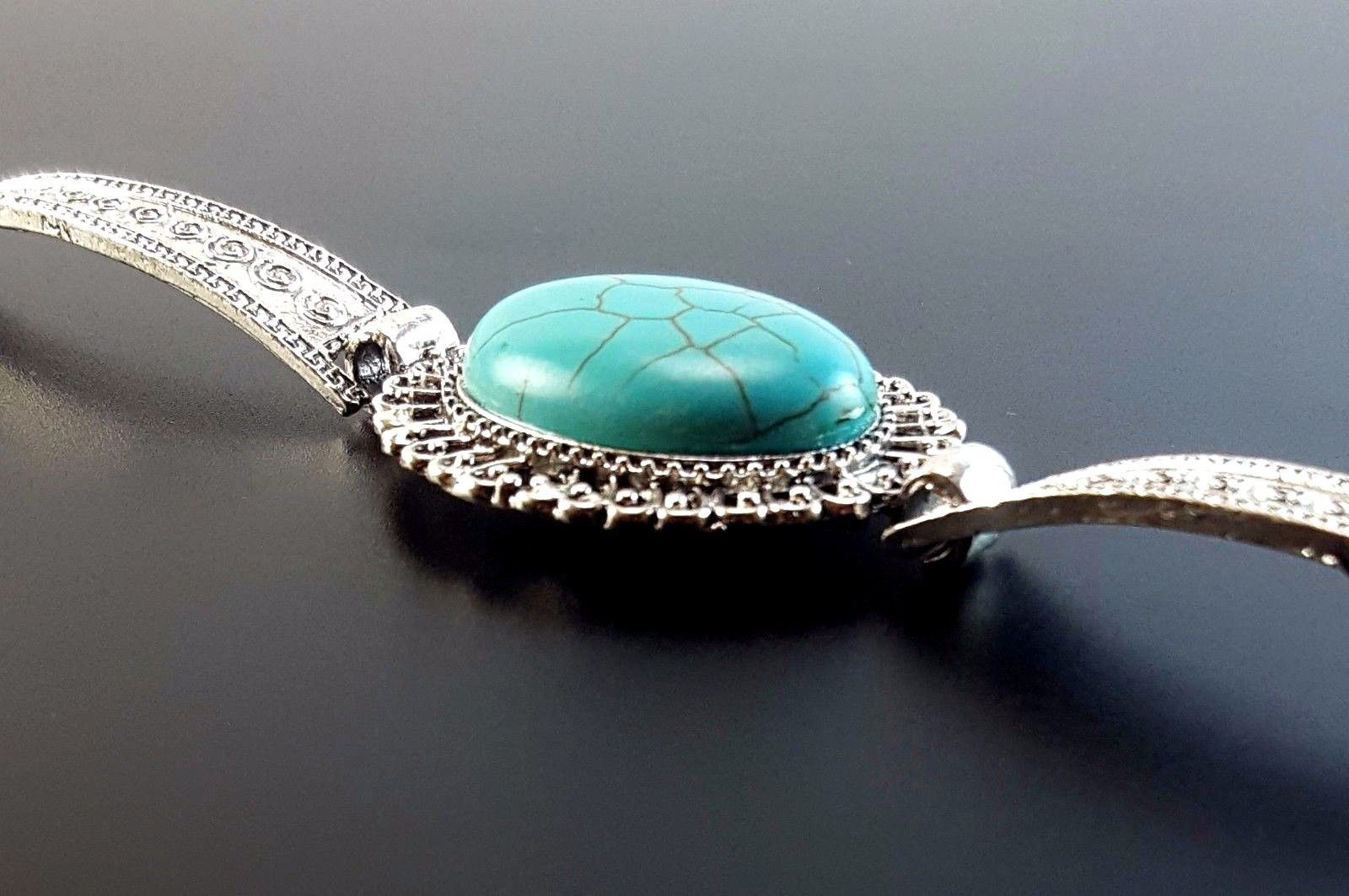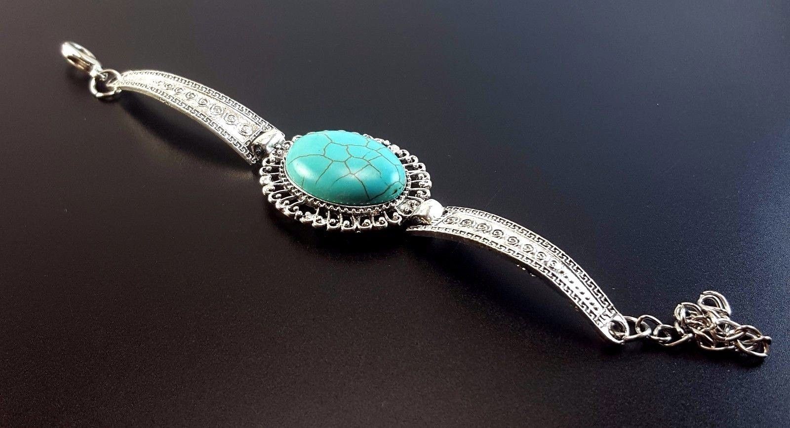Turquoise Gemstone Silver Plated Handmade Bracelet , JEWELRY TYPE : BRACELET , Gemstone : TURQUOISE , BRACELET LENGTH : 8 INCHES (WITH ADJUSTABLE LINKS) , BRACELET WEIGHT : 18.00 GRAMS , Metal : BRASS (SILVER PLATED)