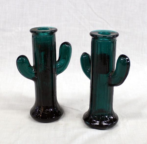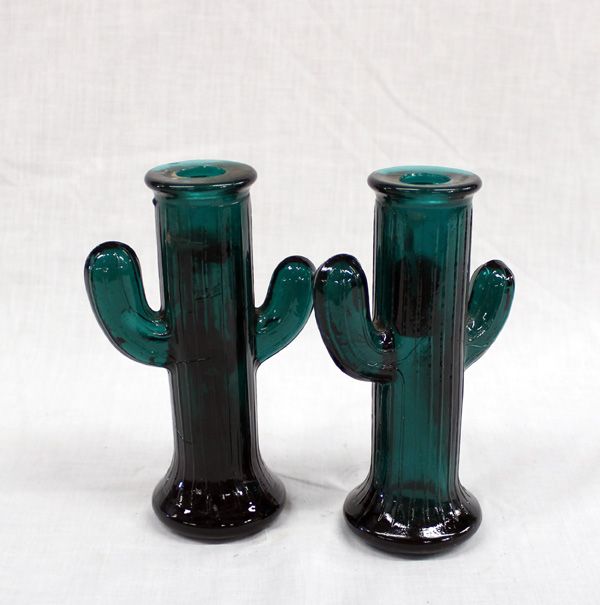 Turquoise Glass Saguaro Cactus Candleholders, measures 4'' x 7'', ribbed glass and flared openings