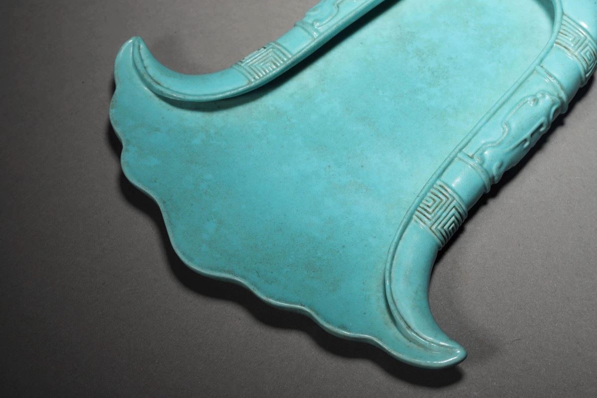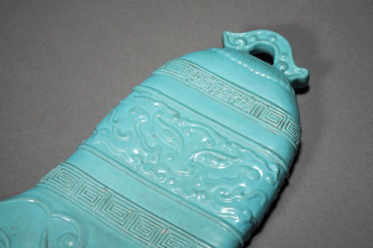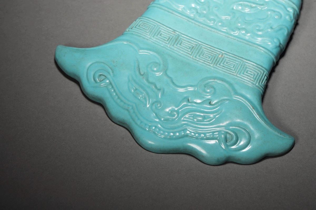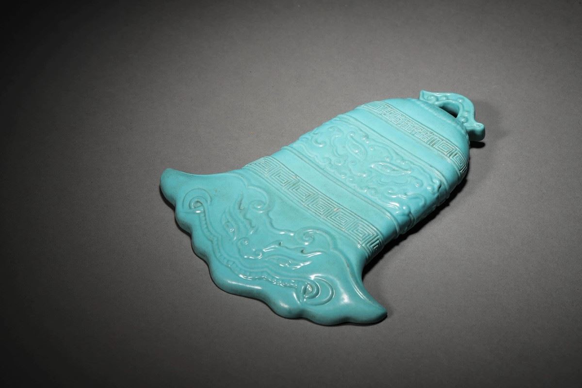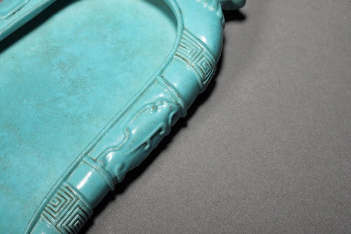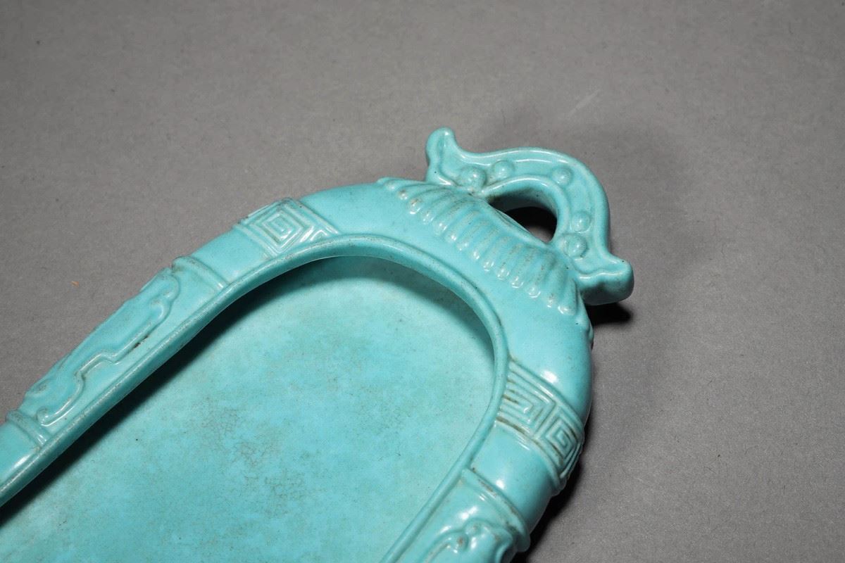 This inkstone features a turquoise glaze, with a refreshing and unique color. The beast face pattern is exquisitely carved, showcasing the skilled craftsmanship of ancient artisans. The overall design is both classical and elegant, offering both practical use and artistic value, making it a classic piece in the traditional scholar’s stationary set.