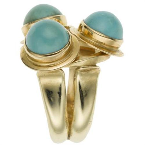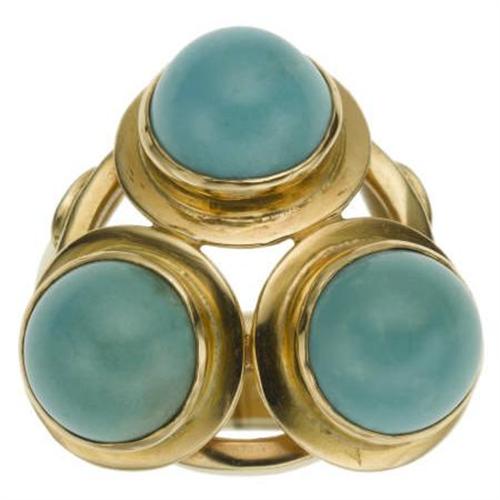 <B>Turquoise, Gold Ring</B></I><BR><BR>The ring features a cluster of turquoise cabochons, set atop a double shank in 14k yellow gold. Gross weight 14.60 grams.<BR>Note: Size 5 (sizeable)<BR><BR> <B>Condition Report:</B> Good condition. Gold is slightly dented, evidence of sizing repair.<BR><BR><b>Shipping:</b> Miscellaneous Collectibles, Smal (<a target="_blank" href="http://www.heritageauctions.com/common/shipping.php">view shipping information</a>)