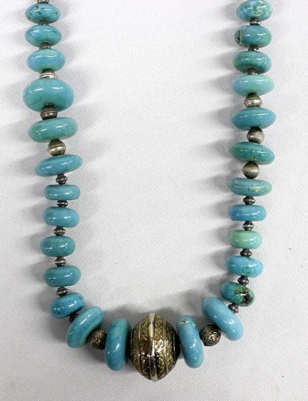 Turquoise Graduated Bead Necklace, measures 30''L end to end, 1.5''D center bead pendant, stabilized turquoise