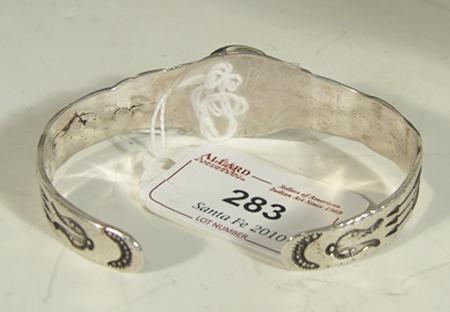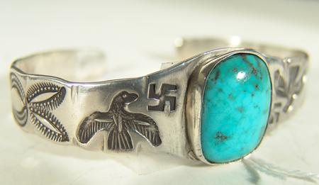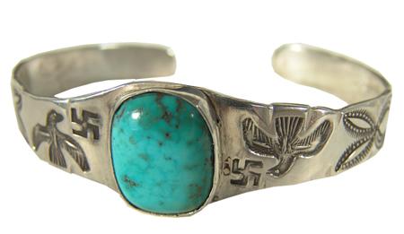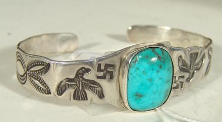 Elegant sterling band bracelet with hand stamped arrows, eagles, and whirling logs and a natural Nevada turquoise cabochon center. 6-1/2" x 1" x 7/8"
