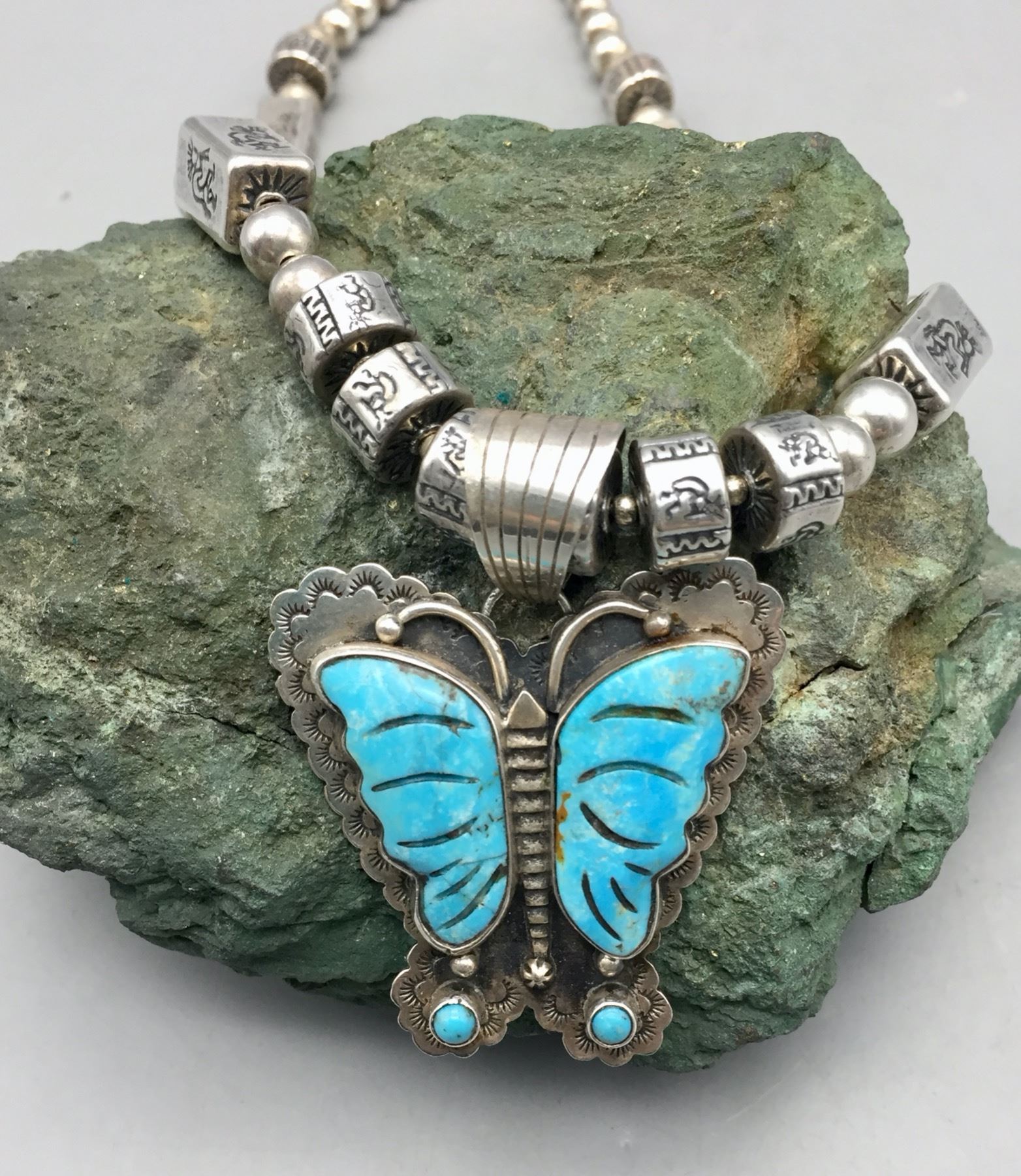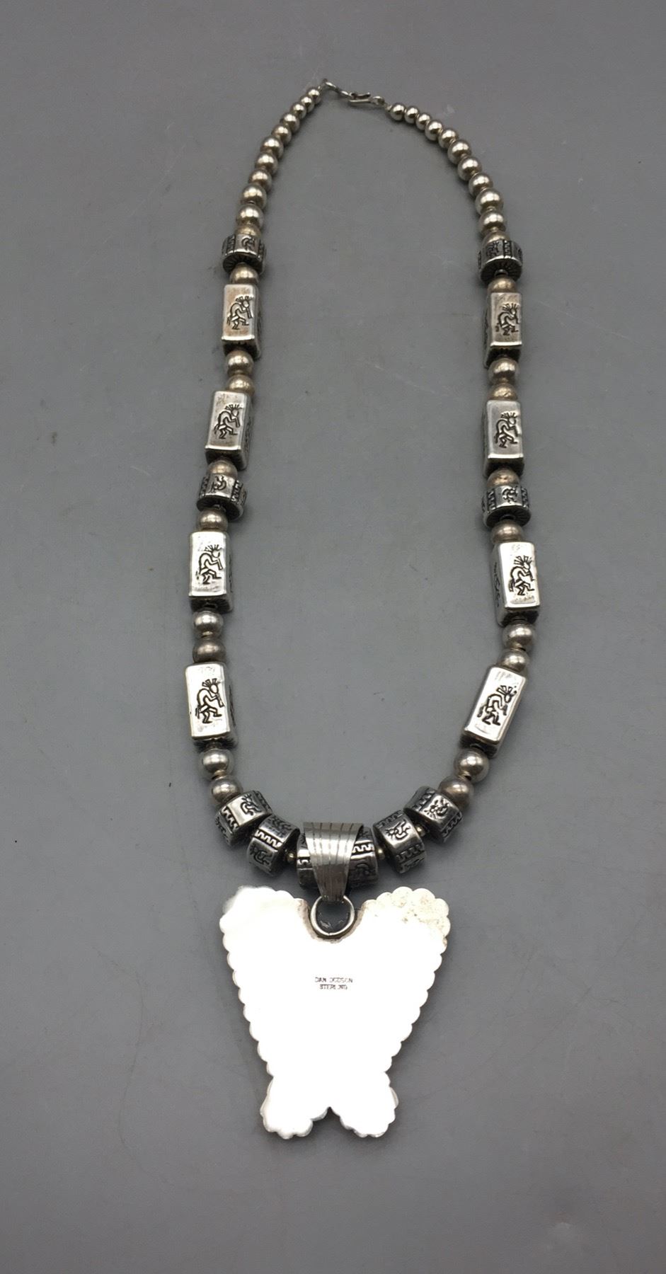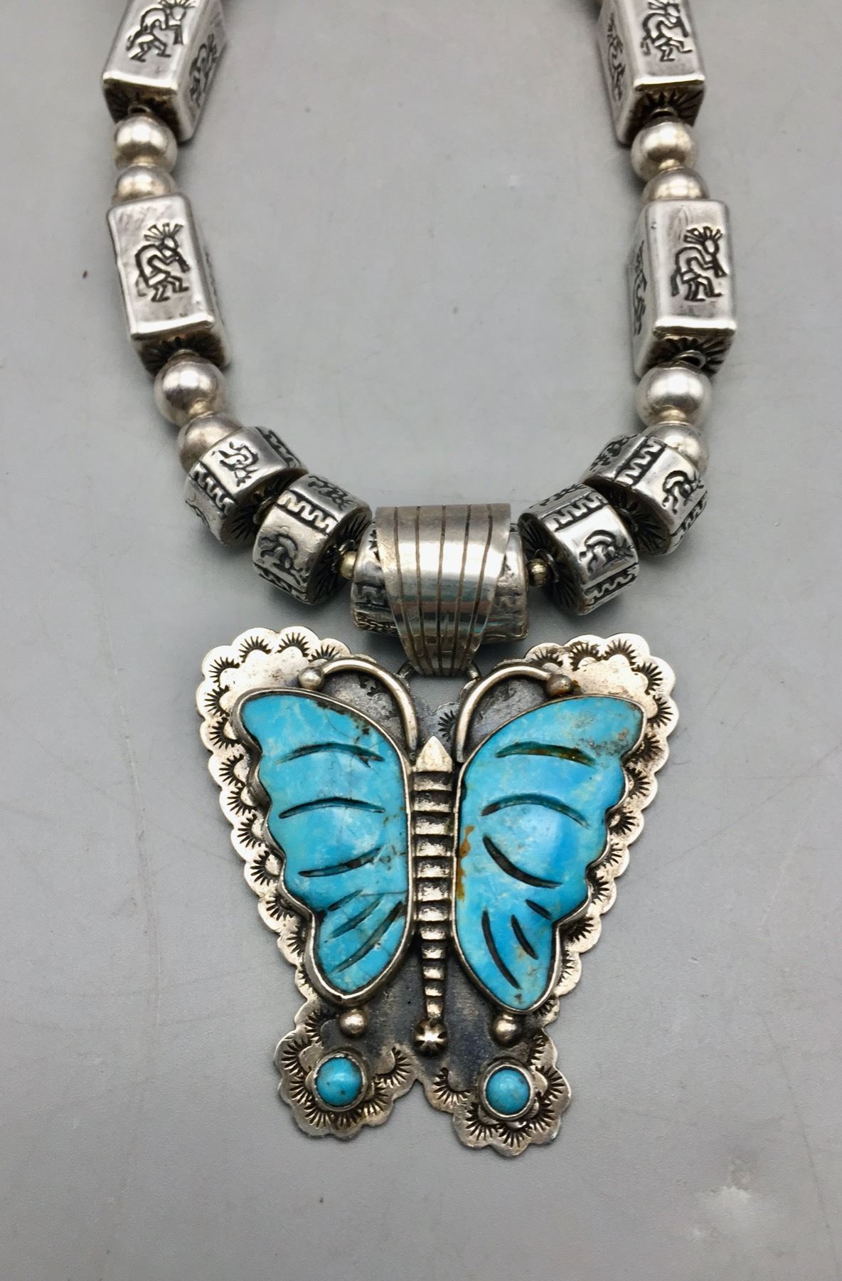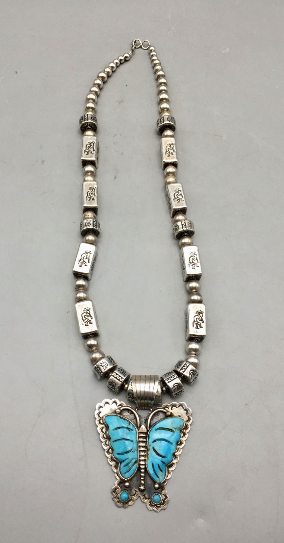 Description: Offered for sale in this lot is a turquoise inlay butterfly necklace, strung with uniquely shaped beads and Kokopelli stamps on some of them. The Butterly is set with carved turquoise with stamping around it. Marked as sterling silver. Maker: Pendant is hallmarked, Dan Dodson. Approx. Age: Modern. Size: Fits a 20 inch neck. Pendant measures 2-1/2 inches long x 2 inches wide. Weighs 63.7 grams. Condition: Good for its age, normal wear expected. Please look closely at the pictures - they are an important part of our description. Shipping: There will be a $5 handling, packaging fee for shipping this lot. The actual cost of postage will be added on top of that.