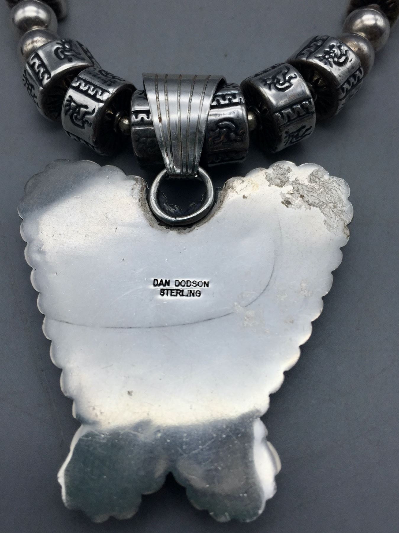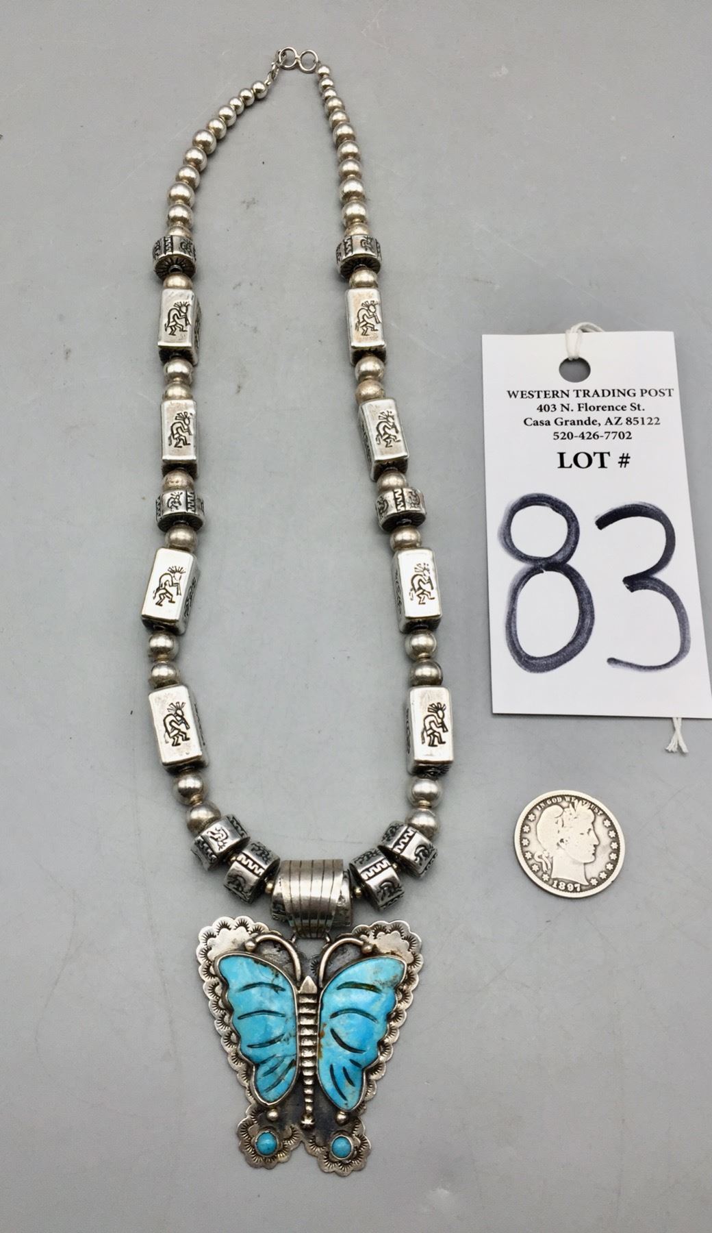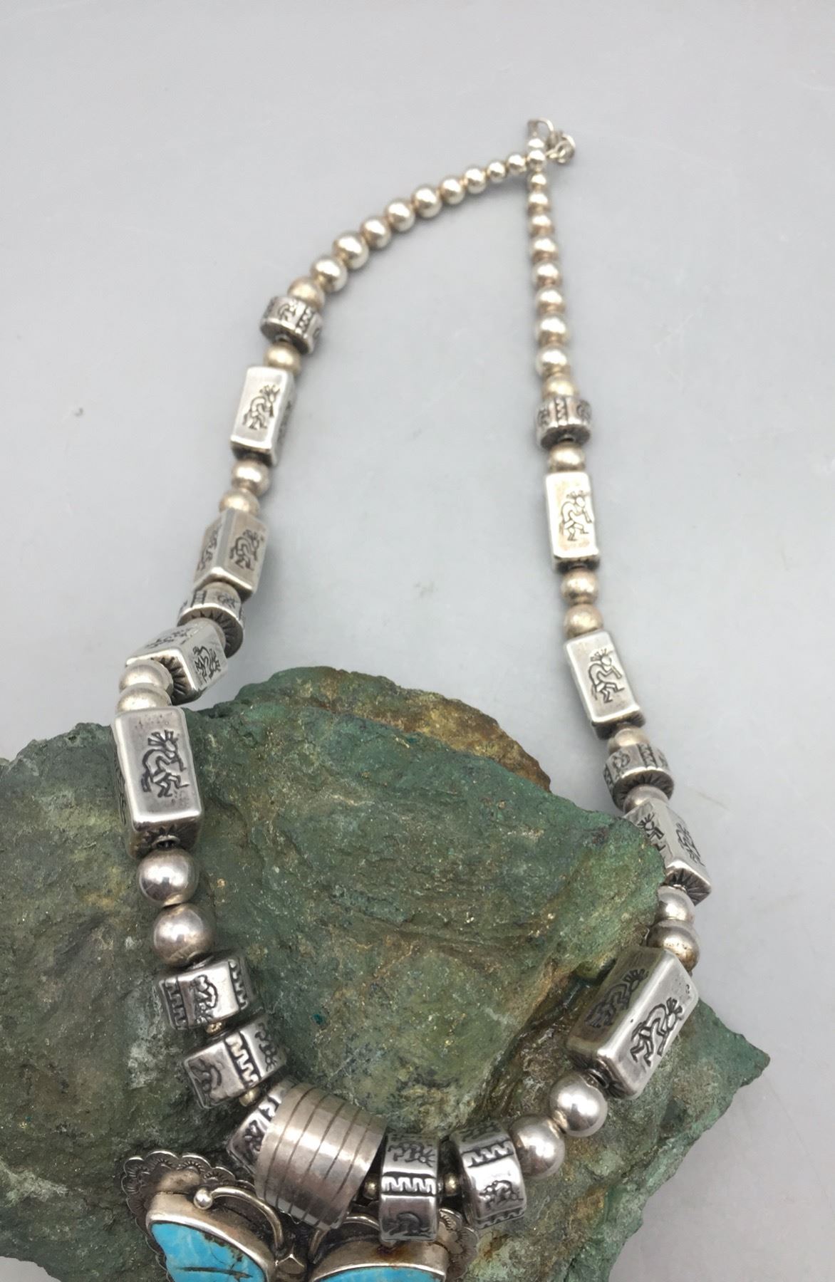 Description: Offered for sale in this lot is a turquoise inlay butterfly necklace, strung with uniquely shaped beads and Kokopelli stamps on some of them. The Butterly is set with carved turquoise with stamping around it. Marked as sterling silver. Maker: Pendant is hallmarked, Dan Dodson. Approx. Age: Modern. Size: Fits a 20 inch neck. Pendant measures 2-1/2 inches long x 2 inches wide. Weighs 63.7 grams. Condition: Good for its age, normal wear expected. Please look closely at the pictures - they are an important part of our description. Shipping: There will be a $5 handling, packaging fee for shipping this lot. The actual cost of postage will be added on top of that.