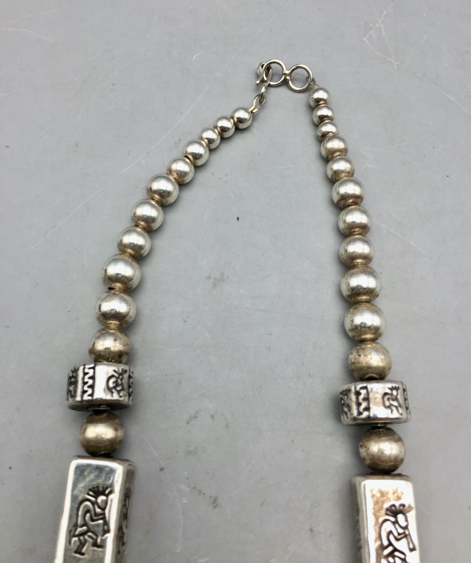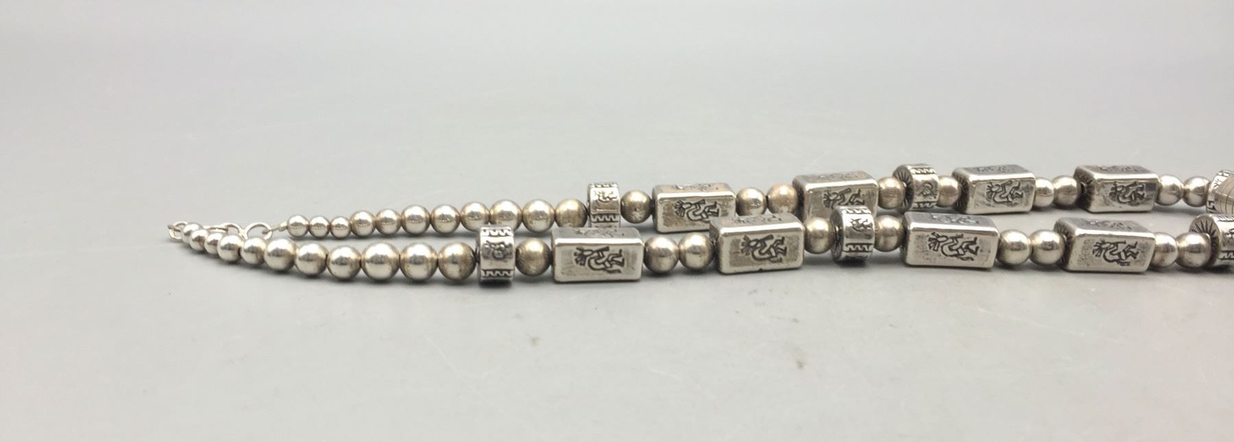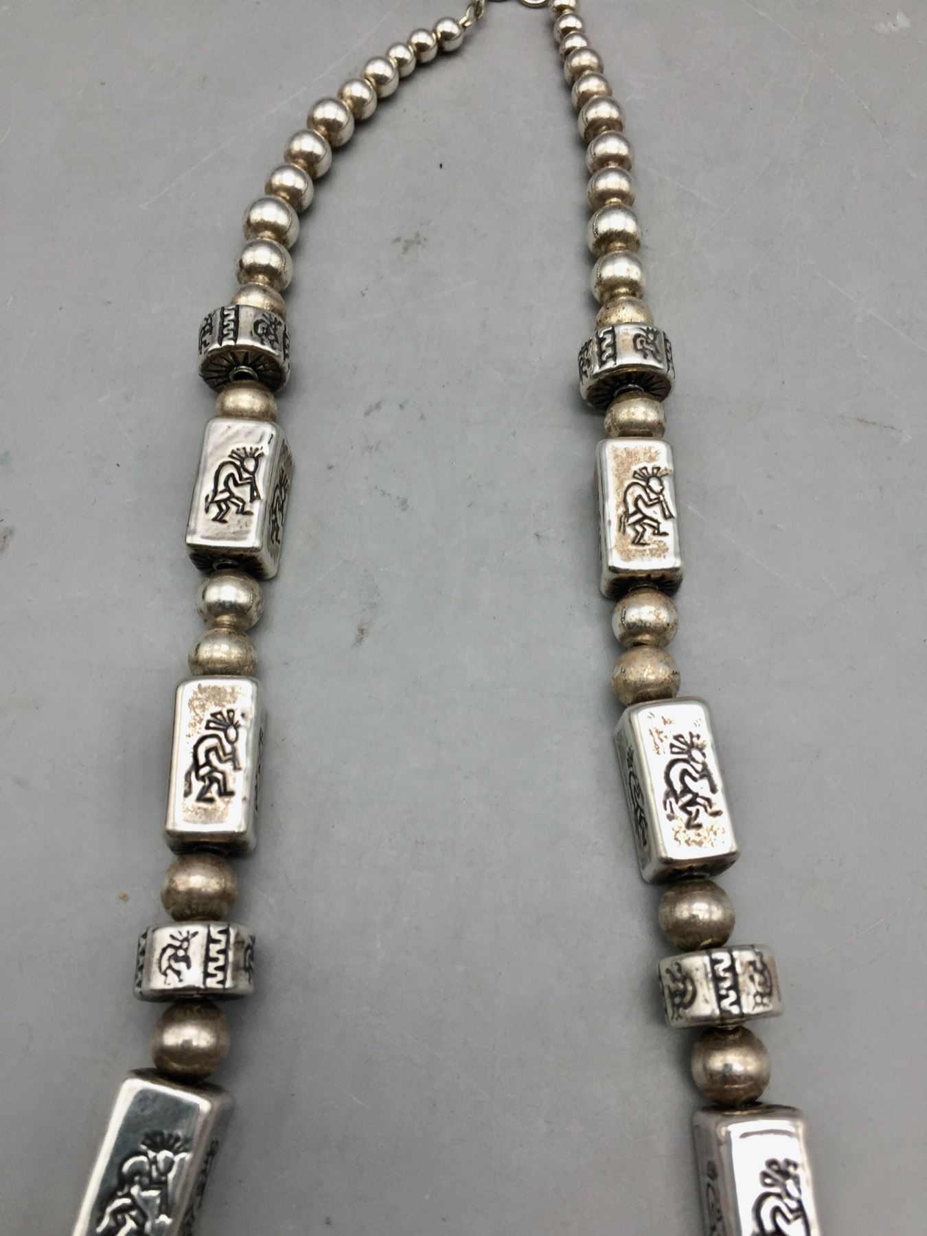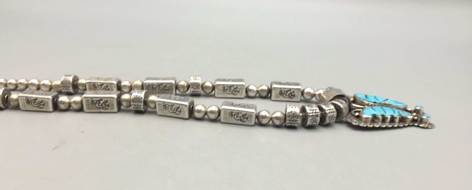 Description: Offered for sale in this lot is a turquoise inlay butterfly necklace, strung with uniquely shaped beads and Kokopelli stamps on some of them. The Butterly is set with carved turquoise with stamping around it. Marked as sterling silver. Maker: Pendant is hallmarked, Dan Dodson. Approx. Age: Modern. Size: Fits a 20 inch neck. Pendant measures 2-1/2 inches long x 2 inches wide. Weighs 63.7 grams. Condition: Good for its age, normal wear expected. Please look closely at the pictures - they are an important part of our description. Shipping: There will be a $5 handling, packaging fee for shipping this lot. The actual cost of postage will be added on top of that.