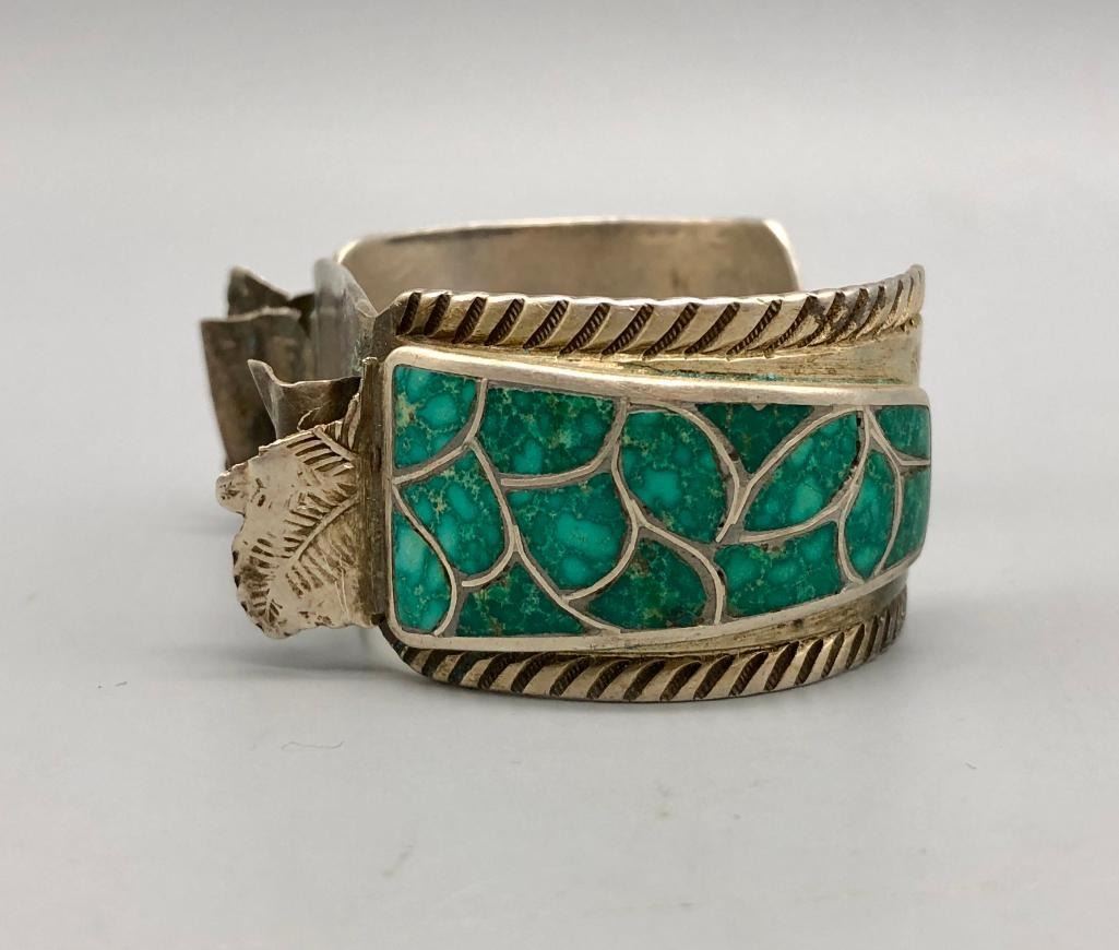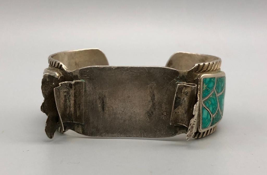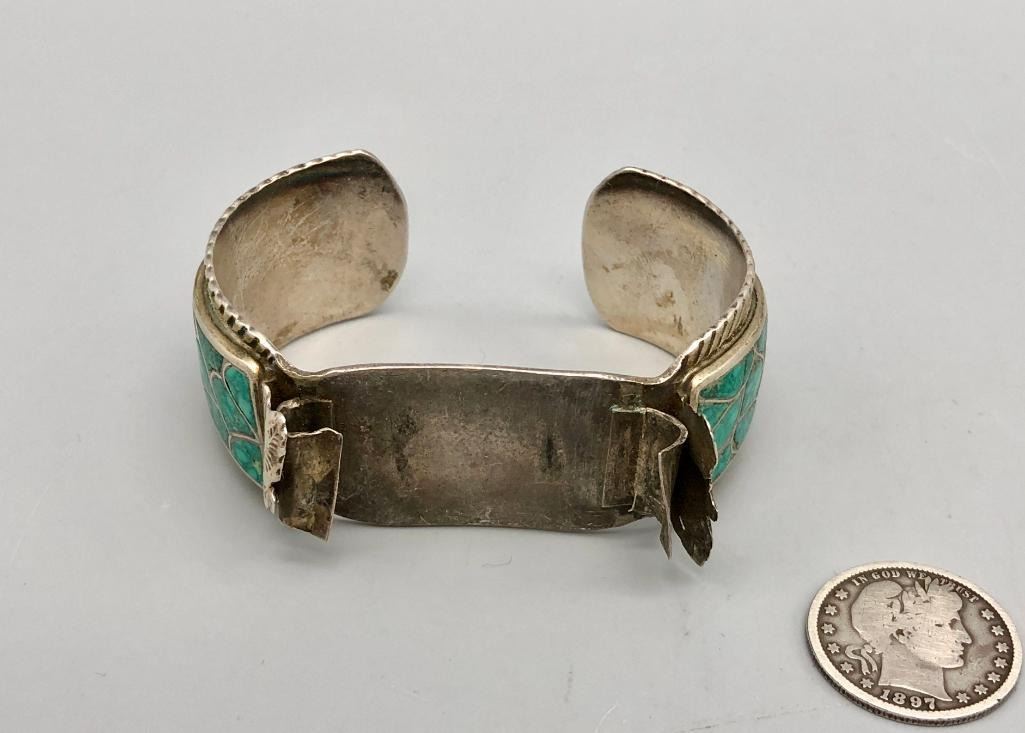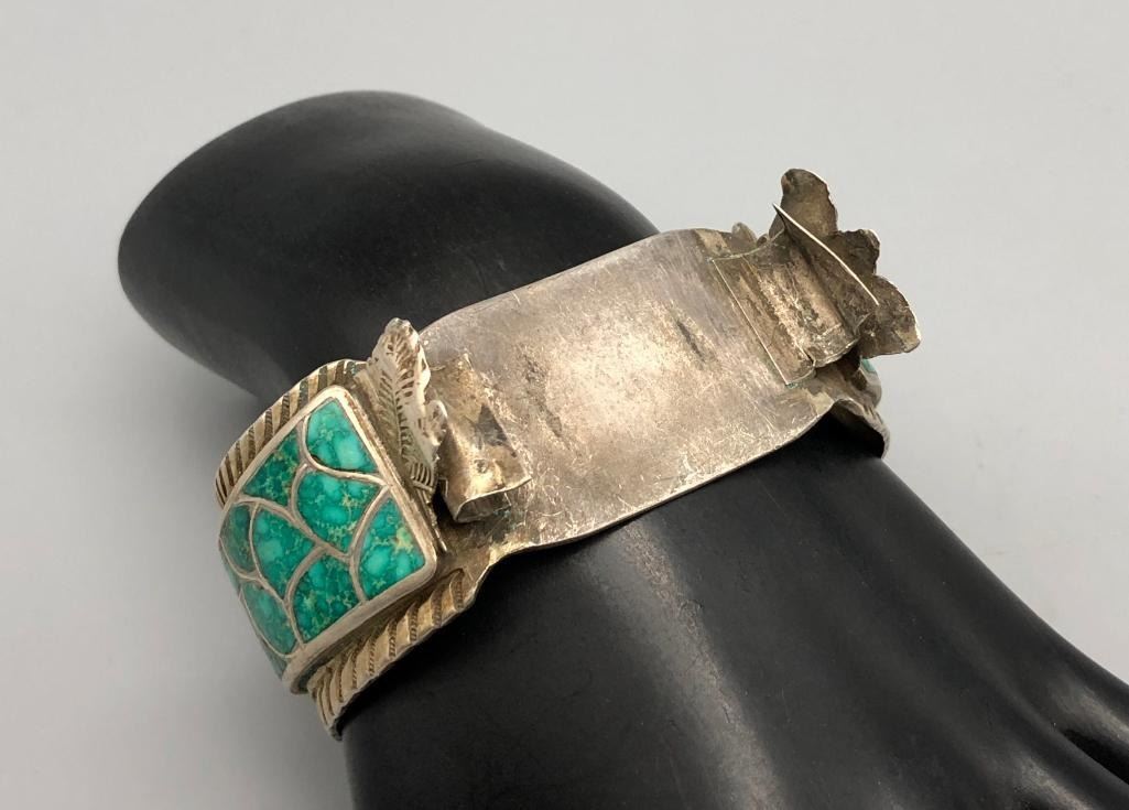 Presented for sale in this lot is a turquoise inlay watch bracelet. This is a great bracelet with lovely turquoise inlay with nice color variation due to the age of the piece. Highlighting it are hand stamped designs on the edges. It is made from sterling silver. MAKER: Unmarked. APPROX AGE: Circa 1970s. SIZE: Inside circumference measures 5-7/8 inches long. Opening is an additional 7/8 inches, fitting a 6-3/4 inch wrist. Width is 1-1/8 inches. Weighs 67.8 grams. CONDITION: Good for its age, normal wear expected. Please look closely at the pictures as they are an important part of our description and are hereby incorporated into the description, specifically with regards to condition. SHIPPING: There will be a $5 handling / packaging fee for shipping this lot. The actual cost of postage will be added on top of that. BUY IT NOW: If you would like to buy this item now, without waiting for the auction day to bid on it, we do offer this option (which is available up to 48 hours before the actual auction starts). The “Buy it Now†price is the high estimate of this lot (plus applicable fees and the Buyer's premium is discounted to 10% when using the Buy it Now option). If you would like to exercise this option, you must contact us by email (or phone as long as you talk to someone live). Reference this lot number and your intention to "Buy it Now."