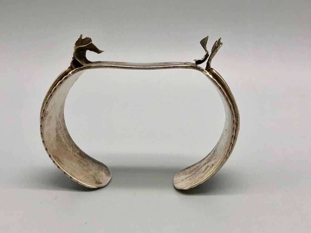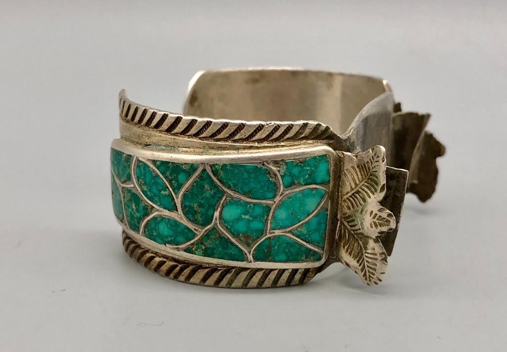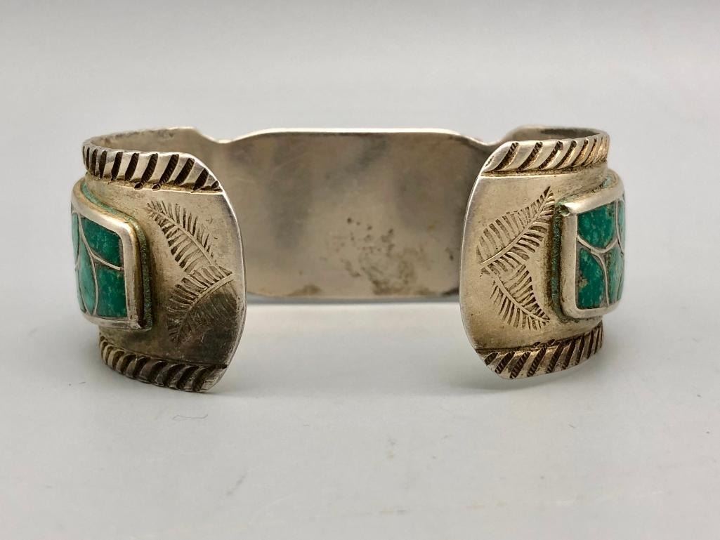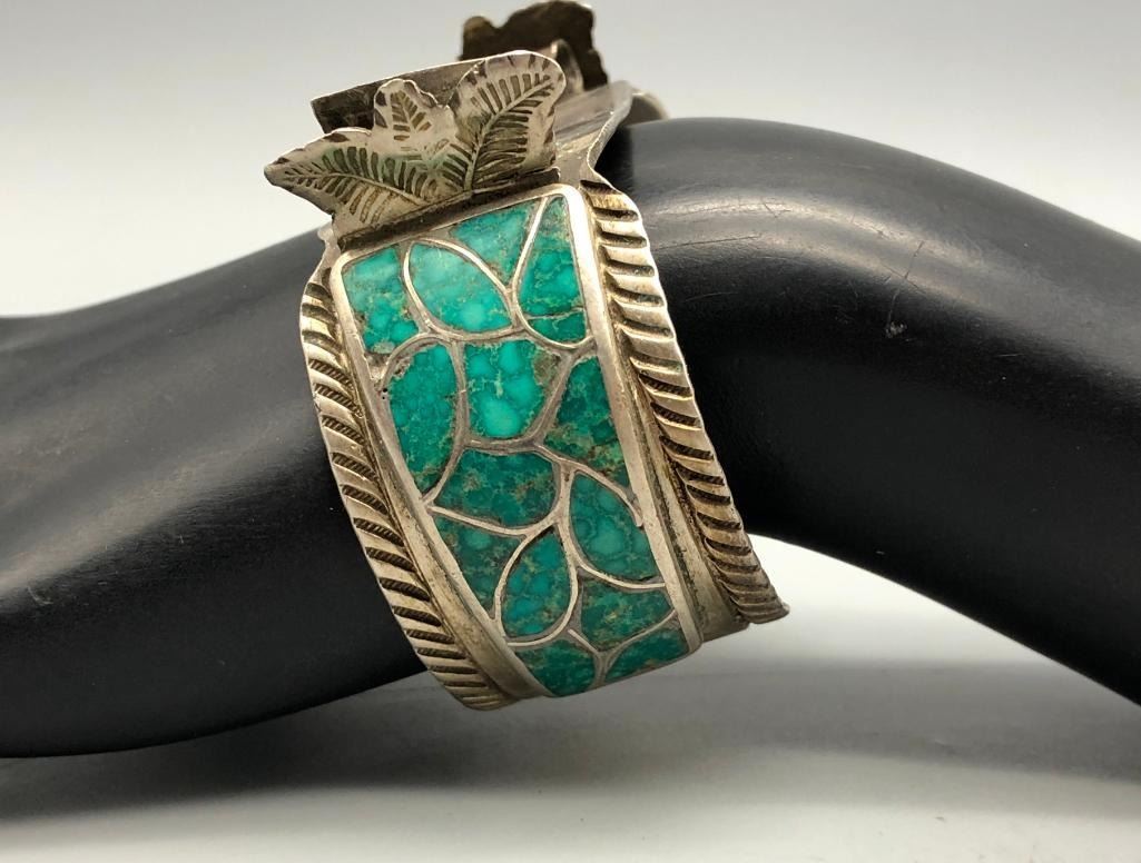 Presented for sale in this lot is a turquoise inlay watch bracelet. This is a great bracelet with lovely turquoise inlay with nice color variation due to the age of the piece. Highlighting it are hand stamped designs on the edges. It is made from sterling silver. MAKER: Unmarked. APPROX AGE: Circa 1970s. SIZE: Inside circumference measures 5-7/8 inches long. Opening is an additional 7/8 inches, fitting a 6-3/4 inch wrist. Width is 1-1/8 inches. Weighs 67.8 grams. CONDITION: Good for its age, normal wear expected. Please look closely at the pictures as they are an important part of our description and are hereby incorporated into the description, specifically with regards to condition. SHIPPING: There will be a $5 handling / packaging fee for shipping this lot. The actual cost of postage will be added on top of that. BUY IT NOW: If you would like to buy this item now, without waiting for the auction day to bid on it, we do offer this option (which is available up to 48 hours before the actual auction starts). The “Buy it Now†price is the high estimate of this lot (plus applicable fees and the Buyer's premium is discounted to 10% when using the Buy it Now option). If you would like to exercise this option, you must contact us by email (or phone as long as you talk to someone live). Reference this lot number and your intention to "Buy it Now."