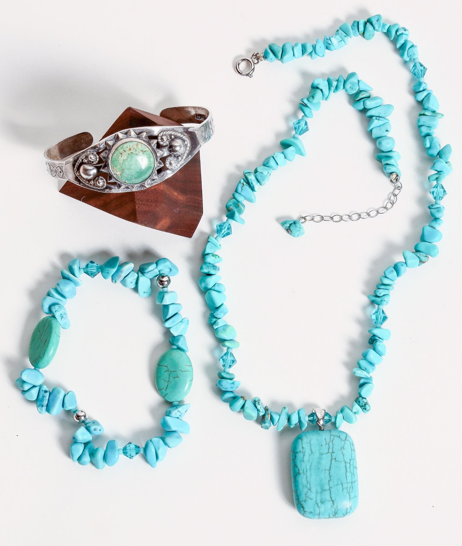 Turquoise stone necklace and matching stone bracelet. Approximately 18" with small turquoise stones. Green turquoise and silver bracelet, unsigned. 2" wide. Frank Lewton Collection 1970's. [] [] [] [] []