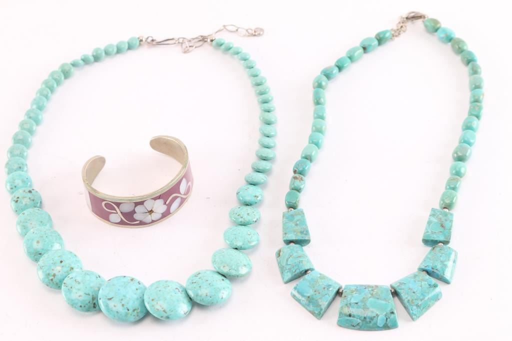 Two stabilized turquoise beaded necklaces and an Alpaca, Mexico inlaid floral cuff.