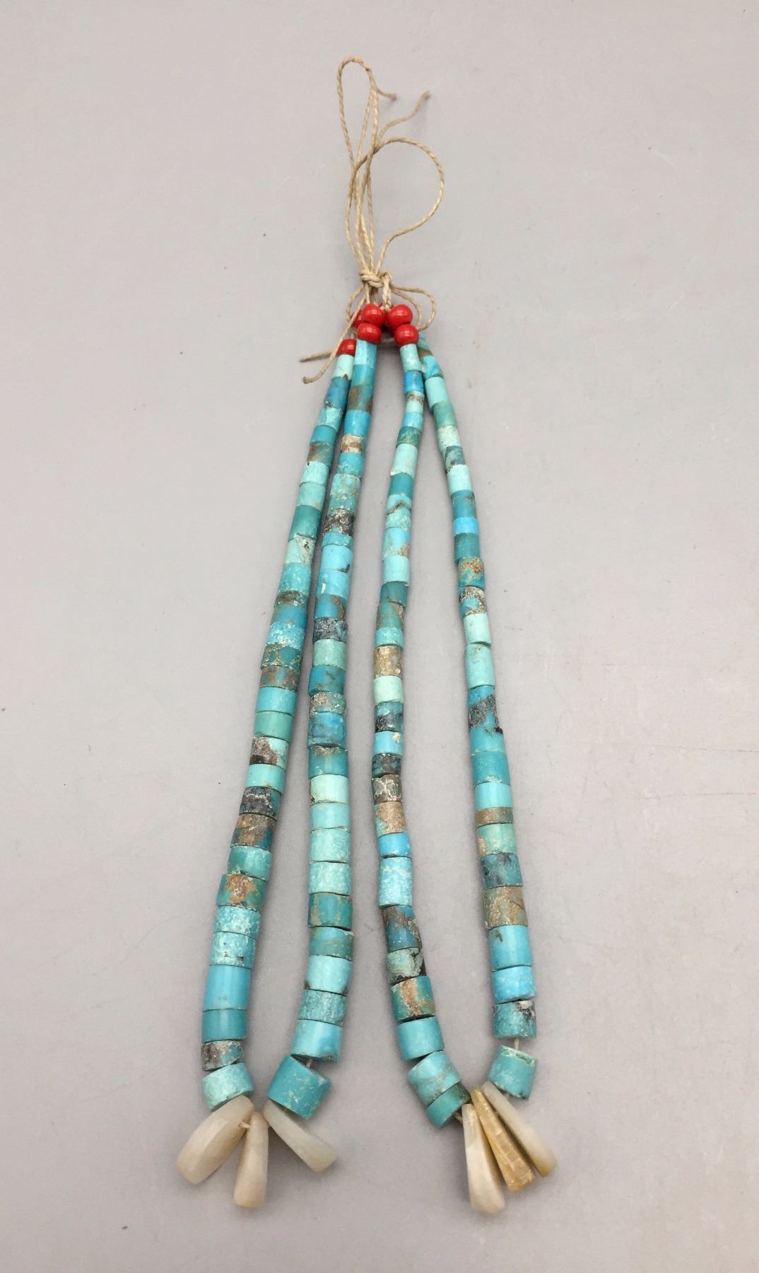 Description: Pair of joclas with turquoise and coral on nylon string. Maker: Unknown. Approx. Age: Vintage. Size: 6” long and weighs 30.9 g. Condition: Good for their age, normal wear expected. Please look closely at the pictures - they are an important part of our description. Shipping: There will be a $5 handling / packaging fee for shipping this lot. The actual cost of postage will be added on top of that.