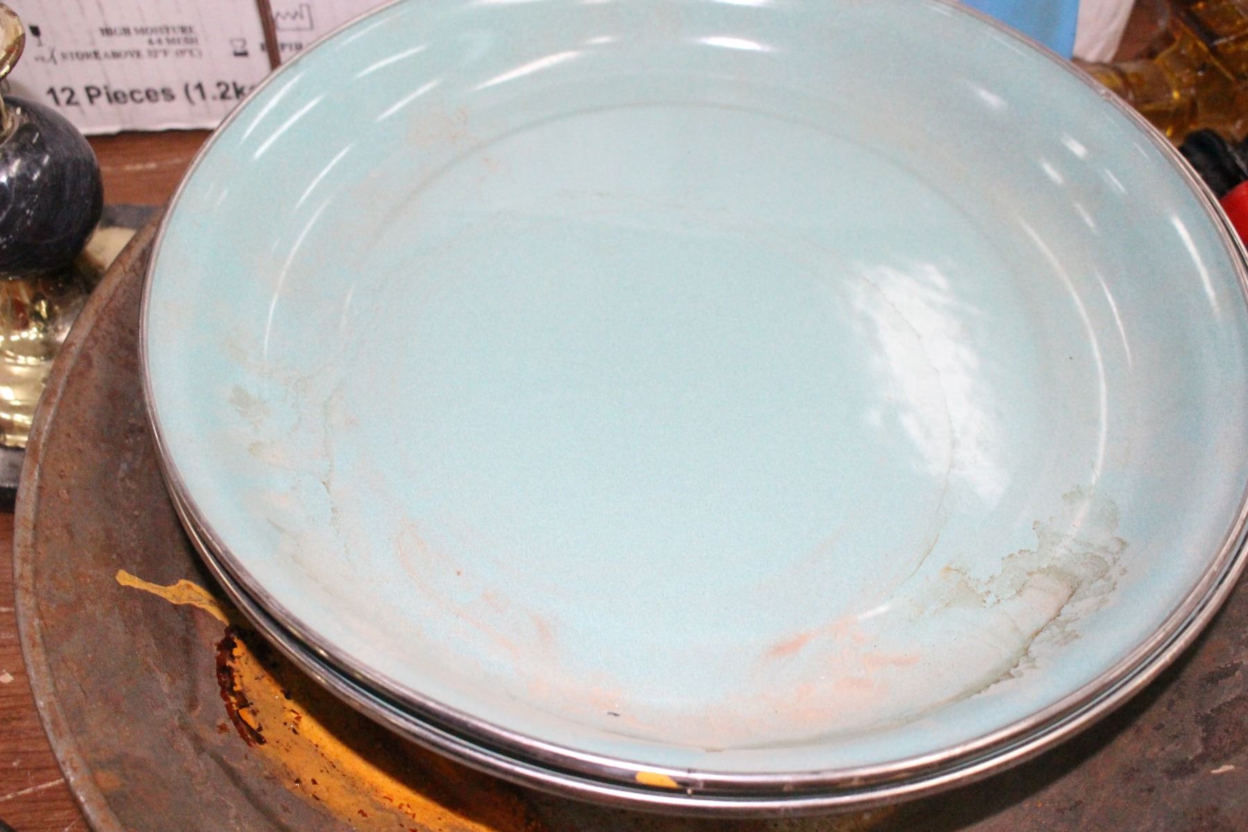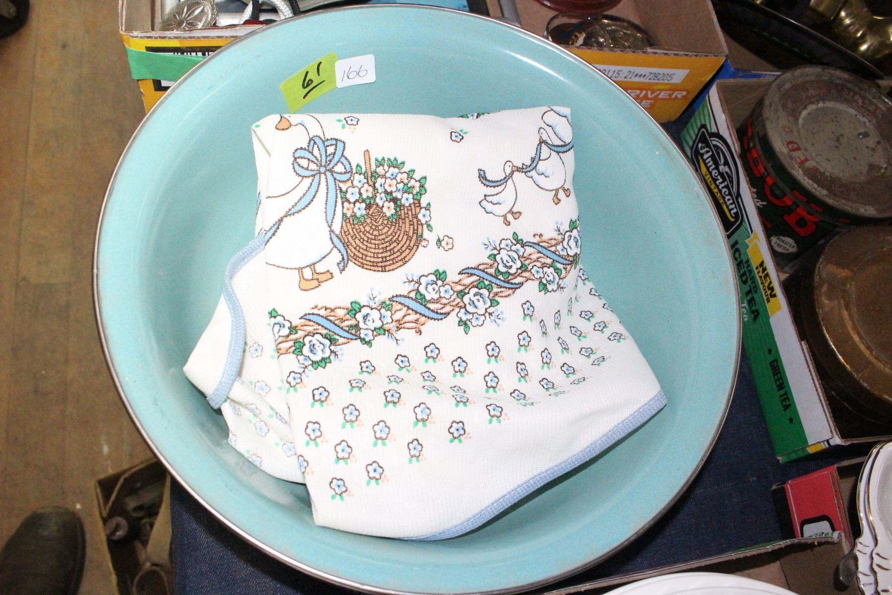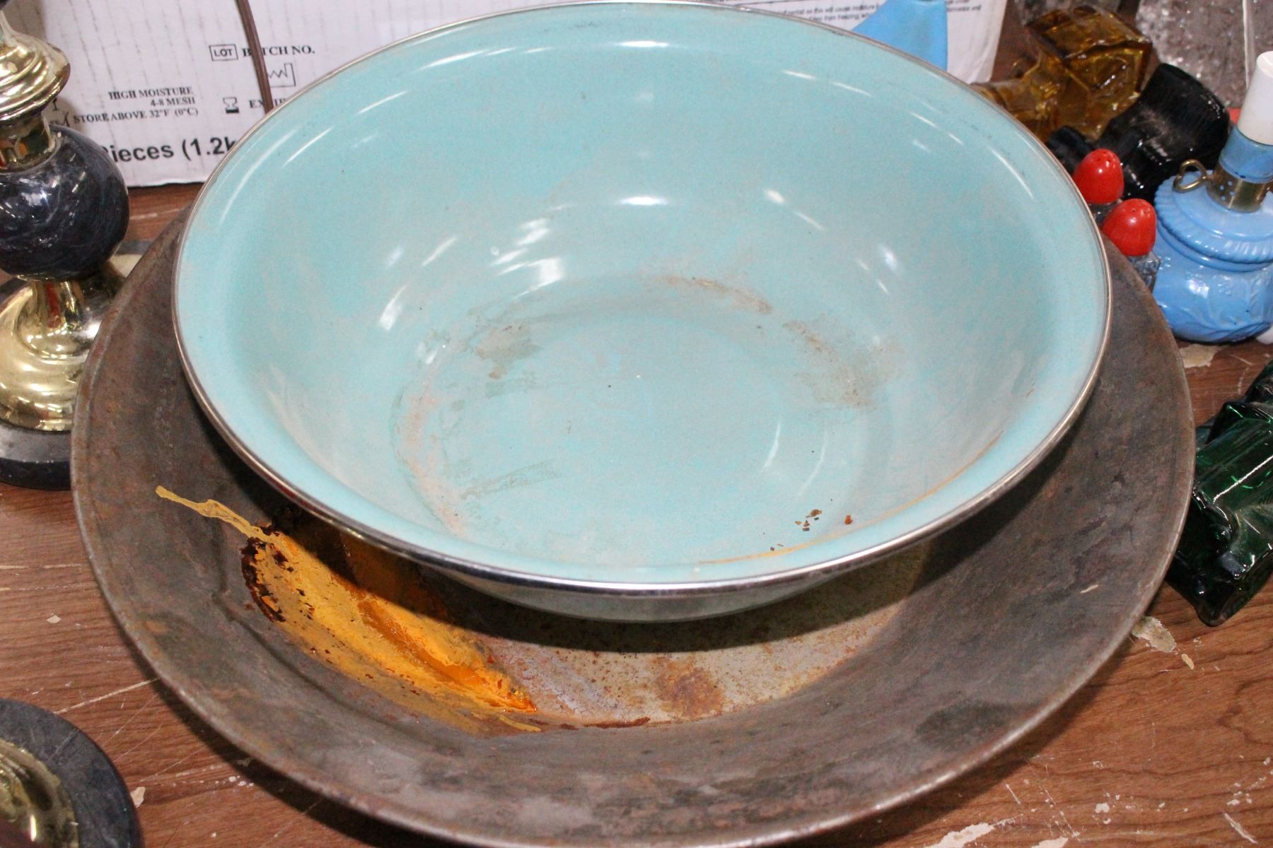 Turquoise Metal Bowl and Platter with a Blue Table Cloth