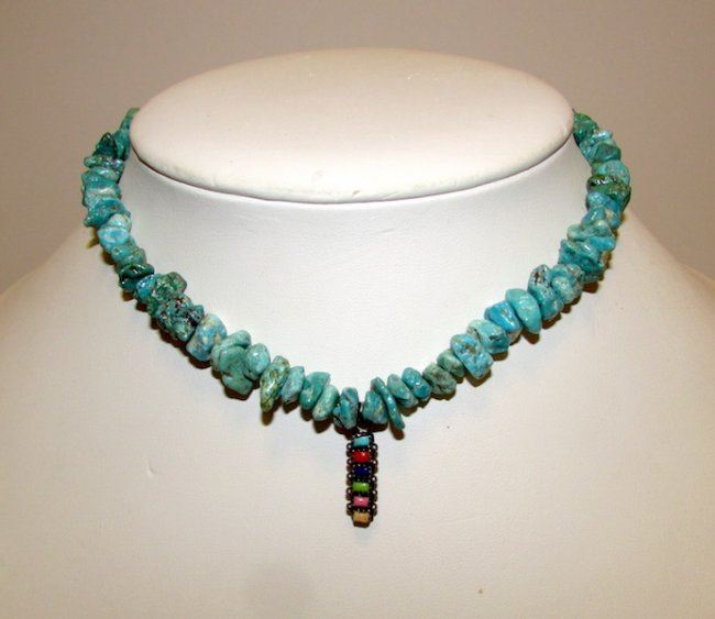 Wonderful turquoise choker necklace with sterling silver and semi precious stones pendant. The pendant features coral, lapis, turquoise, etc. Pendant is marked and tested silver
