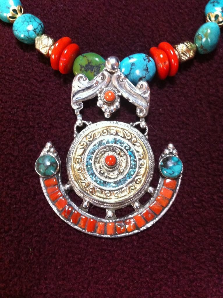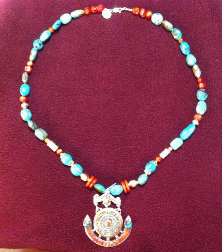 This beautiful necklace measures 30" long with large turquoise and red stones. The pendant resembles an aztec design, this pendant measures 2 1/2" x 3 1/4".
