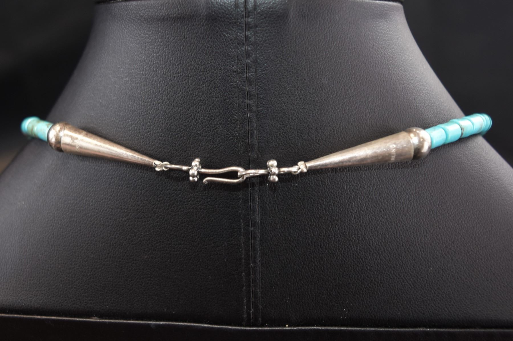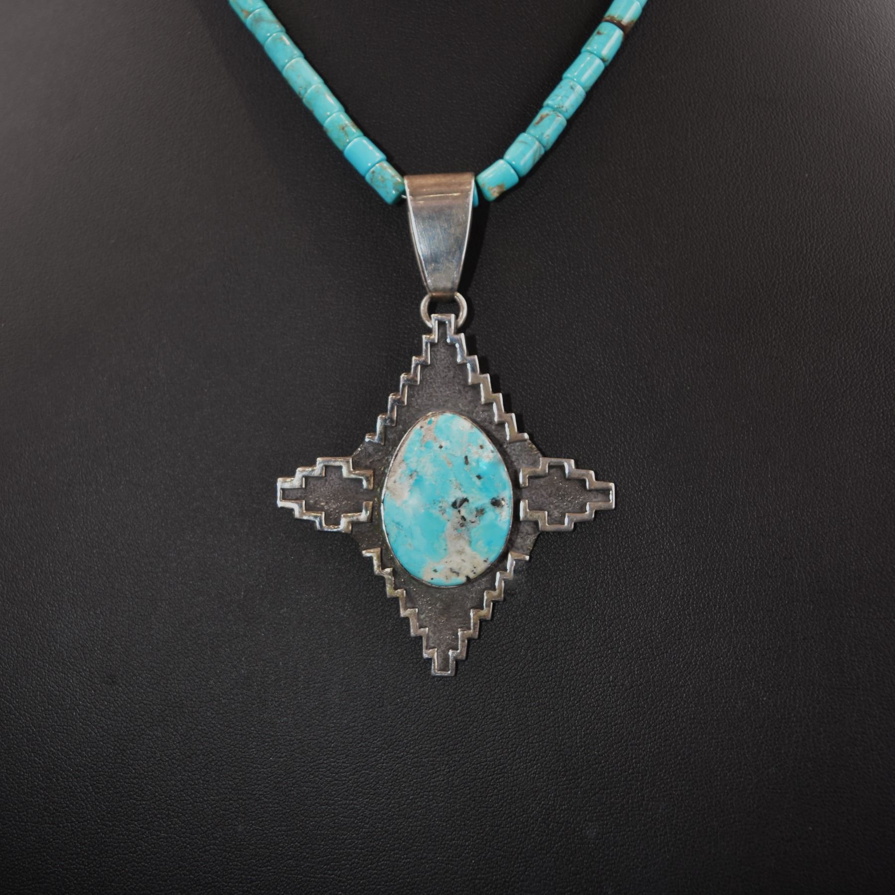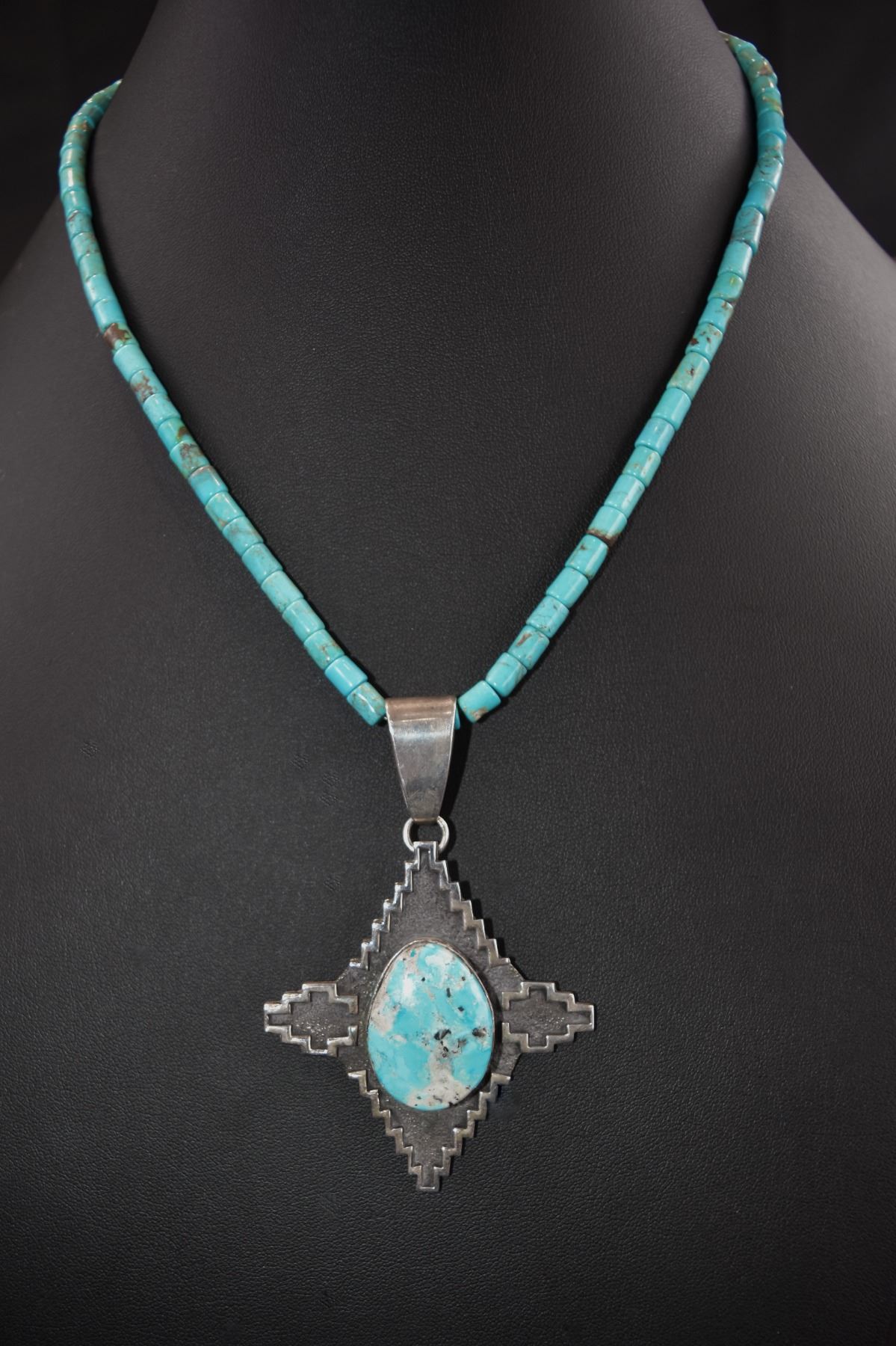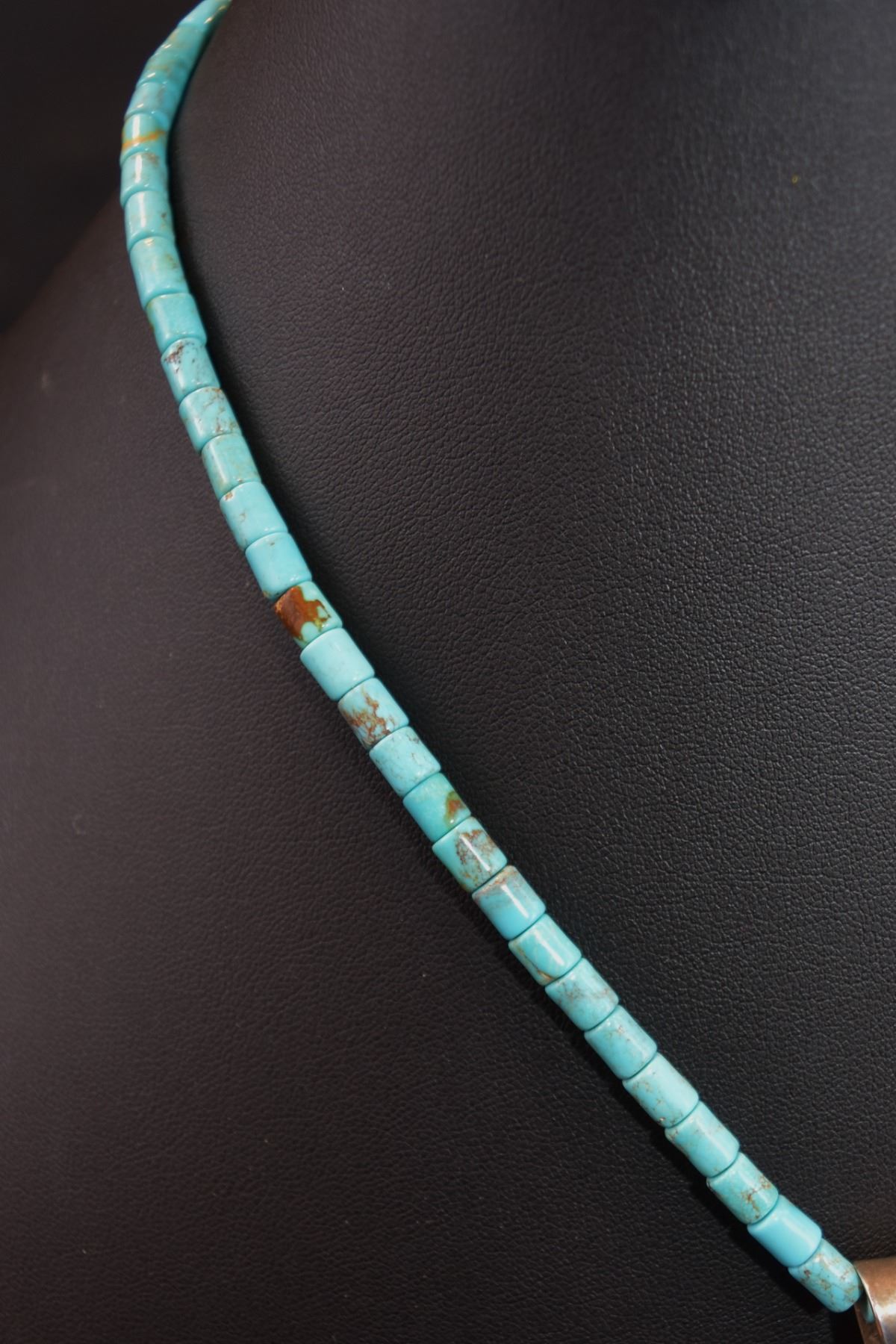 Award-winning Navajo jeweler Tommy Jackson featuring 3/8" heishi turquoise beads and a tufacast pendant with fine oval turquoise; 20" Length, Pendant 3 3/8 x 2 1/4", 48 grams