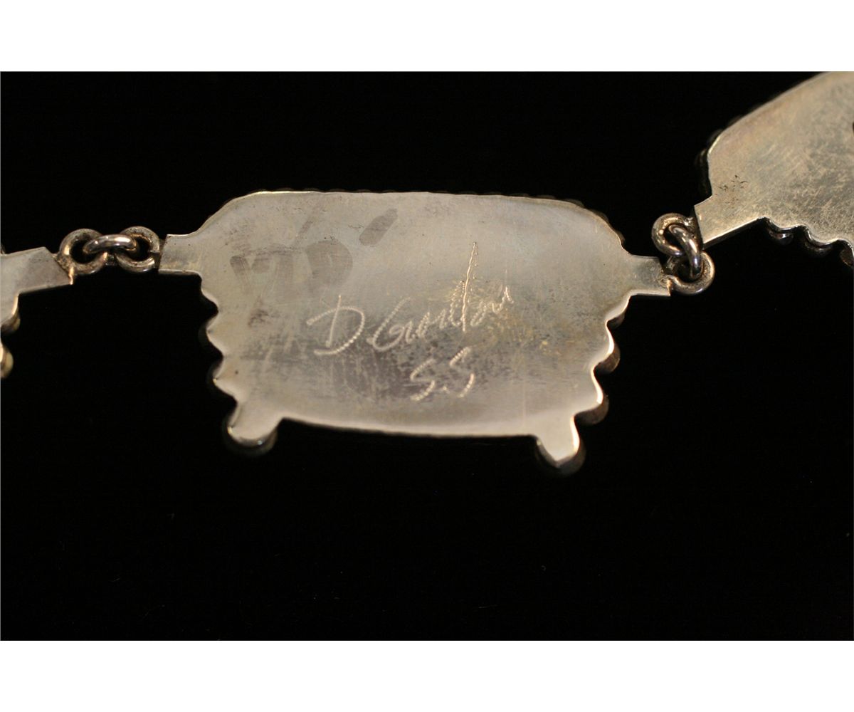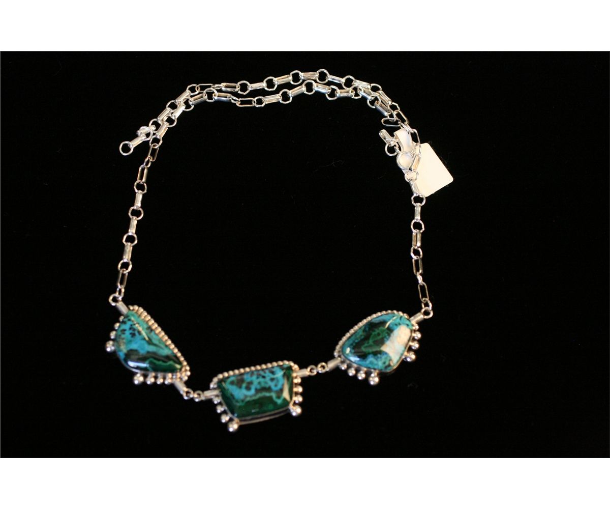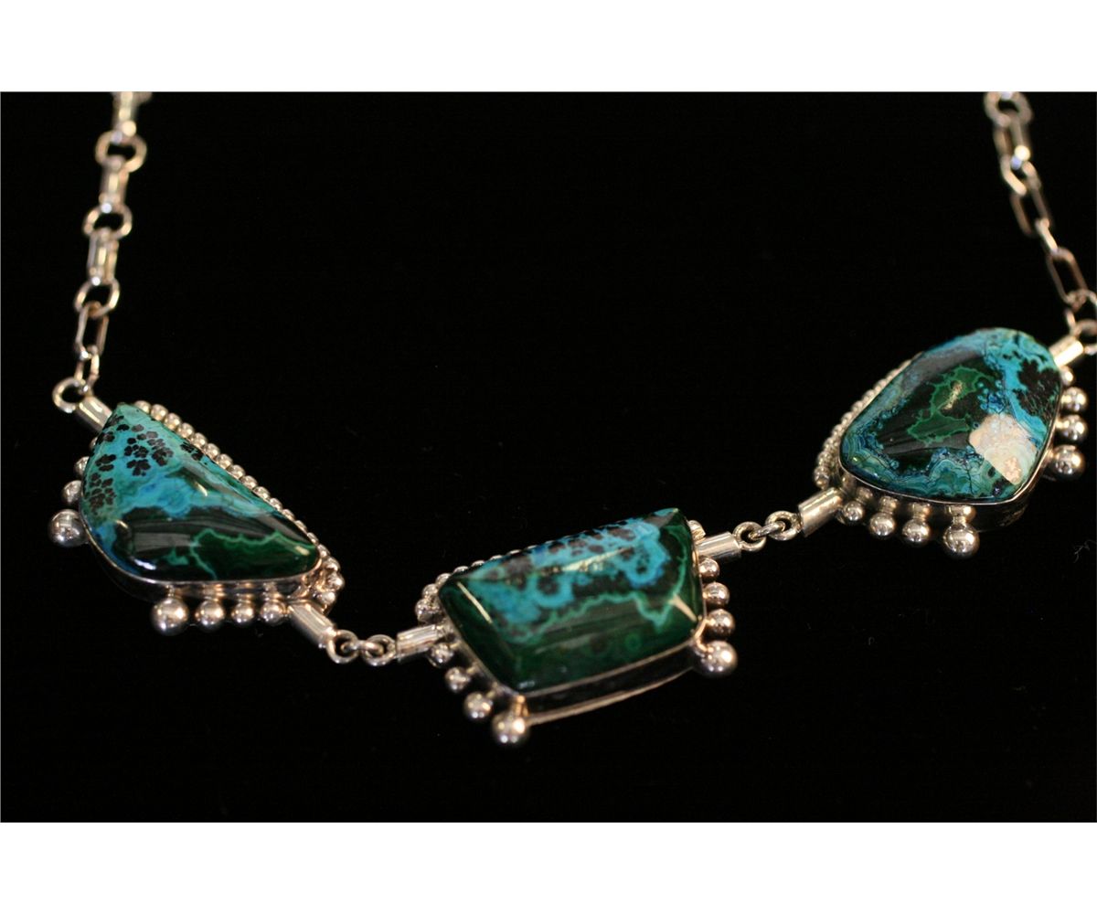 Turquoise Necklace, With handmade chain, Three silver mounted turquoise cabochons, Signed "D. Grodin", 19" Long, Stones 1" x 3/4", 530002-