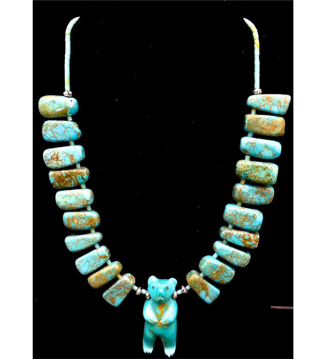 An 18" Turquoise block necklace with a carved bear pendant and heishi beads.