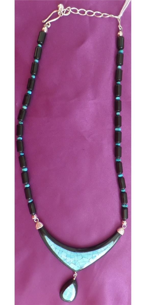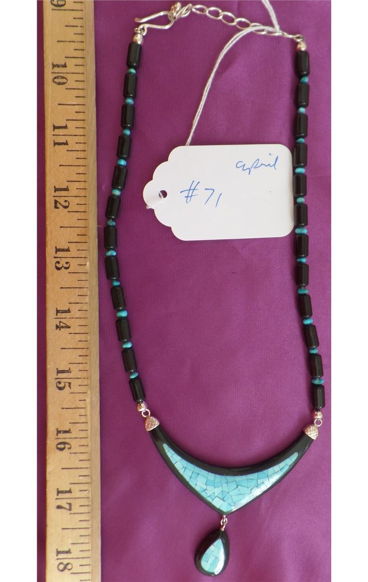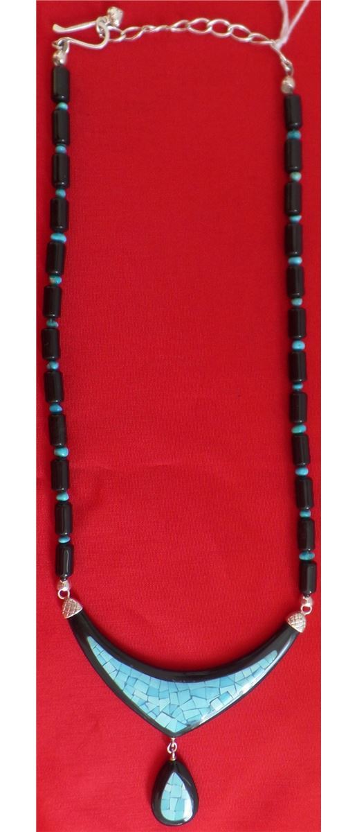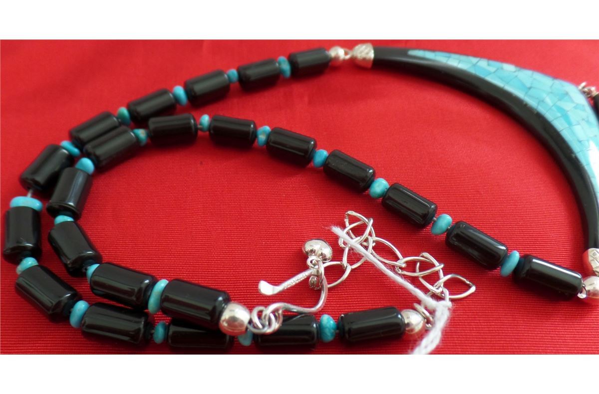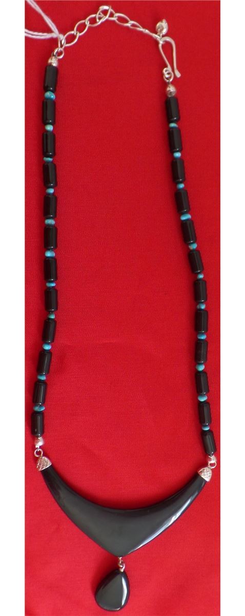 1970s Turquoise Necklace with silver and black glass. Measures 22" long, pendant is 3" x 2". Navajo. Has small heart on clasp. Condition: Fine. Shipping: $14.
