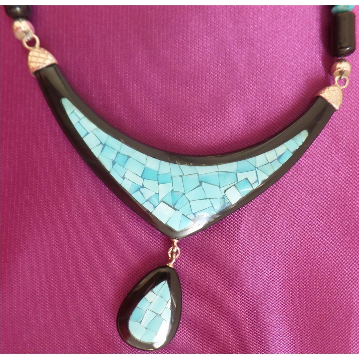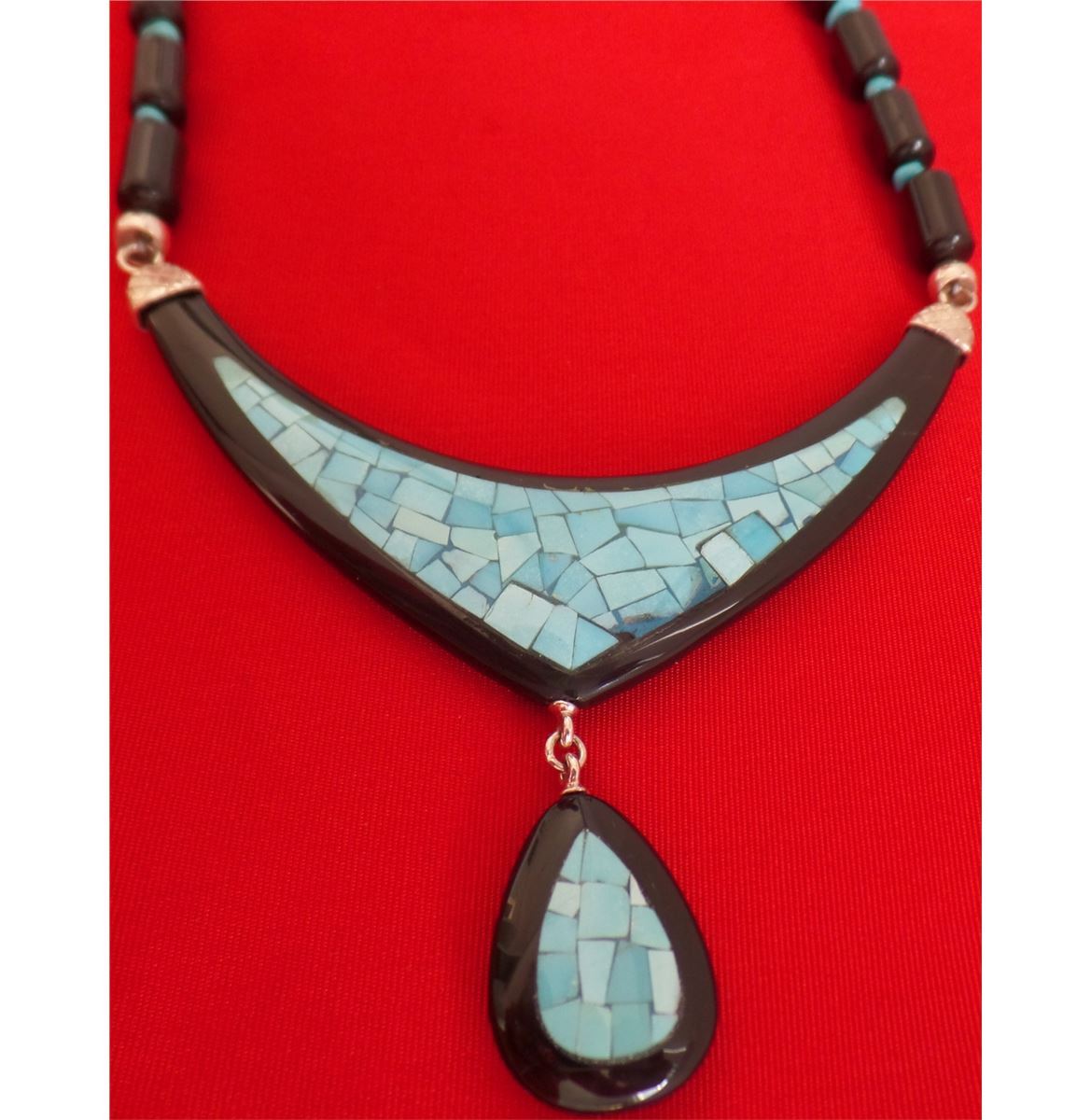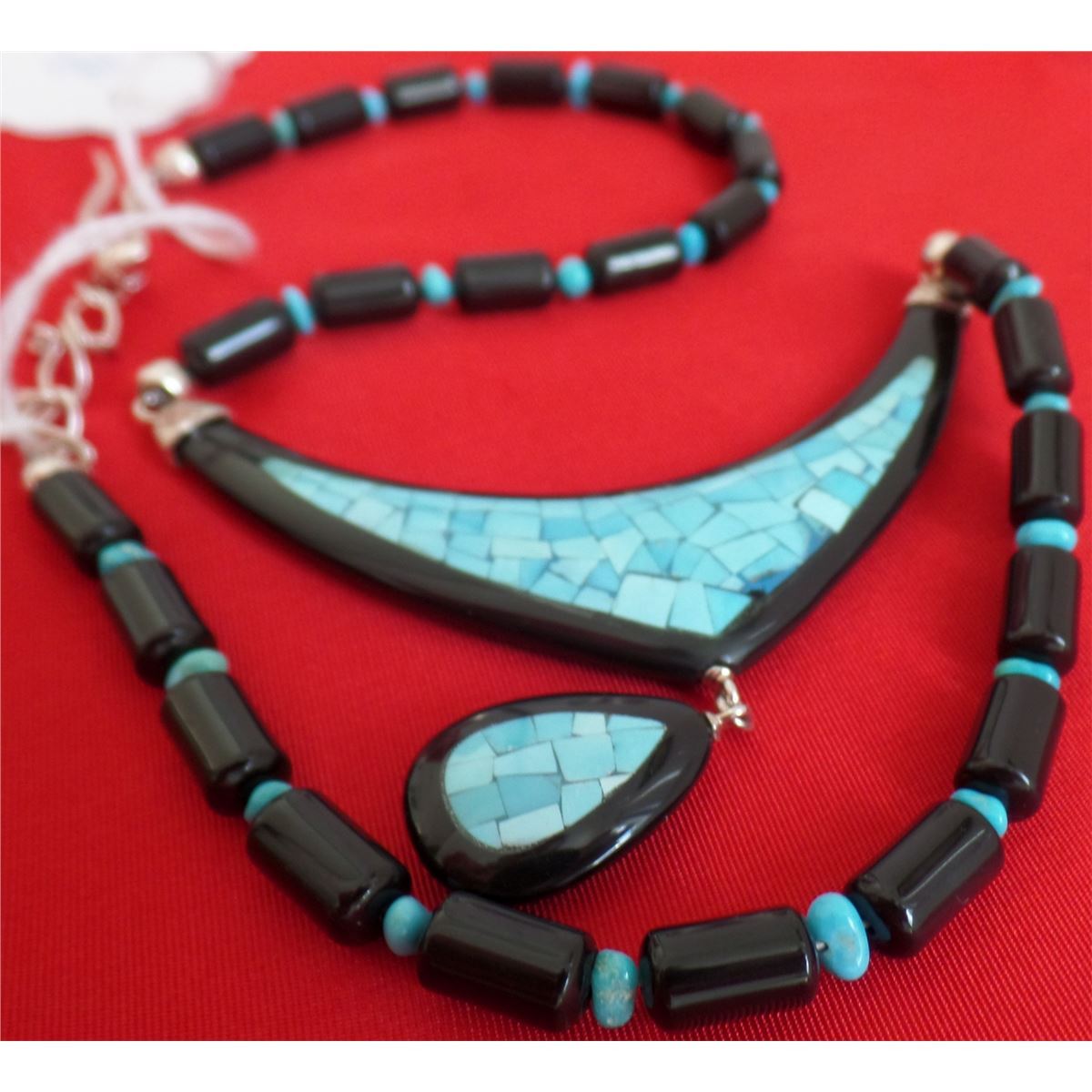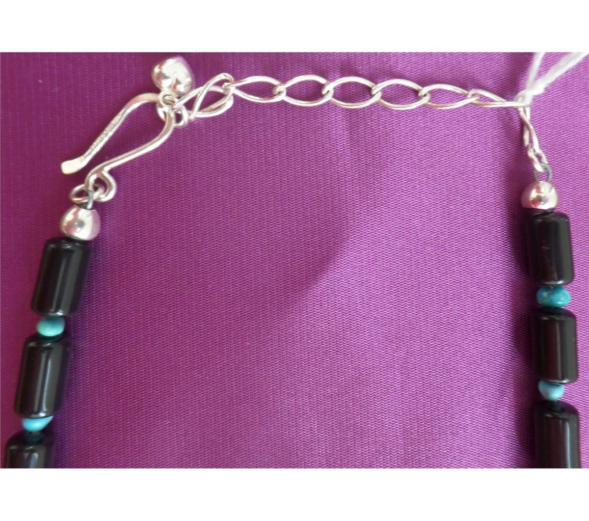 1970s Turquoise Necklace with silver and black glass. Measures 22" long, pendant is 3" x 2". Navajo. Has small heart on clasp. Condition: Fine. Shipping: $14.