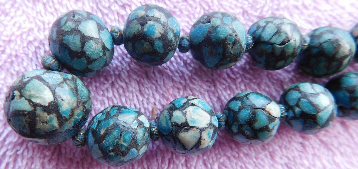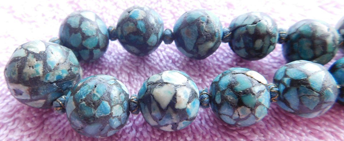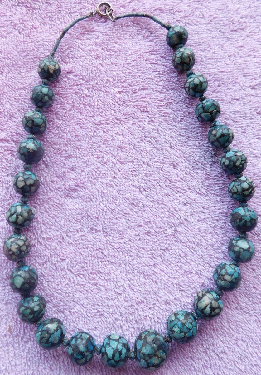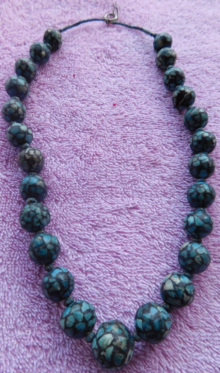 Turquoise Necklace, circa 1940s. Made of turquoise and silver, the item is 16" long, beads being approx. 0.5" to 1.25". Tibet. Old necklace from a San Diego estate. Condition: Clasp is damaged, see images. Shipping: $15.50 w/insurance and signature.